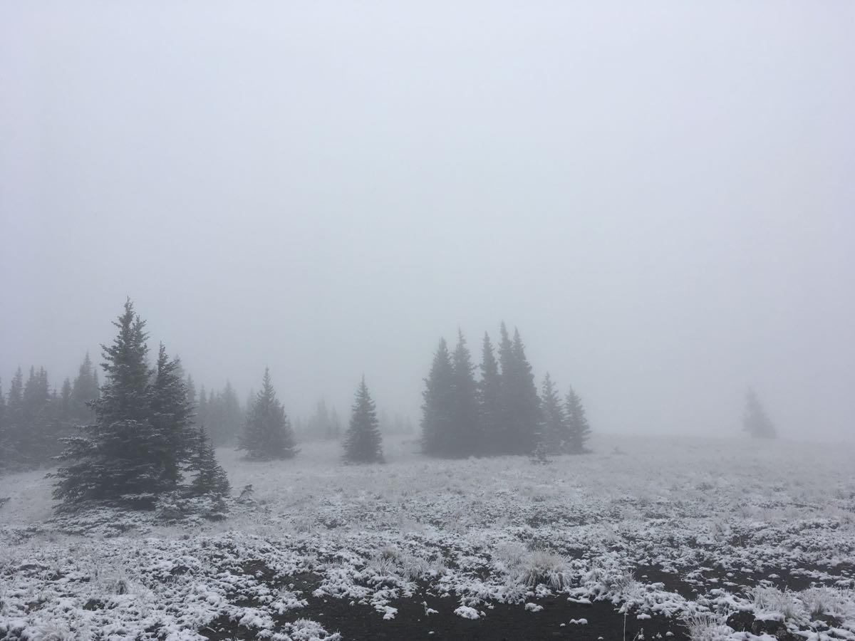 I was out today guiding Western Island College (WIC) students with the U of C Outdoor Centre. The Powderface Ridge Trail was extremely slick with snow covered roots and rocks. As you can see by the attached photo, the view was non-existent, and for a ridge hike that’s a total disappointment. Wait until things warm-up/clear-up before heading out to hike around the Elbow Valley.