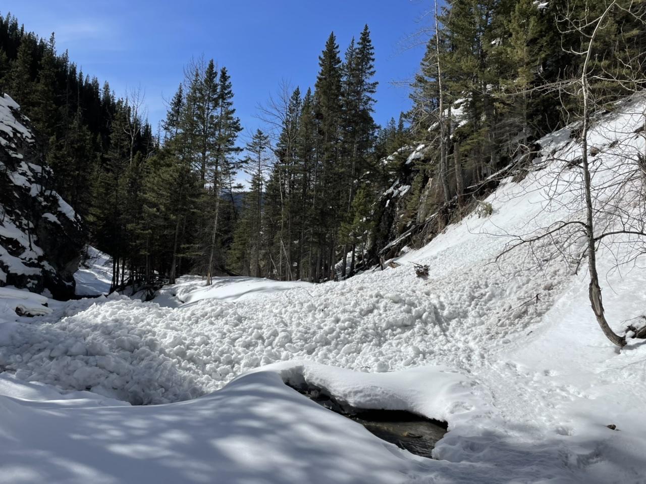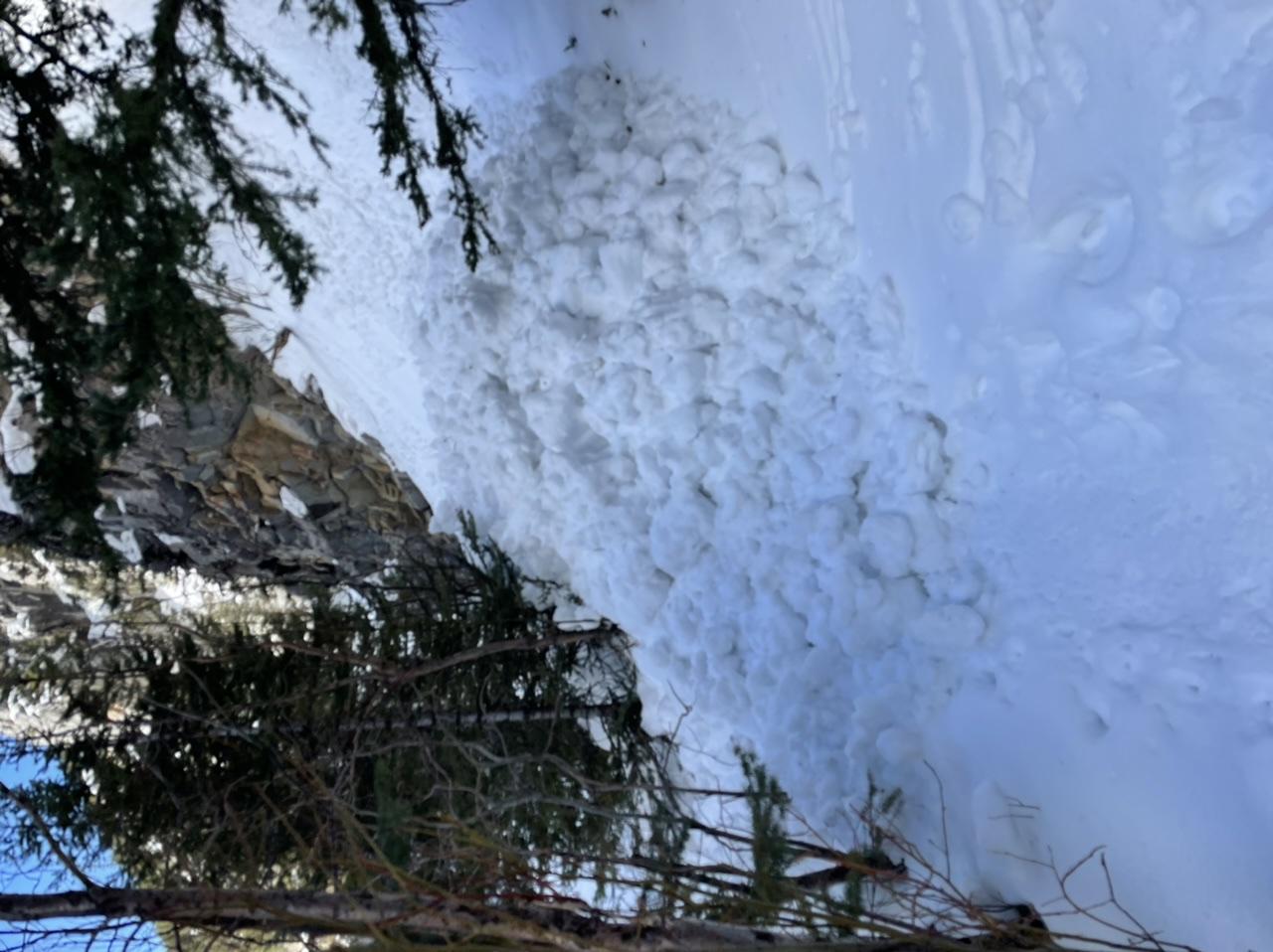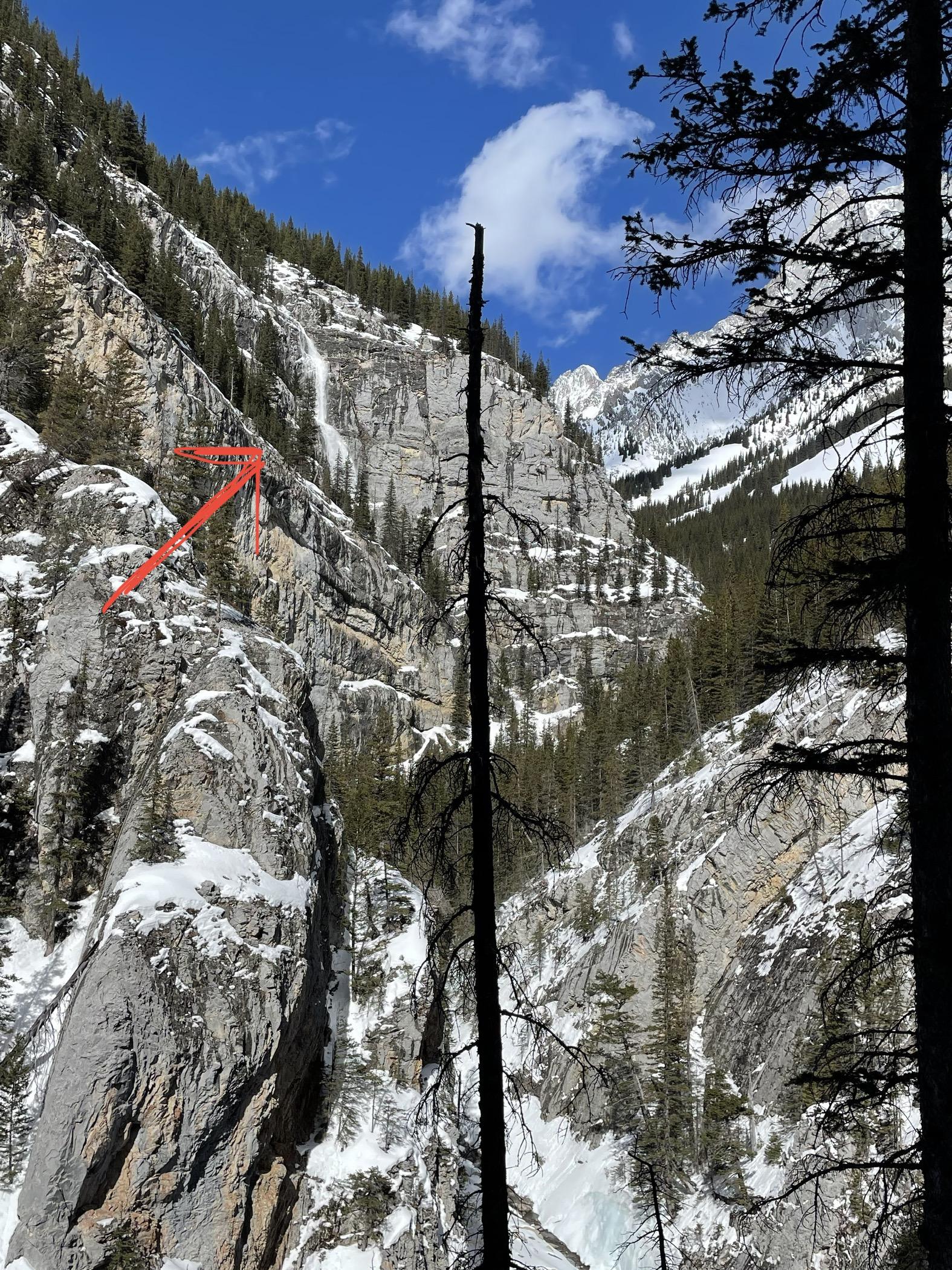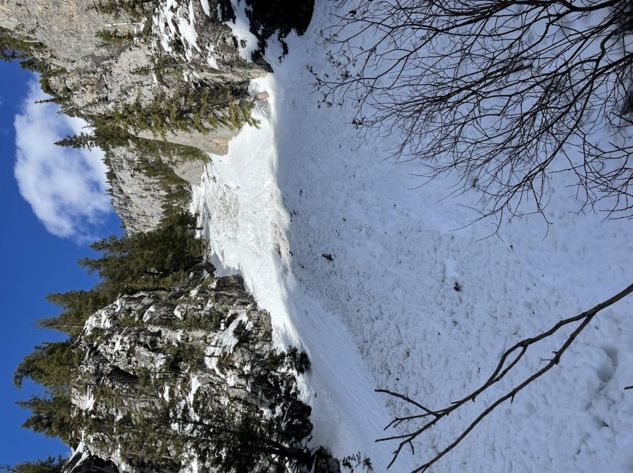 -Just after 2pm while climbing above the far left gully ice route we witnessed an estimated size 2 loose wet avalanche roll over the cliffs further up the creek. See pic (we missed capturing the main blast).