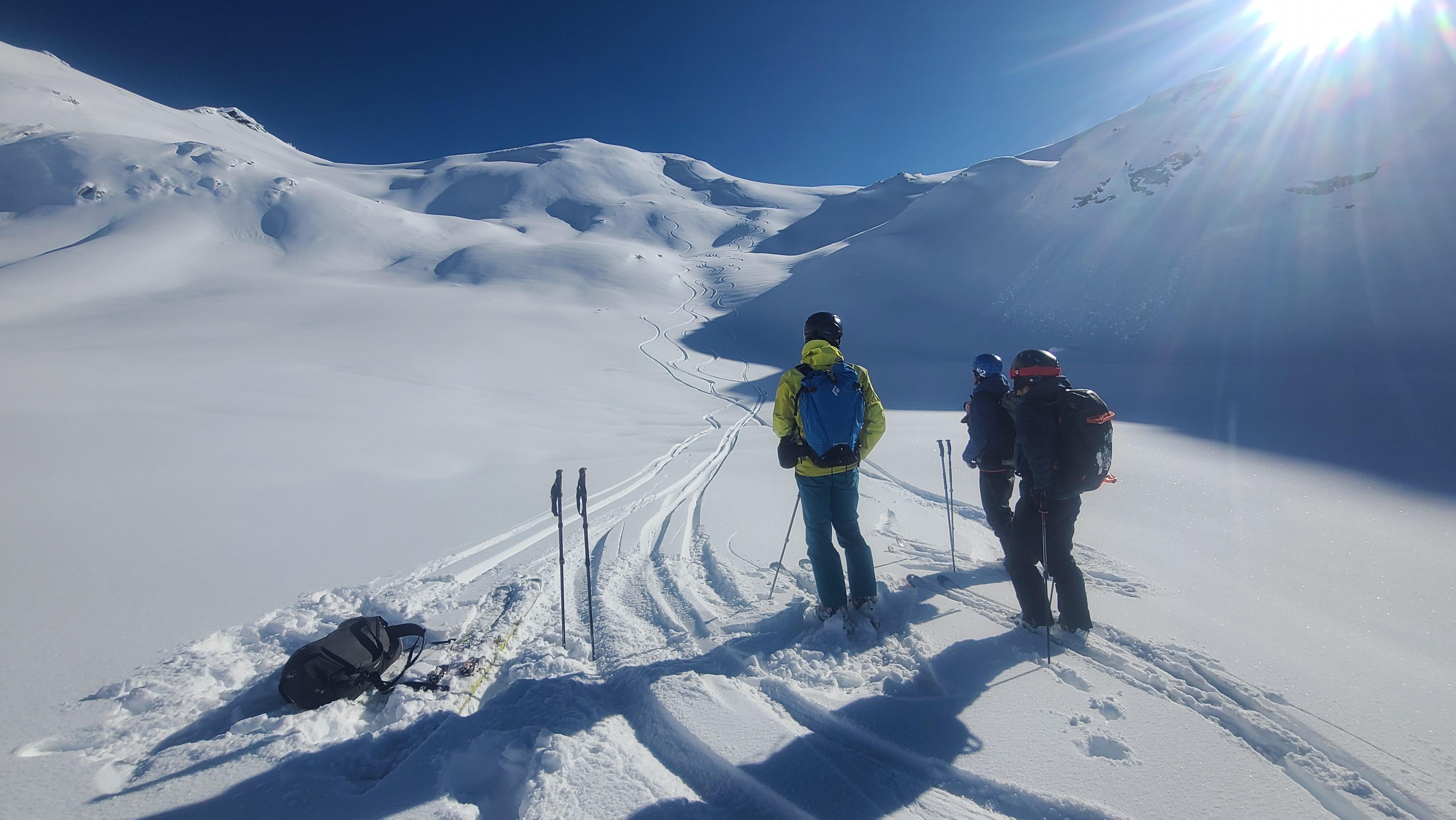 Our route left the clear cut just south of where the teepee material is stashed. Snow there in the trees was thin (30cm deep) and tricky to skin. At the bottom of tree line there was at least 1m of depth. At 1650m it was 1.5m.