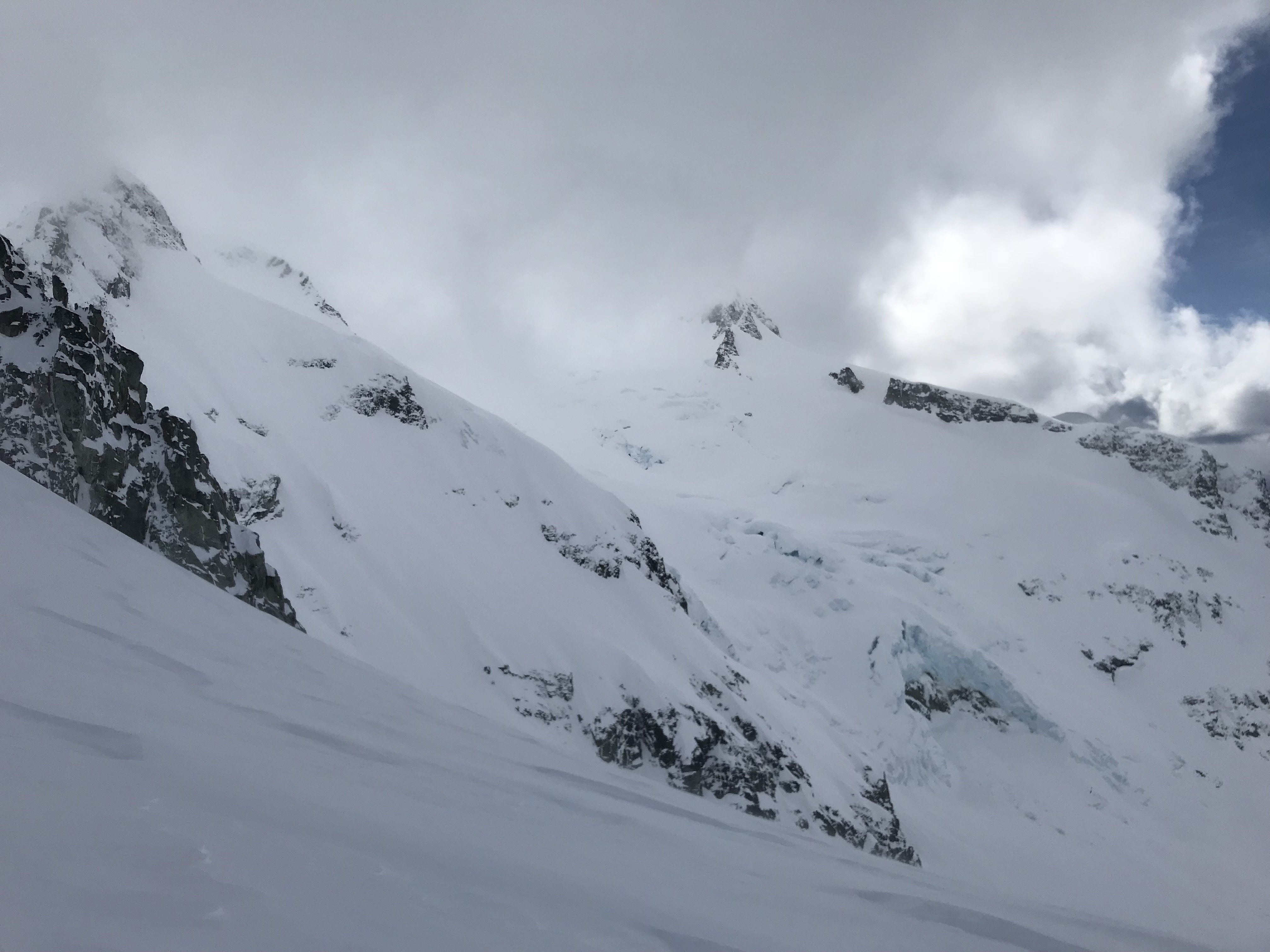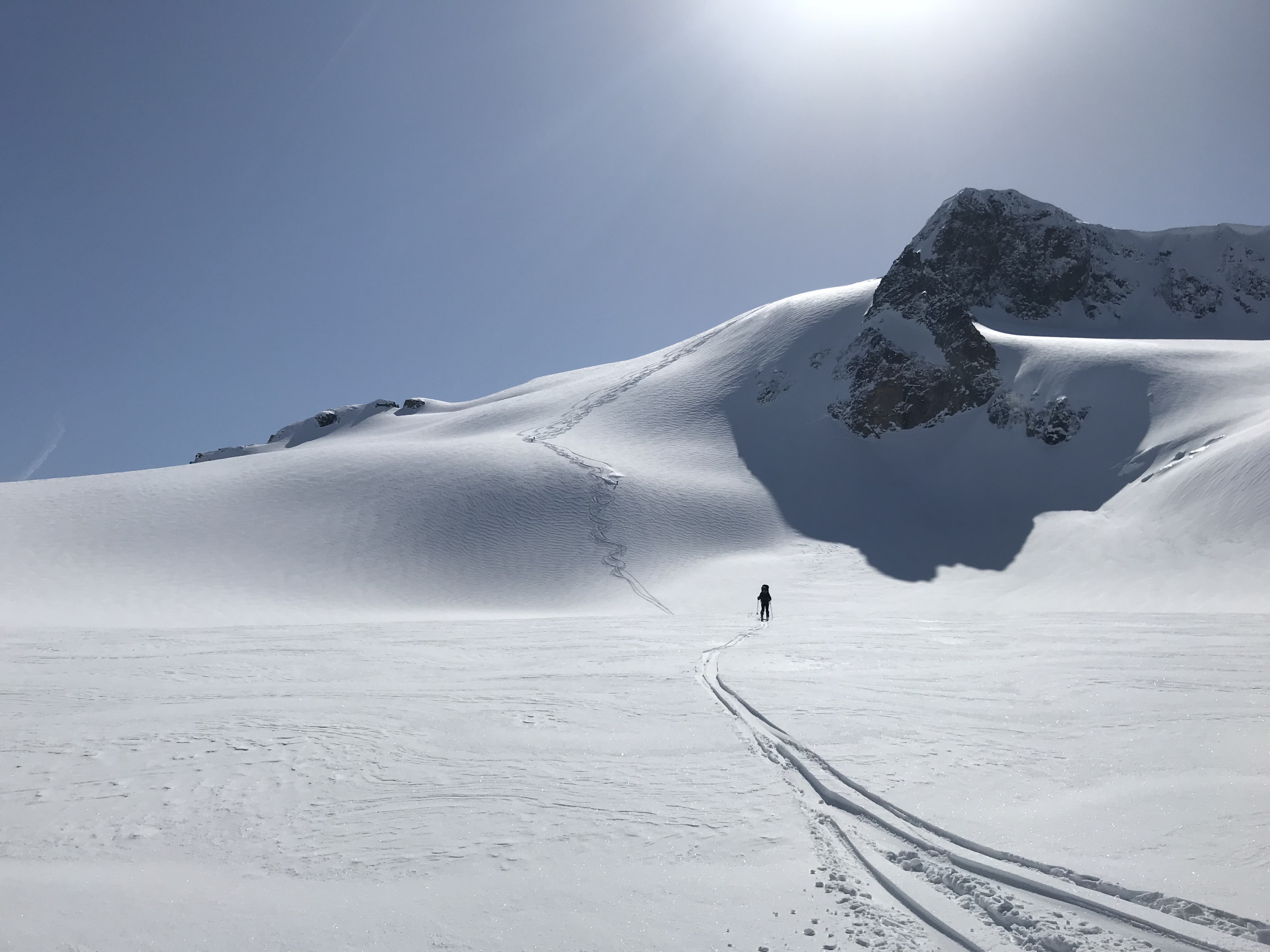 Travel was great, snowpack is deep on the glaciers (4m+) and crevasses are well filled and bridged. Ski quality was excellent on North aspects with boot top powder and mid boot on South. The previous melt-freeze crust could be felt but skied well. Very limited wind affect felt only in high exposed areas. The new snow seemed to be bonding fairly well to the previous melt-freeze crusts on solar and below 1800m with only minor sluffing and a few isolated small slabs. I chose to exit over Flute so no reports on Singing Pass conditions.