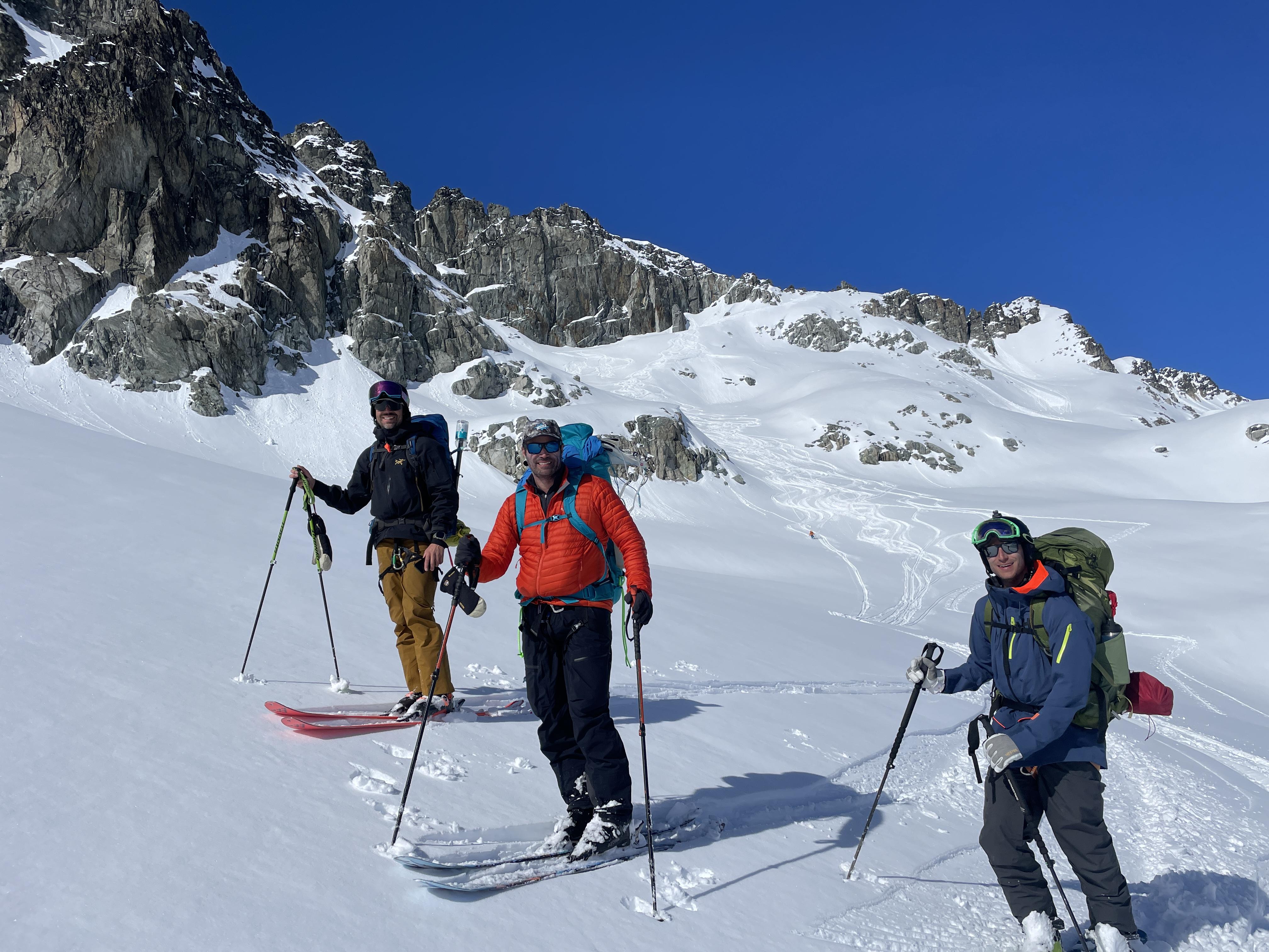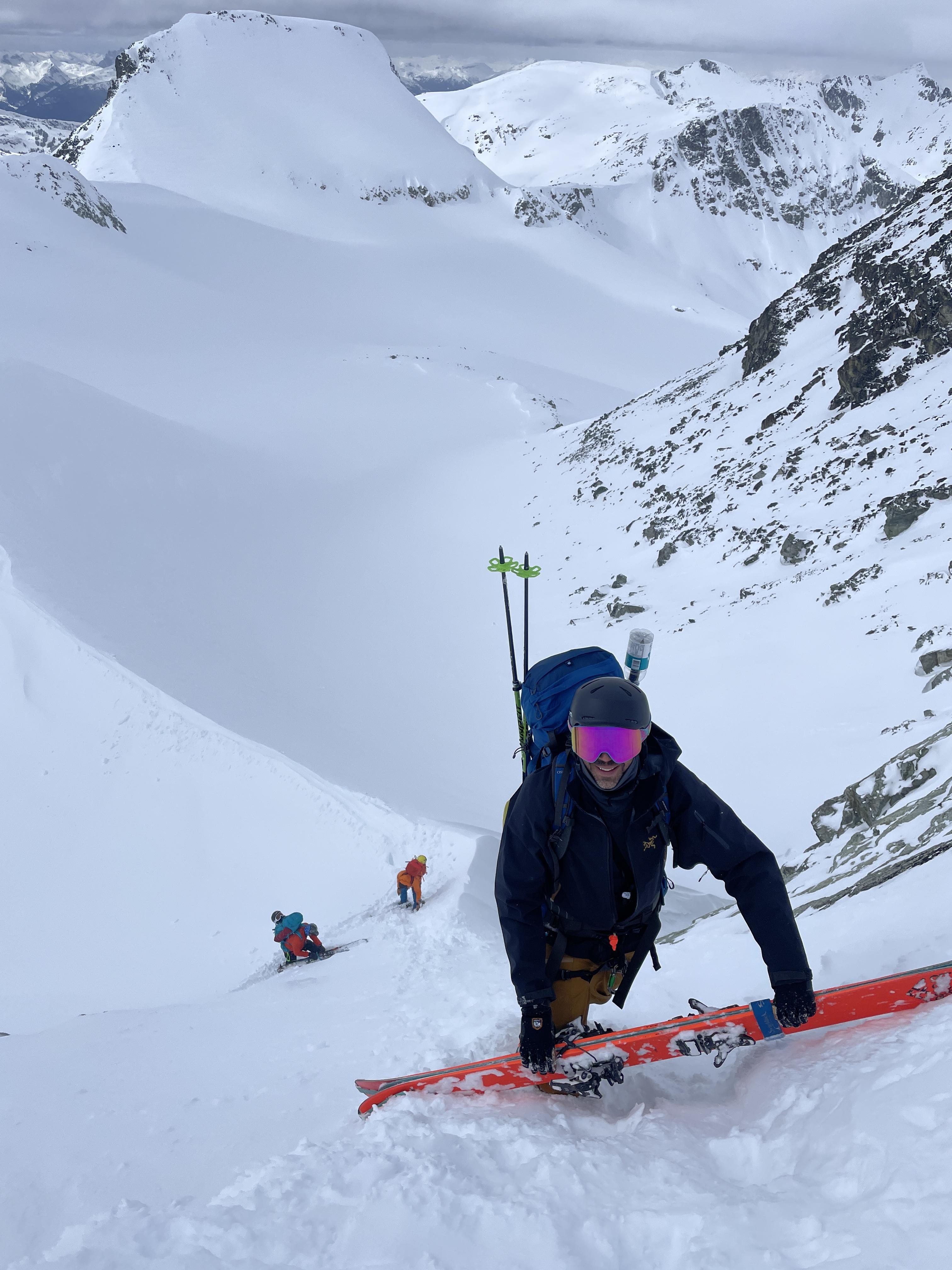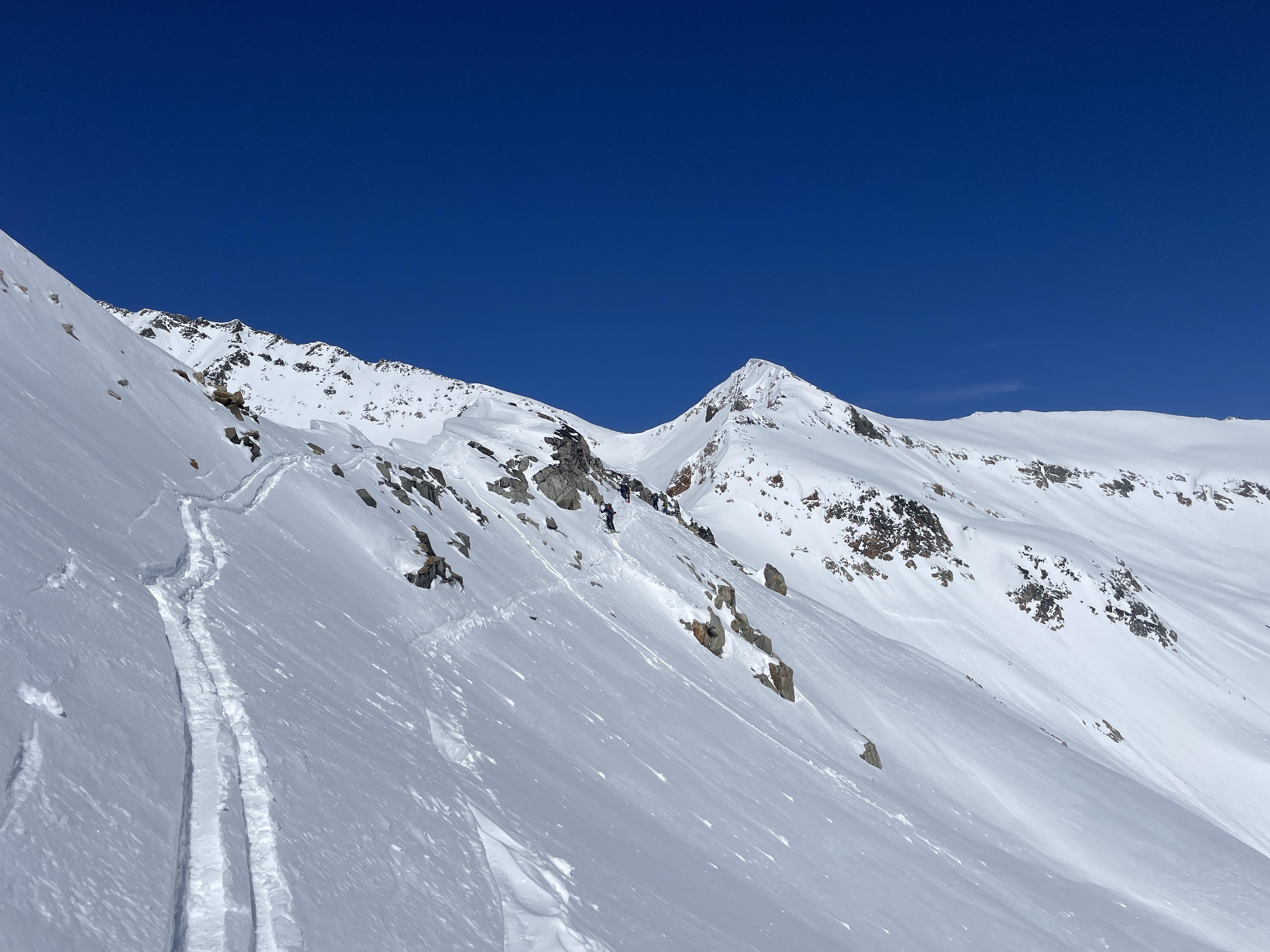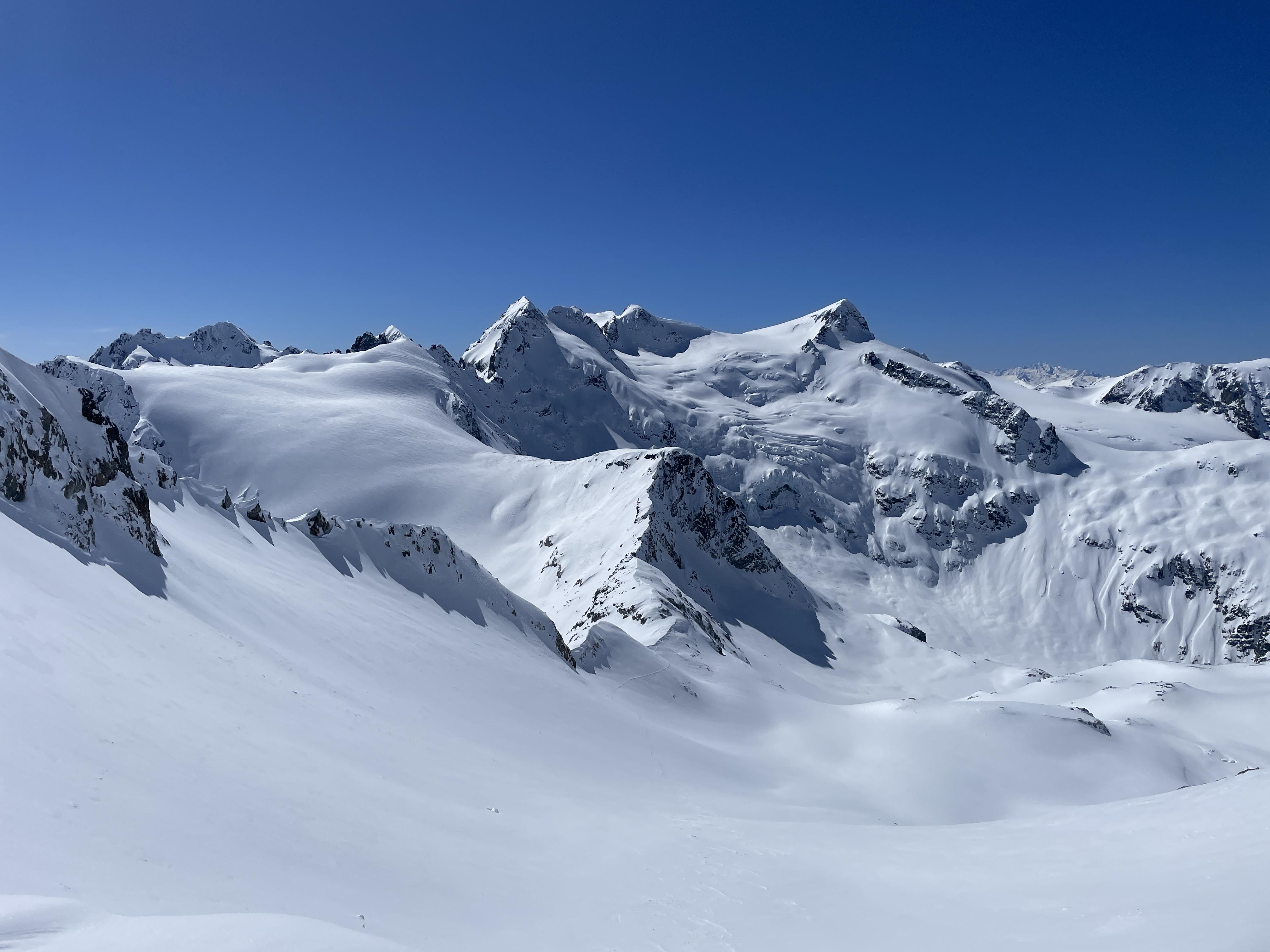 We had stellar cold conditions as well post April 2nd storm which dropped about 25cm of new snow in the Alpine. By April 6th on our last day, we started to see a breakable melt-freeze crust on all aspects except for N aspects above 1700m which had soft unconsolidated snow with some high exposed glaciers having widespread wind press. We did not see much in the way of significant avalanche activity. Height of snow at 2200m on Tremor Gl. was 260cm.