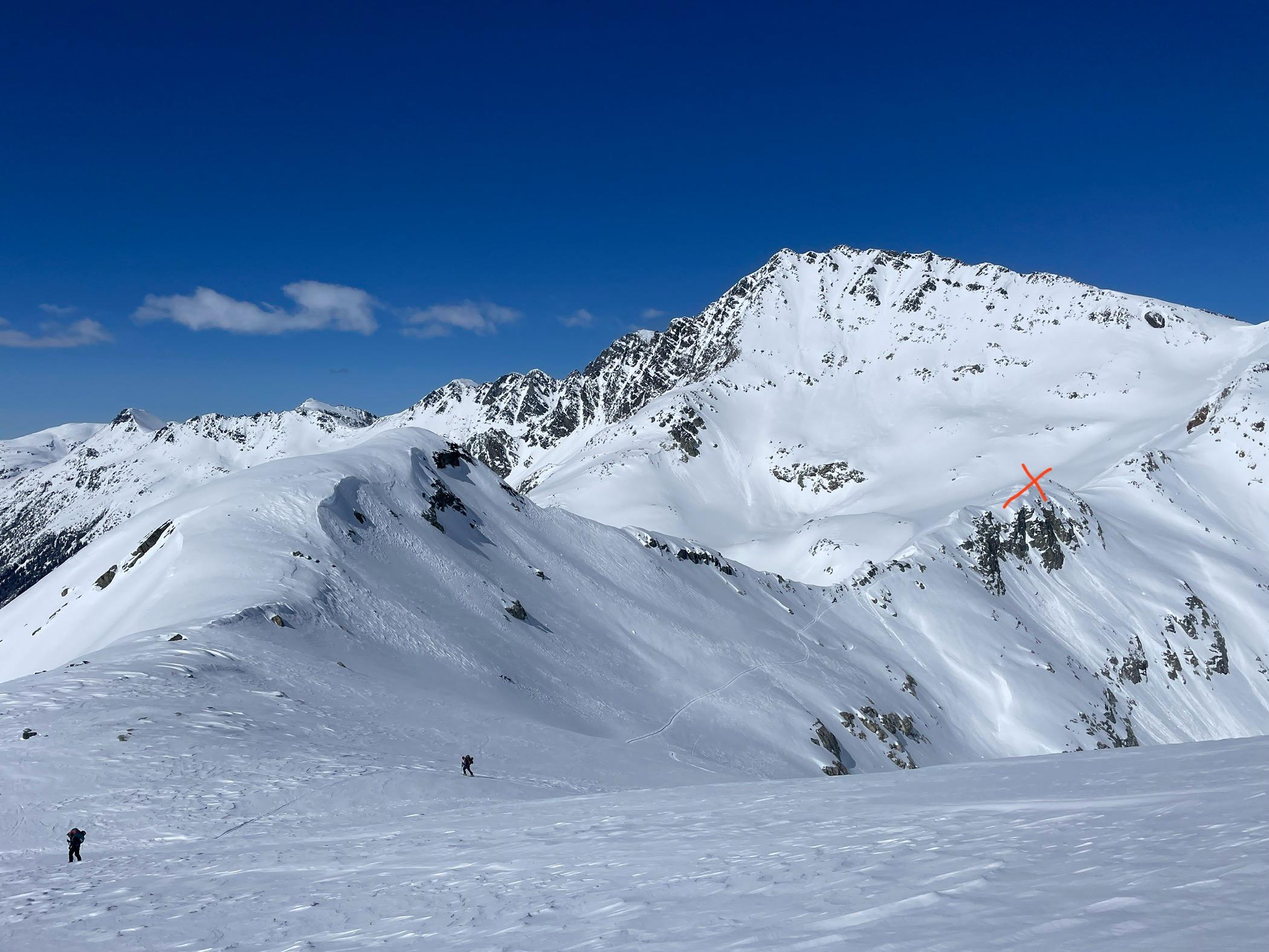 The crux ridge between Macbeth and Iago is easily navigated by gaining the high point with skins and then doing a gradual downward traverse to the other side. We had soft conditions on our travel, experienced folks can get through with downhill skinning in these conditions but removing skins would be advisable if snow was still frozen. See photo attached with X at high point.