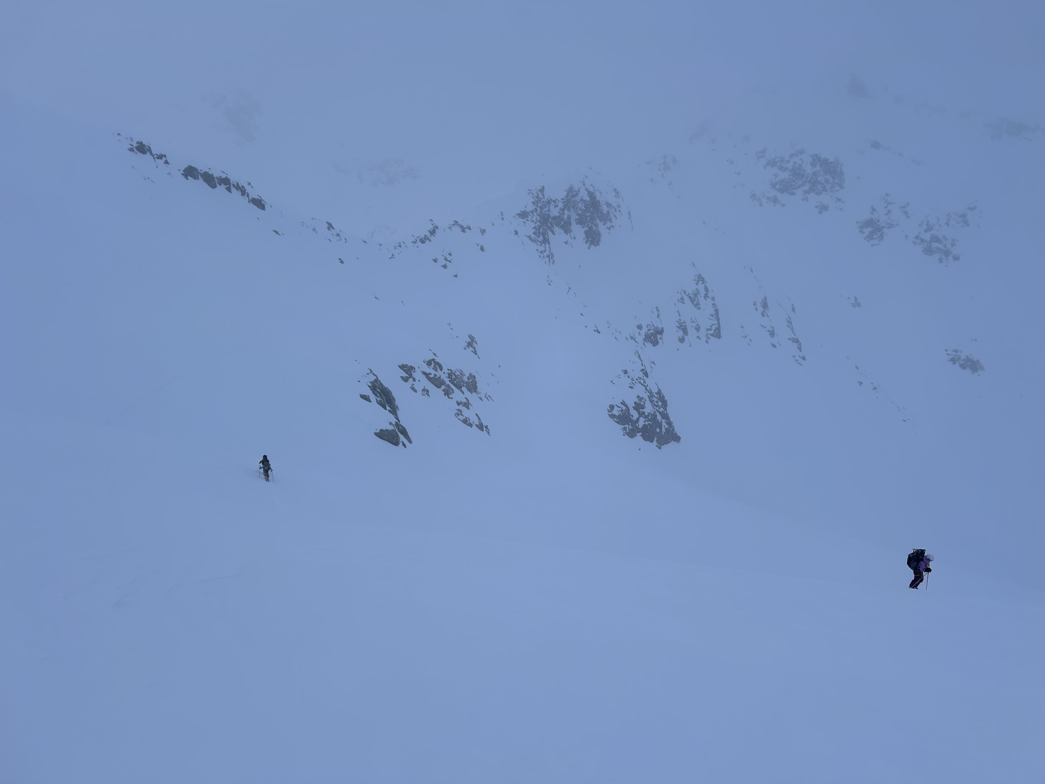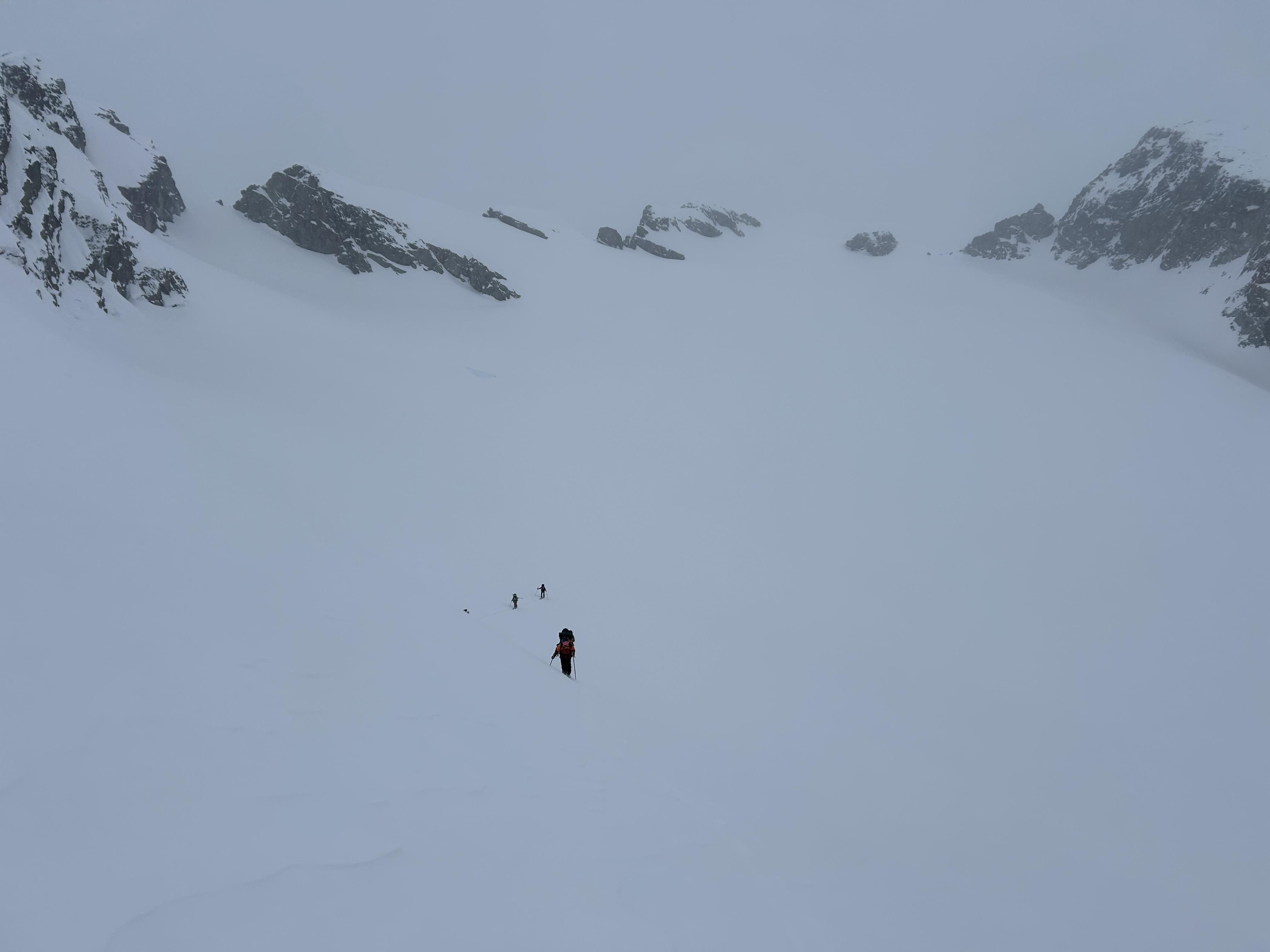 Tremor: Roped up for whiteout travel conditions on the tremor glacier. We easily avoided all crevasses and sags by following the low route up the lower angle terrain north of Tremor. The cornices on tremor are large and we chose to uptrack on the climbers left to minimize exposure. No issues gaining Tremor Col.