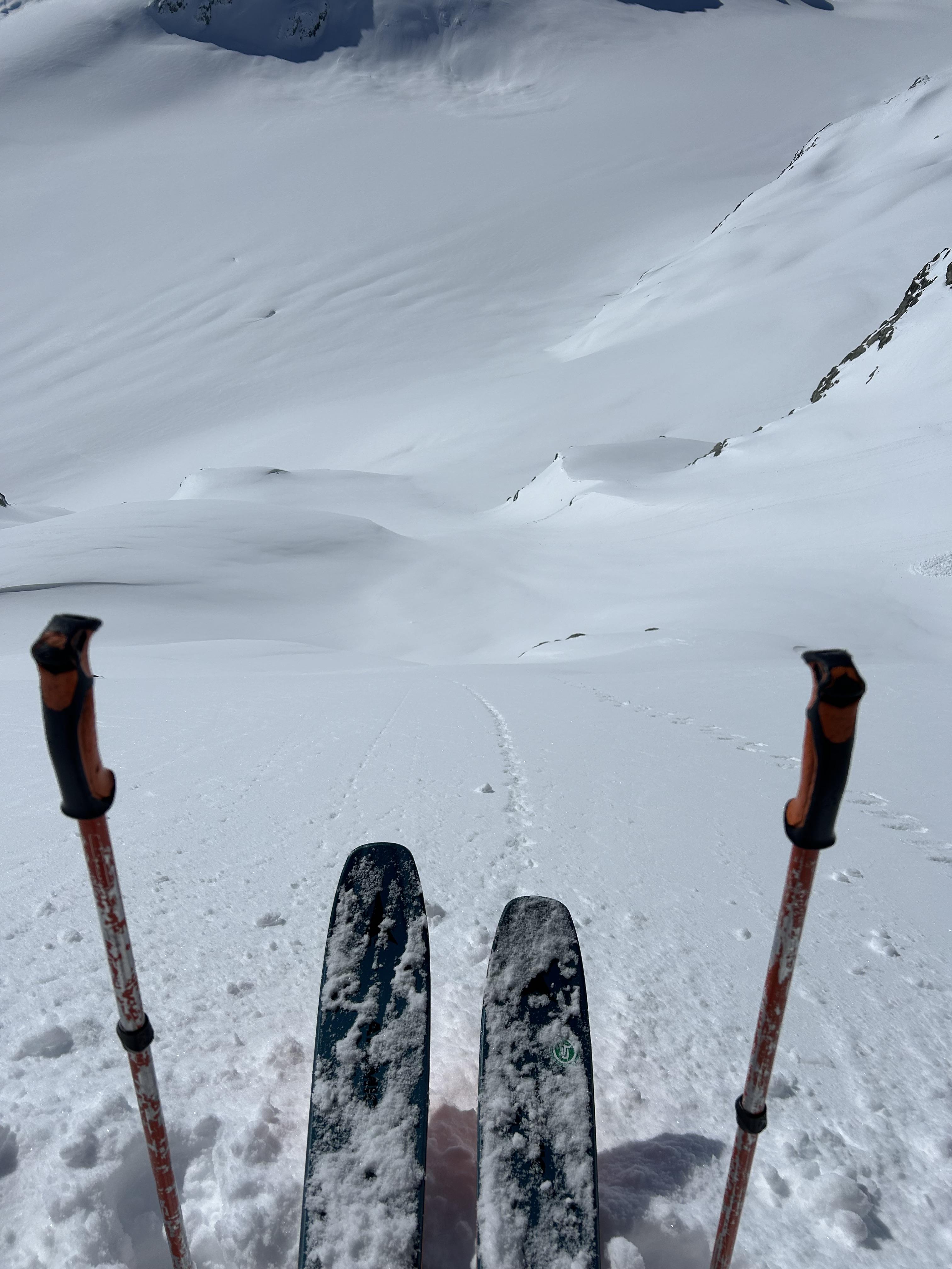 Ripsaw/Naden Ridge Descent: No issues. Was able to ski down onto the Naden glacier via center line. See photo. No rappel required.