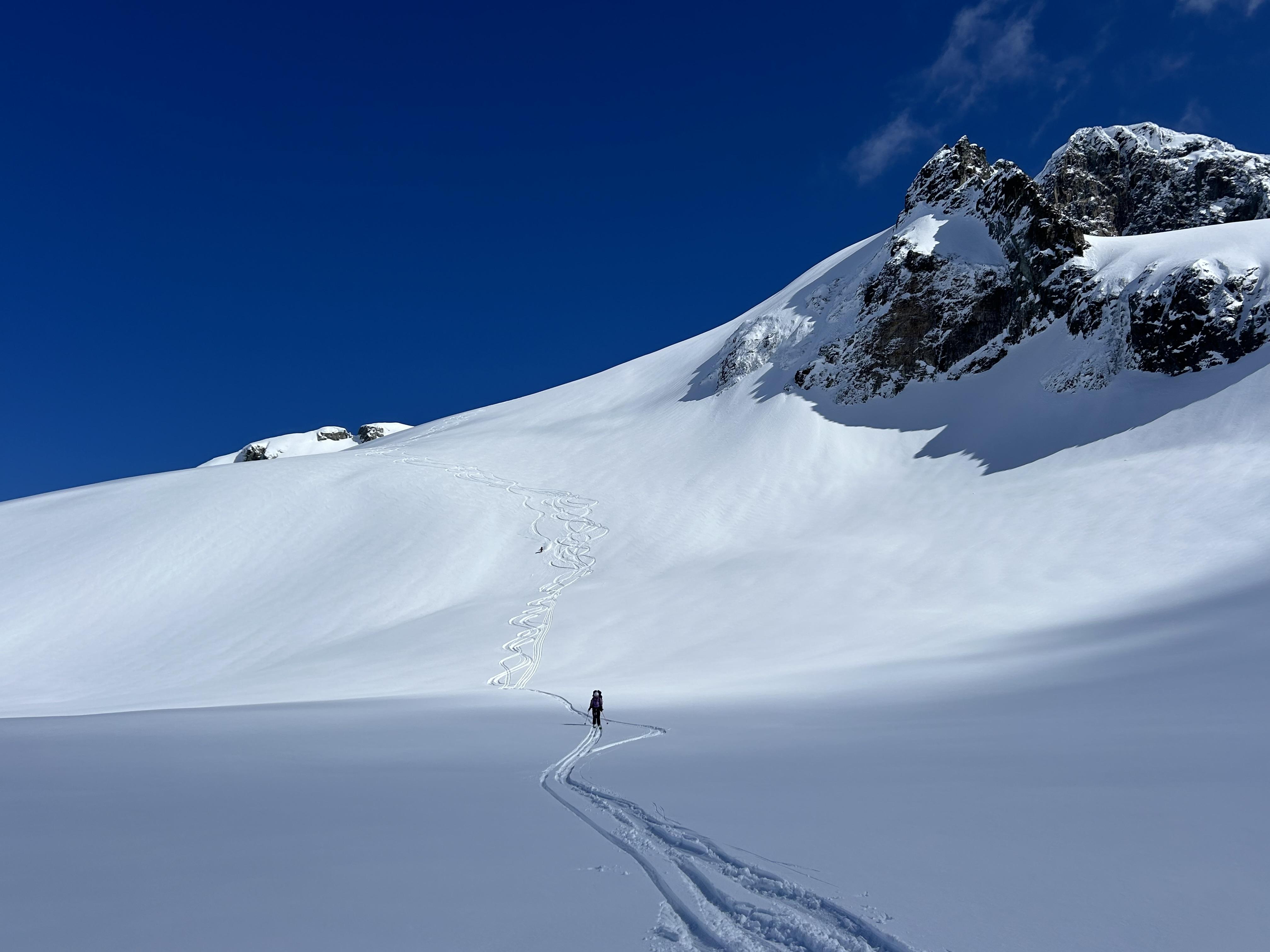 Platform: No issues. When gaining the Quiver/Ripsaw col from Platform Glacier, instead of dropping into the windscoop to access the col, we continued ascending climbers right 20m above the windscoop to a flat area (Whistler Heli Flags). From there it’s a simple entrance onto the ripsaw glacier.