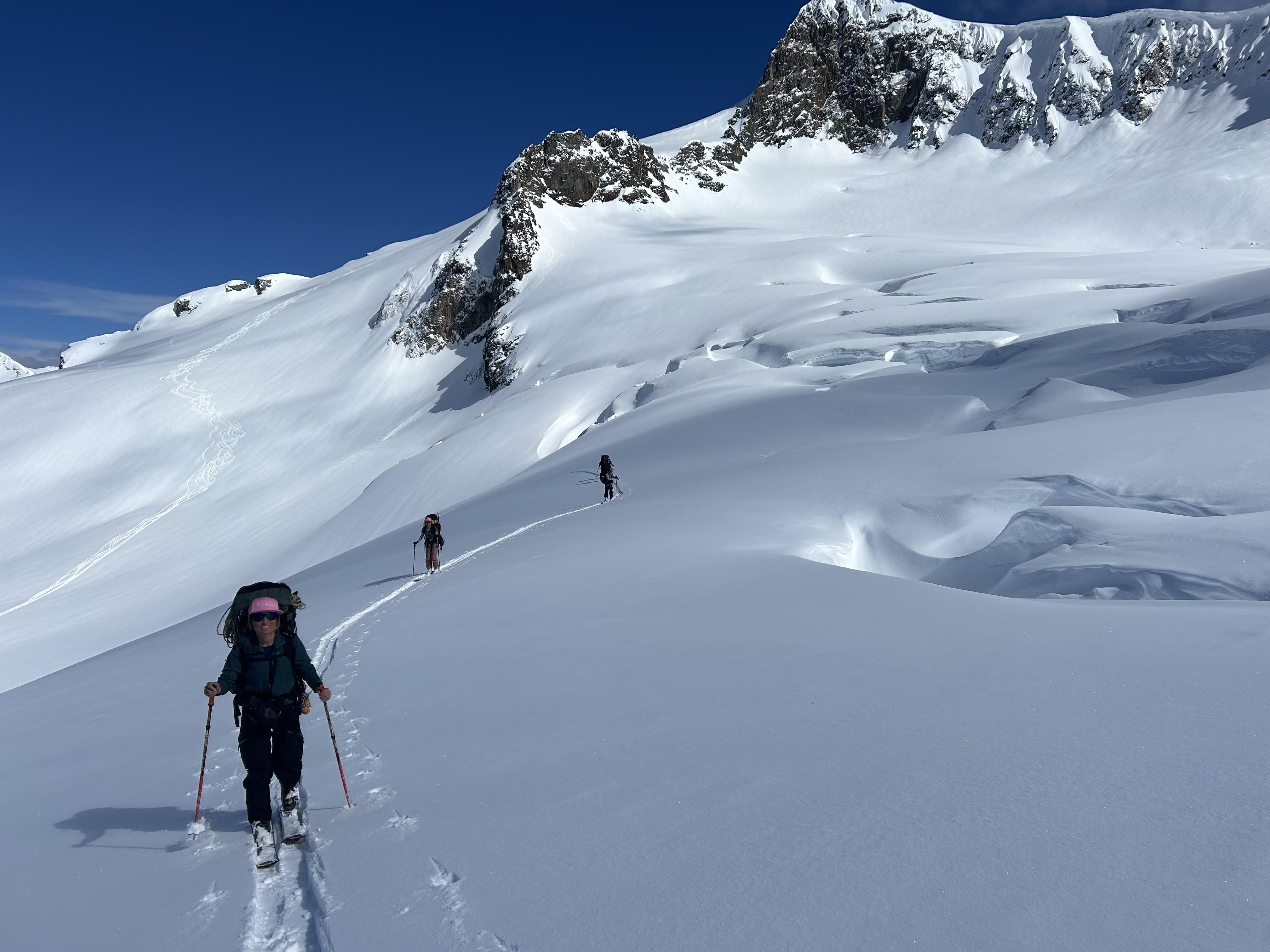 Ripsaw: Caution for this area. More open crevasses on the skiers right side than I have seen in past. We chose to NOT contour hard skiers right as there is an open crevasse that would be very hard to see from above. Instead we skied down the center of glacier and did an ascending climb to the ridge. Less efficient, but less crevasse hazard. There are 2 open crevasses on climbers left of the ascent.