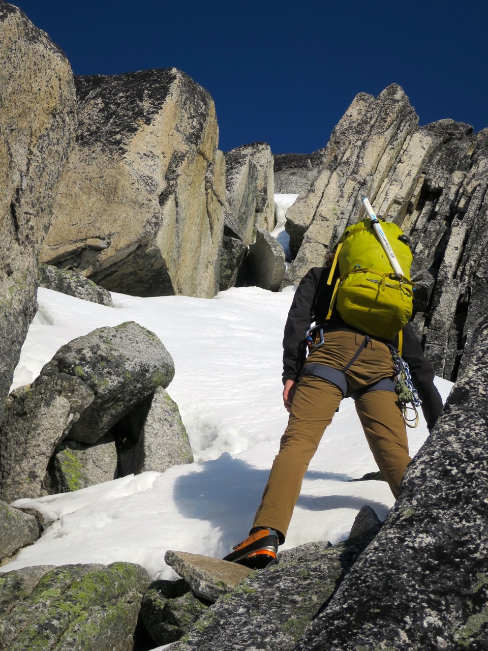 June 11th we climbed Bugaboo Spire via the Kain Route. There was more snow than I’ve seen on the route before requiring several detours on the lower half of the mountain (see photo). On the way down at the last bolted rappel, the party rappelling above us triggered a wet sluff that probably would have knocked us off the face if we hadn’t anticipated it and hustled out of the way. Not a hazard you usually have to deal with up there. All the crux pitches and knife edges up high were dry.