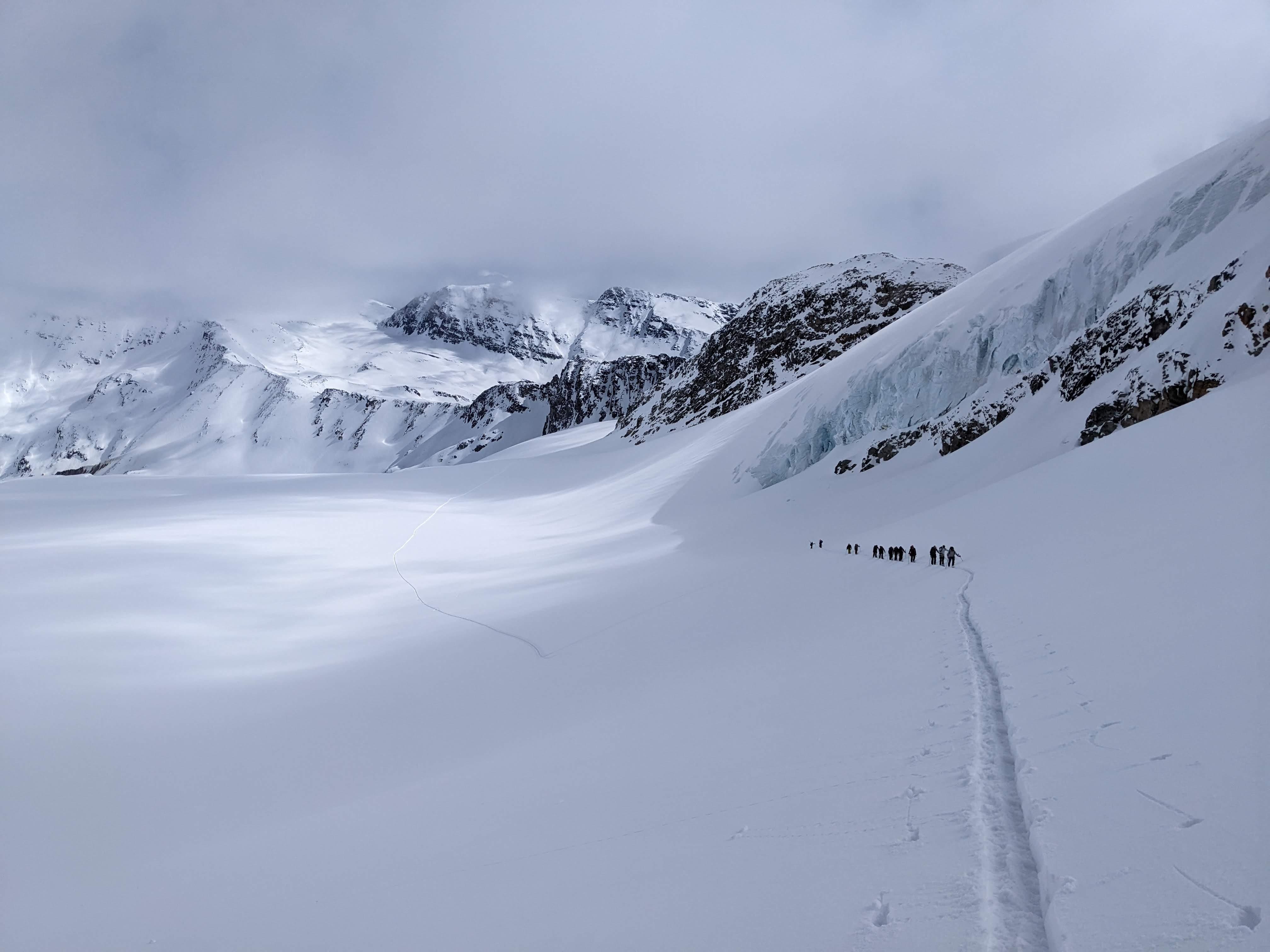 April 23: Partly cloudy skies allowed us to summit Mt Argentine, albeit with many moments of flat light. We found as little as 250cm snow on the lower icefield but more higher up - crevasses were well bridged. Settled powder on high shaded aspects made for excellent skiing. At ~3PM a small loose wet avalanche cycle began on steep South and West aspects.