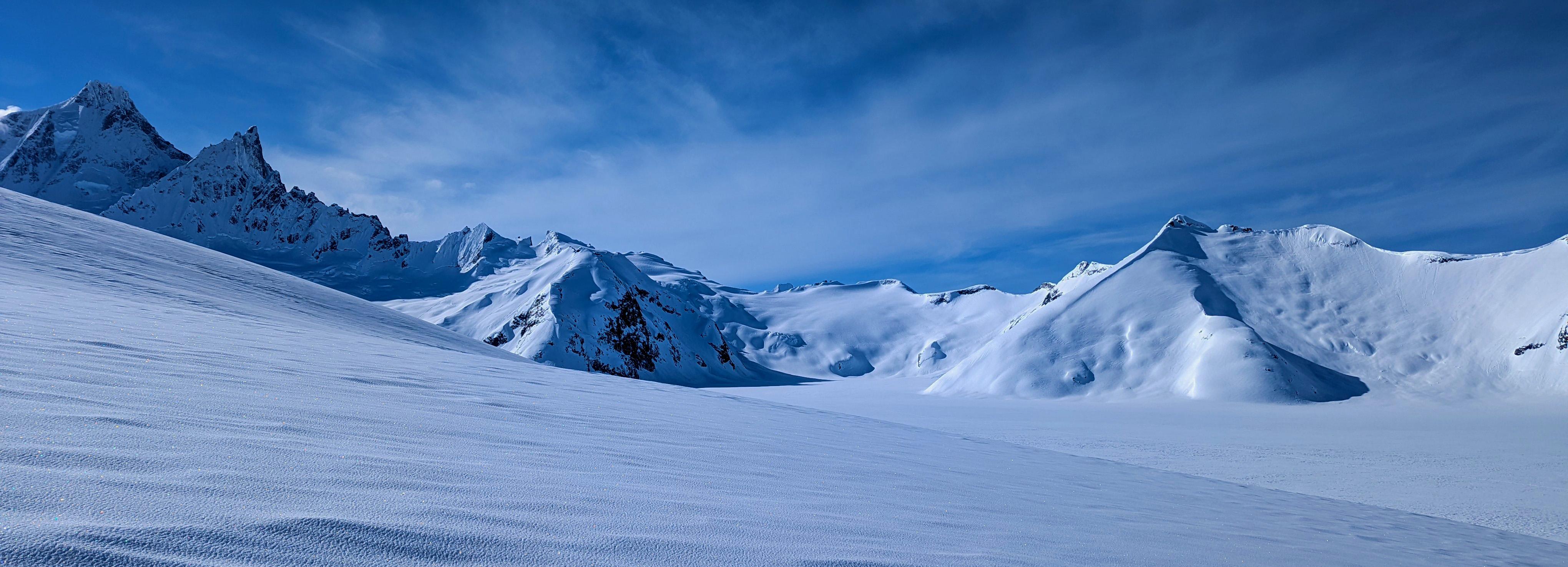 All terrain skied in this area was above treeline. Avalanche hazard above 1400m was generally Moderate with classic Spring conditions consisting of powder snow on North aspects and a mix of sun crust/corn snow on solar aspects. Our main concerns were exposure to large cornices and isolated wind slabs in the high alpine. Below 1400m, minimal overnight freeze occurred, and advanced spring avalanche conditions were observed, glide crack releases, cornice falls, loose wet on solar aspects, etc.
