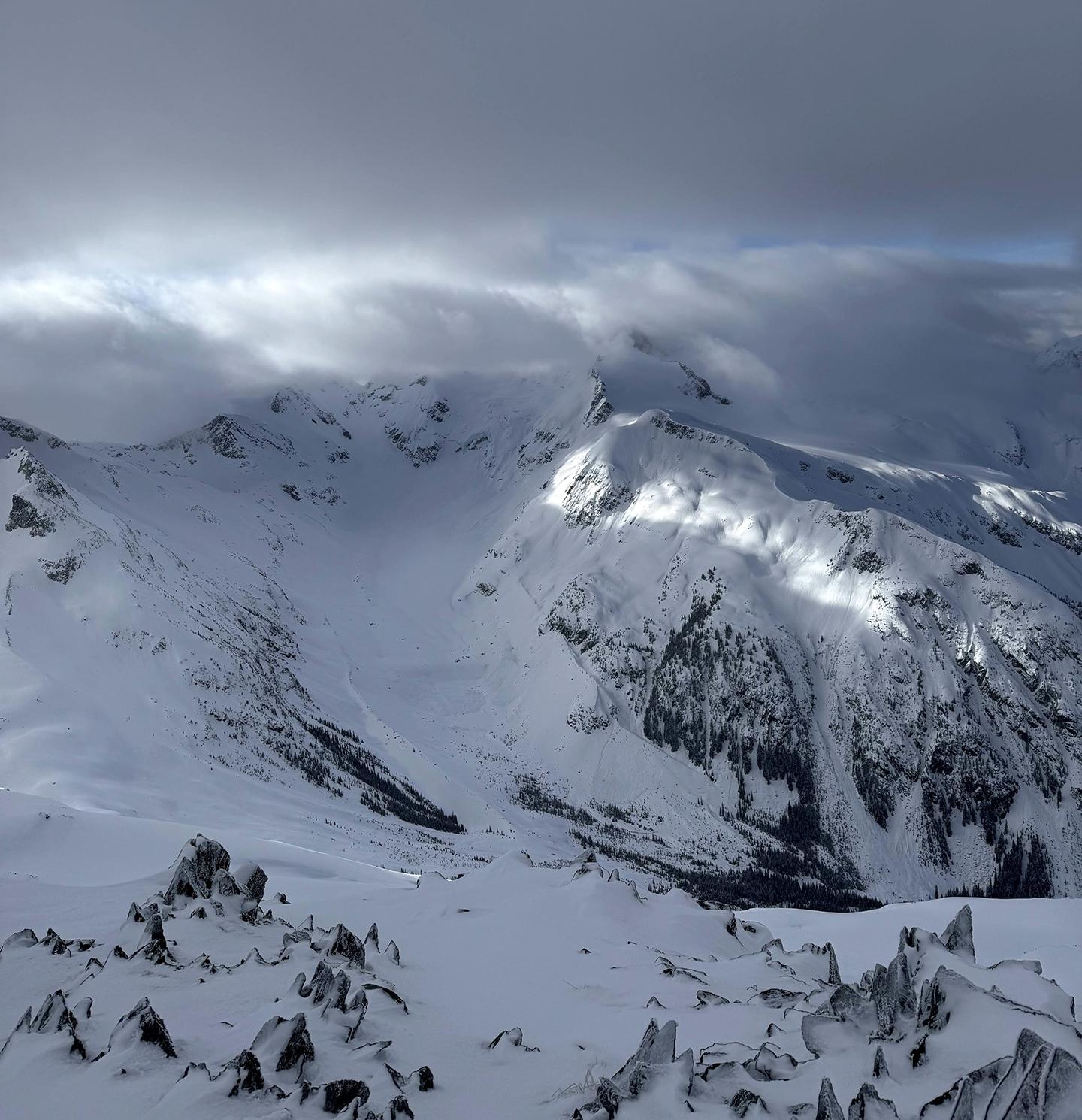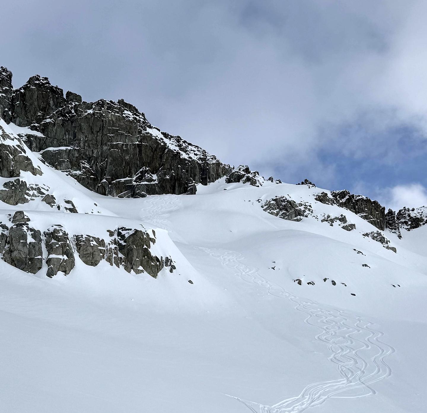 Our team exited Blackcomb resort from the lower backcountry gate and climbed up Disease Ridge into Garibaldi Provincial Park. We ski toured over to Decker Meadows and around the south side of Decker Mountain. We climbed to the Decker-Trorey col (2265m) and skied down the Trorey glacier to access the Spearhead Traverse. Up to 10cm of HST overlay moist snow down another 60cm at 2200m. We ski cut on belay a size 1 soft slab running 40 meters on the East facing aspect. The skiing was difficult and steep (up to 45°) with soft slab overlying moist snow with flat light made for poor ski quality with overnight packs. Three size 2.5 to 3 natural avalanches had run on Mount Trorey on the North, West, East faces and stepped down to persistent weak layers. Height of snow on the Trorey, Tremor, Platform, Ripsaw, Naden, Iago, Diavalo and Overlord glacier was consistently over 300cm. With poor visibility and knowing that cooling temperatures were following overnight, we camped at 2400m on south side of Mount Pattison and awaited improving conditions.