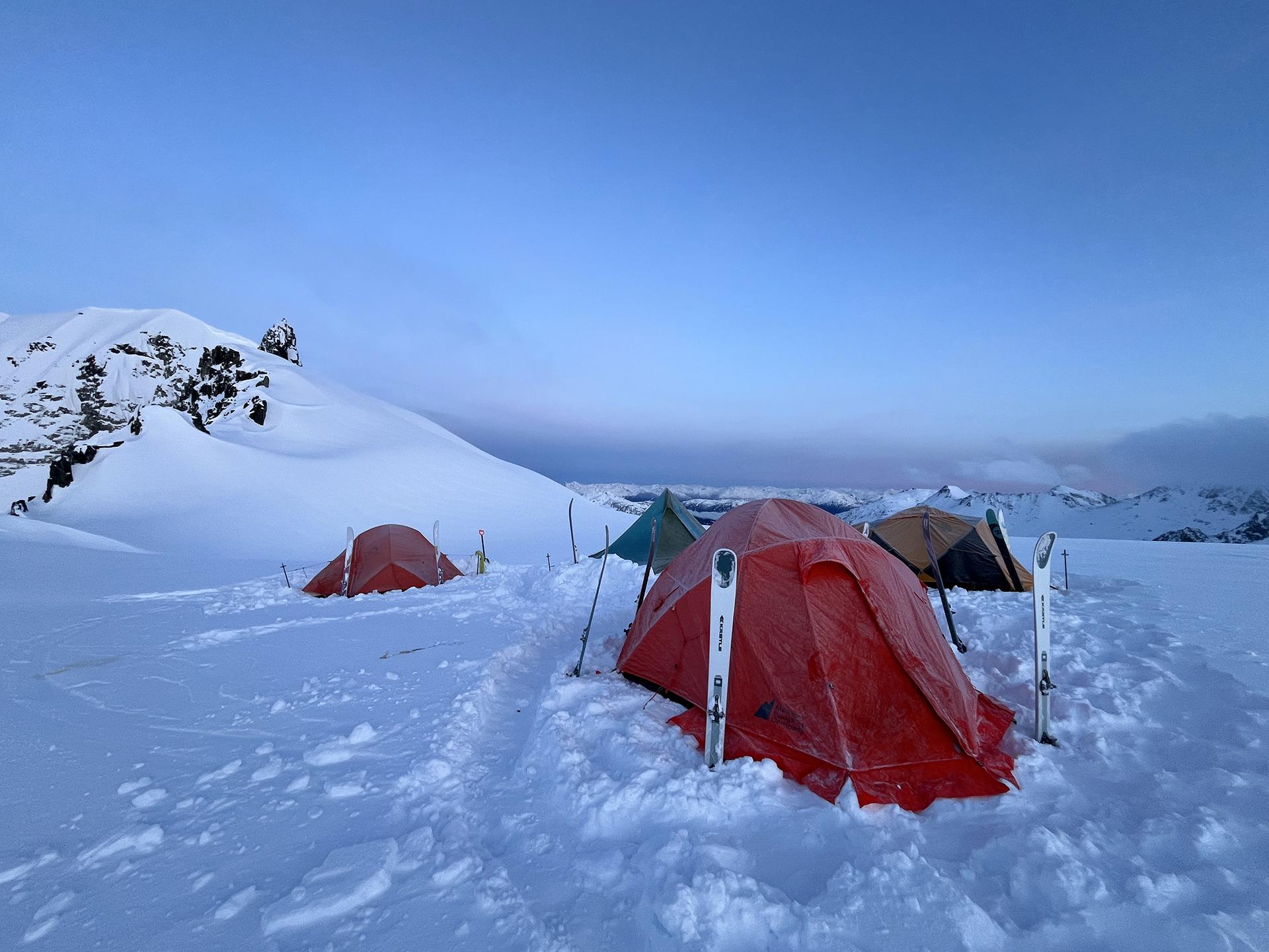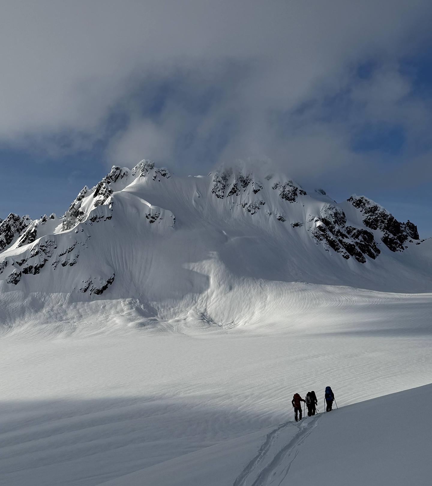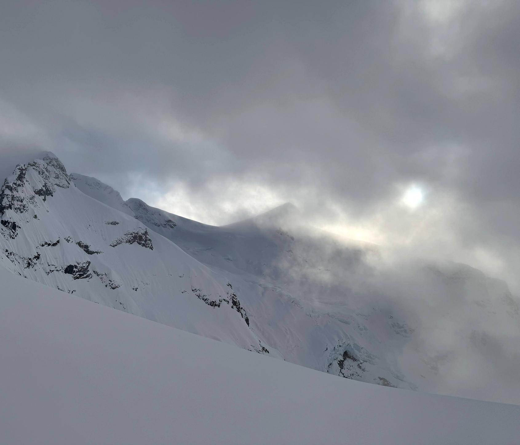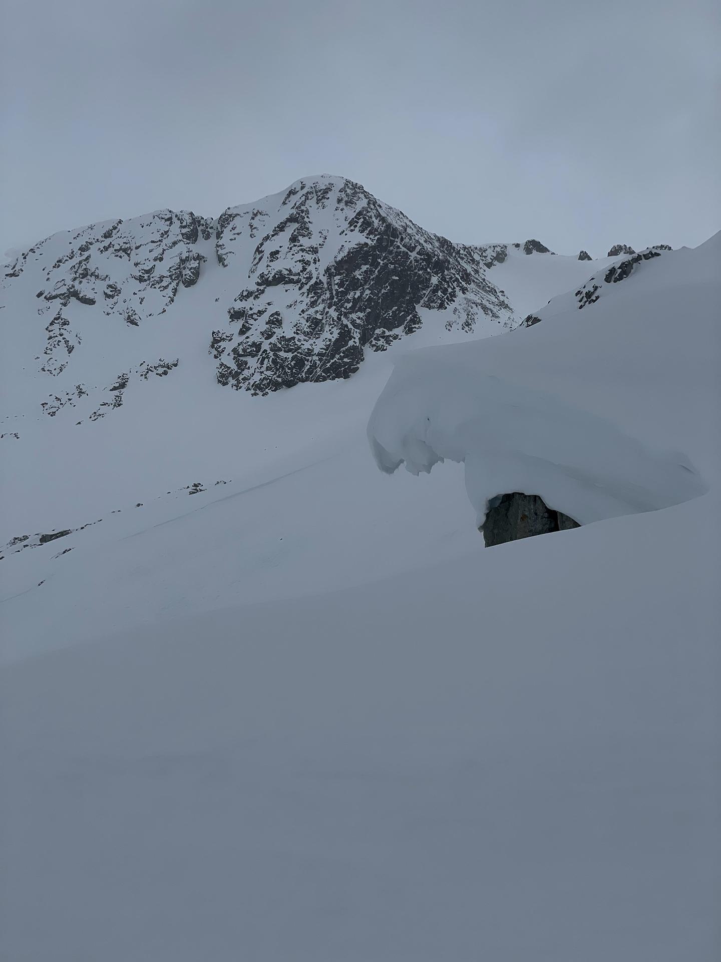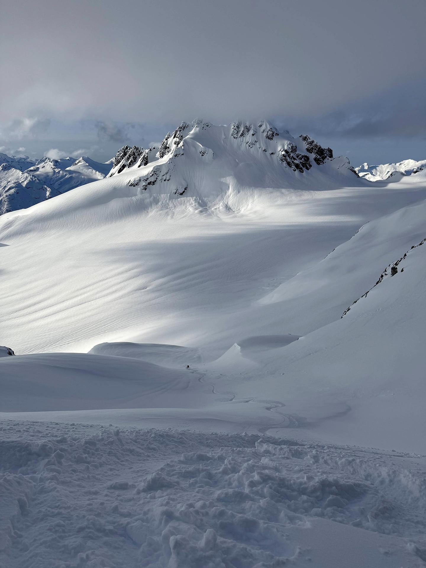 Day 3: Light to moderate winds overnight and 6:00am had few clouds and continued cool temperatures to -8°C. Skiing was phenomenal down the south side of Iago to Diavalo glacier with 20cm of new dry snow. Surface hoar to 6mm was scattered to 2400m while climbing up Mount Benvolio. The high col to the south was used, therefore avoiding crossing under the proud ‘bigger than my apartment’ cornices on the north side of Mount Benvolio. Strong to extreme winds arrived around 10:00am on Overlord Mountain and we avoided the rappel due to wind exposure. We descended the Overlord glacier to 2120m and the snow was wind affected on NE-E aspects above 2350m. Minor wind affect and old ski tracks were found on Whirlwind Peak. We passed Kees & Claire Hut and ate special delivery donuts to fuel us for the final climb over the Musical bumps and onwards to partially refrozen Flute and the Whistler ski resort slush.
