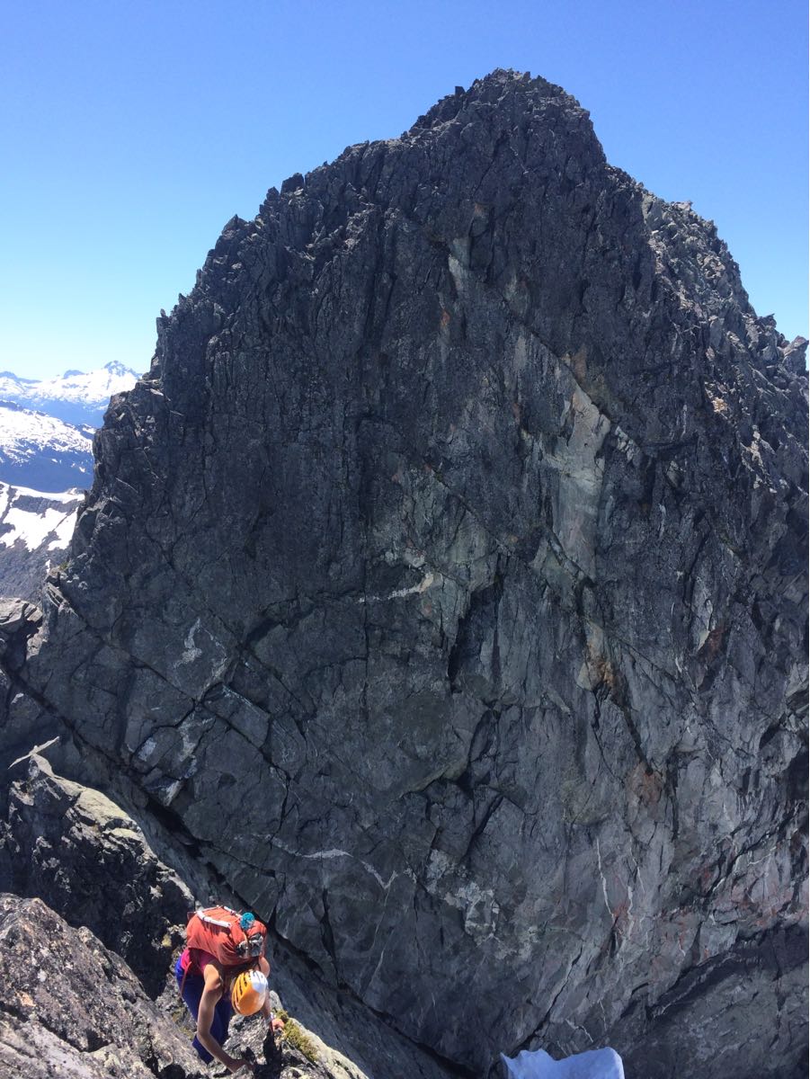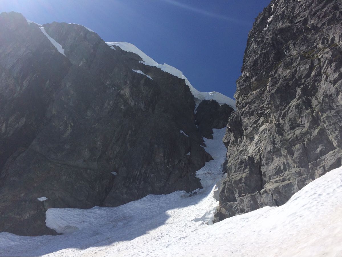 Still a lot of snow at treeline and above making for slower than normal travel and hot slogging conditions. Overnight freeze was good making for decent travel/snow conditions. Cornices were still looming on N aspects as we traversed from the col over to the start of the N ridge (photo) but it was easy to stay out of their range. Rock was snow-free and glissading conditions were excellent!