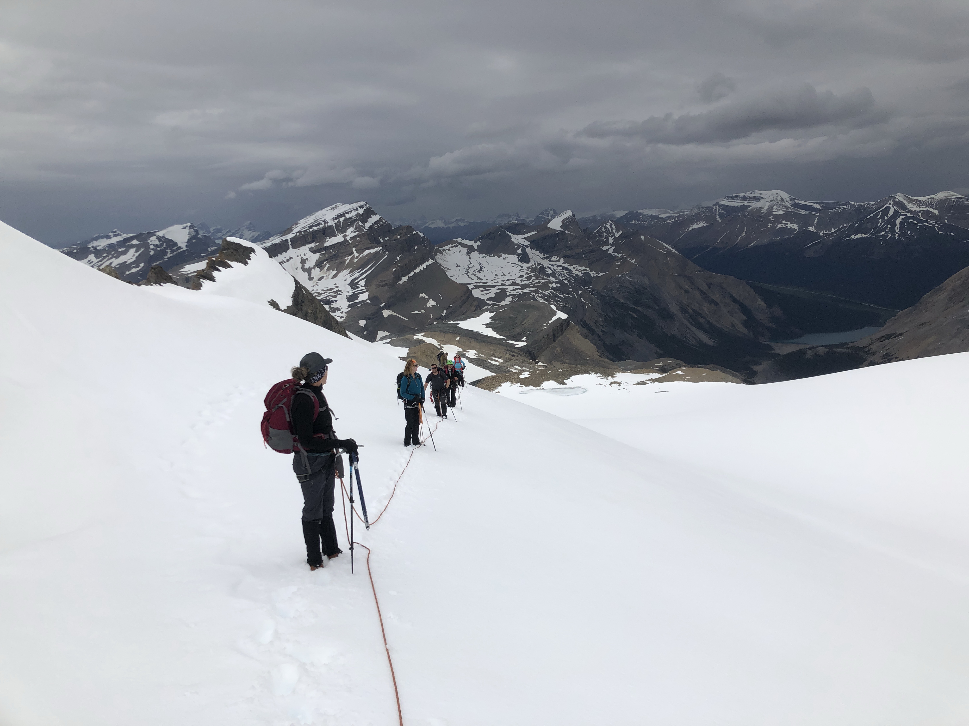 Spent 4 days at Bow Hut from July 2-5th. Overall it seemed snowier on the Wapta than other years at this time. We climbed Mt Olive on July 3rd. Foot penetration was about boot top.The snow was quite soft on the ridge which pushed us close to the rock to avoid exposure on the snow. We belayed this section on the decent.