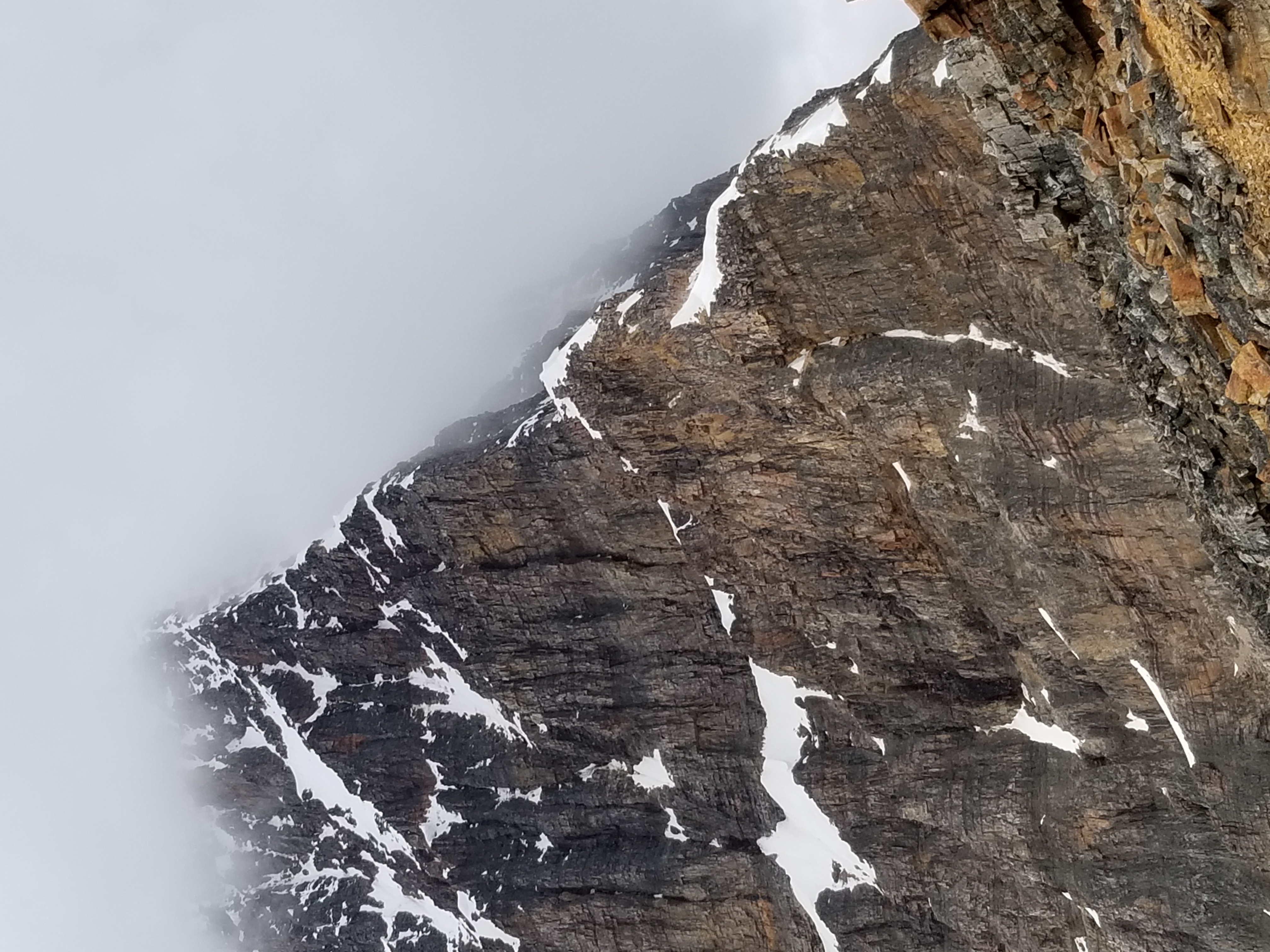 TJ and I attempted the East ridge of Edith Cavell yesterday. Approach up the valley is mostly dry with the odd snow patch making travel easy towards the saddle, Once there, a large snowfield makes easy, fast travel up to the saddle. The lower half of the route is in dry good shape with ample opportunities to fill water bottles at the base presently. Once on the shoulder ~2900M winter snow patches exist. The ridge has large patches of snow throughout and the top of the mountain remained in the clouds all day.