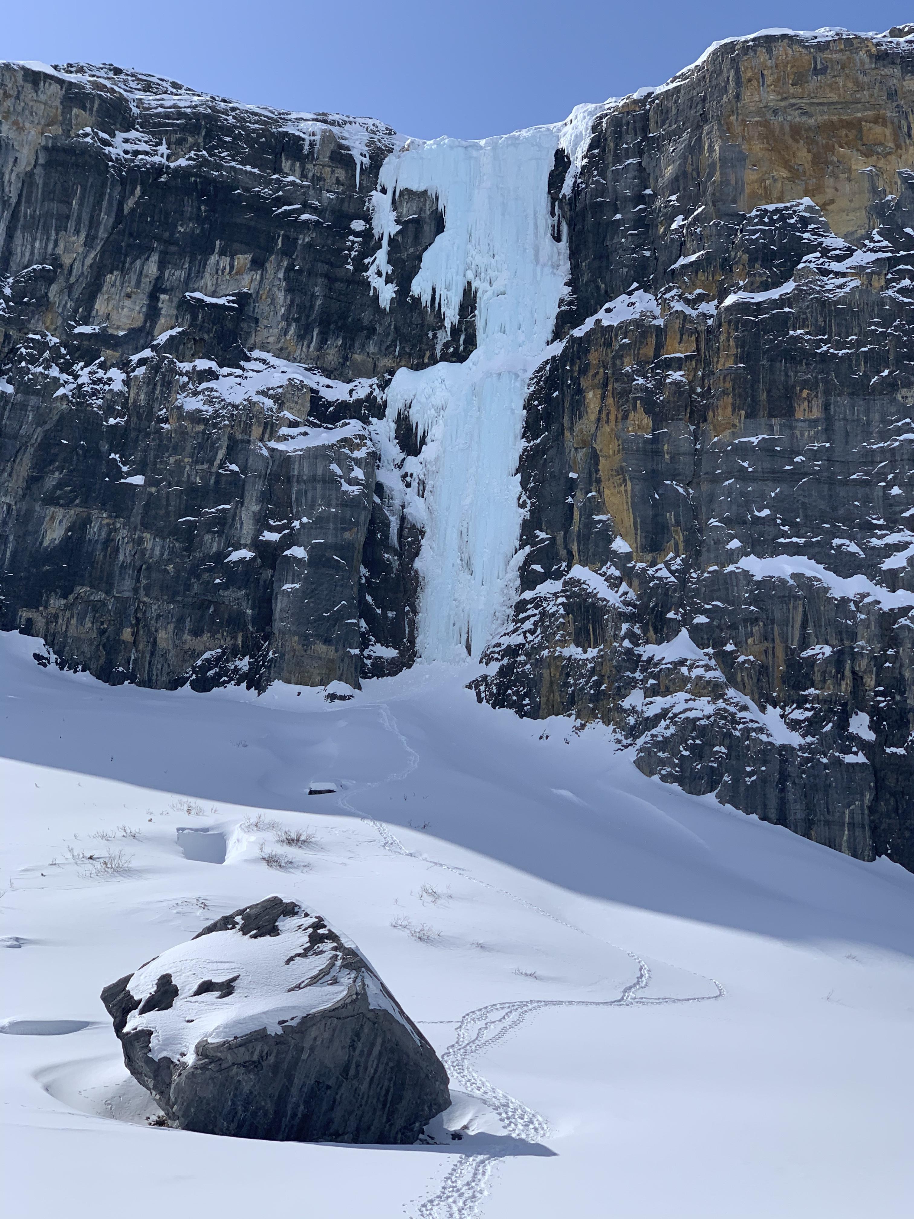 Travel on foot was easy on a well packed trail to just before the big boulder below the route. We snowshoed the last 200m to the base in variable snow conditions consisting of hard windslabs and punchy dry faceted snow.