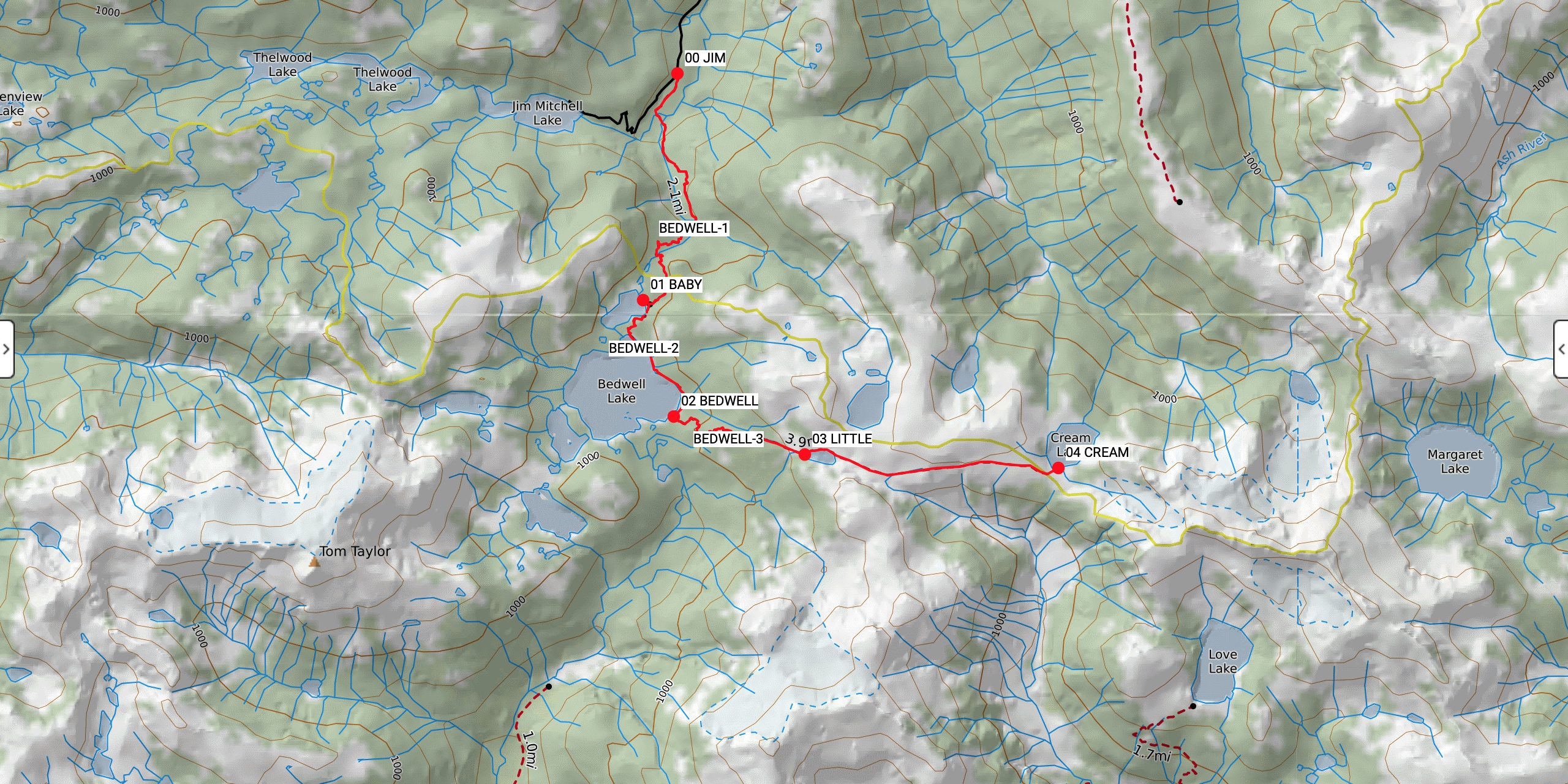 - Day 2, Bedwell Lake Camp (935 m, GR 126852) to Cream Lake Lookout (1340 m, GR 162845). Distance: 5.35 km, Duration: 3:05’35, Ascent 484 m, Ascent Time: 1:42’36, Descent: 84 m, Descent Time: 19’40.0. Cream Lake Lookout (1340 m, GR 162845) to Bedwell Lake Camp (935 m, GR 126852). Distance: 5.12 km, Duration: 2:21’39, Ascent 81 m, Ascent Time: 20’32.0, Descent: 489 m, Descent Time: 1:30’24.