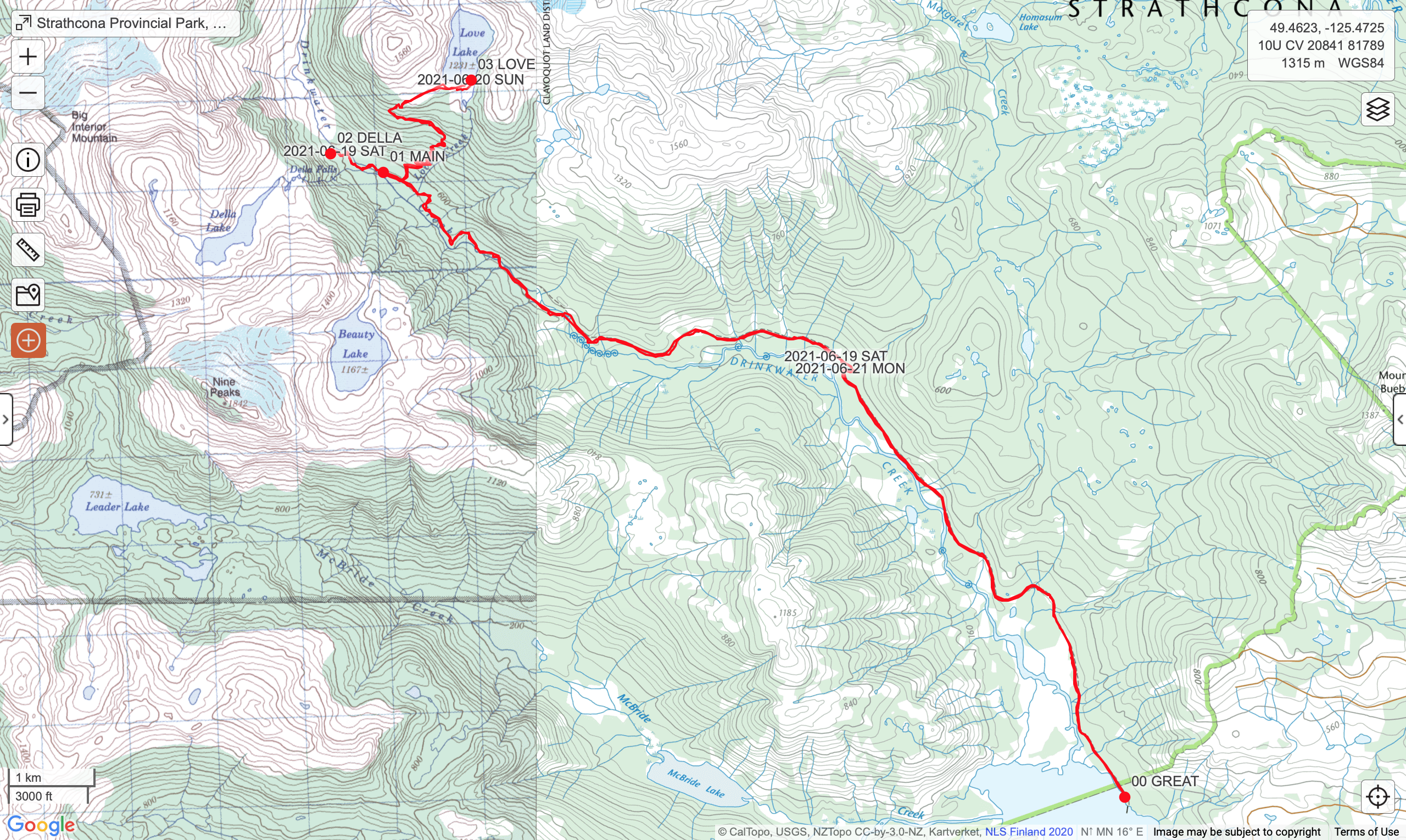 I just returned from a three-day backpacking trip guiding four enthusiastic ladies on the Della Falls Trail in Strathcona Park. Our objectives were to ride the Della Falls Water Taxi and hike to Della Falls Main Camp on day one, explore the Love Lake Trail as a side trip on day two, and hike back out to the dock for the water taxi pickup on day three. Highlights included epic summer solstice weather, good route conditions, a team keen on learning backpacking skills and wilderness navigation, and spectacular views. Memorable features included Della Falls in full flow, Big Interior Mountain, Nine Peaks, Mount Septimus, Mount Rosseau, and numerous other Vancouver Island peaks far off in the distance.