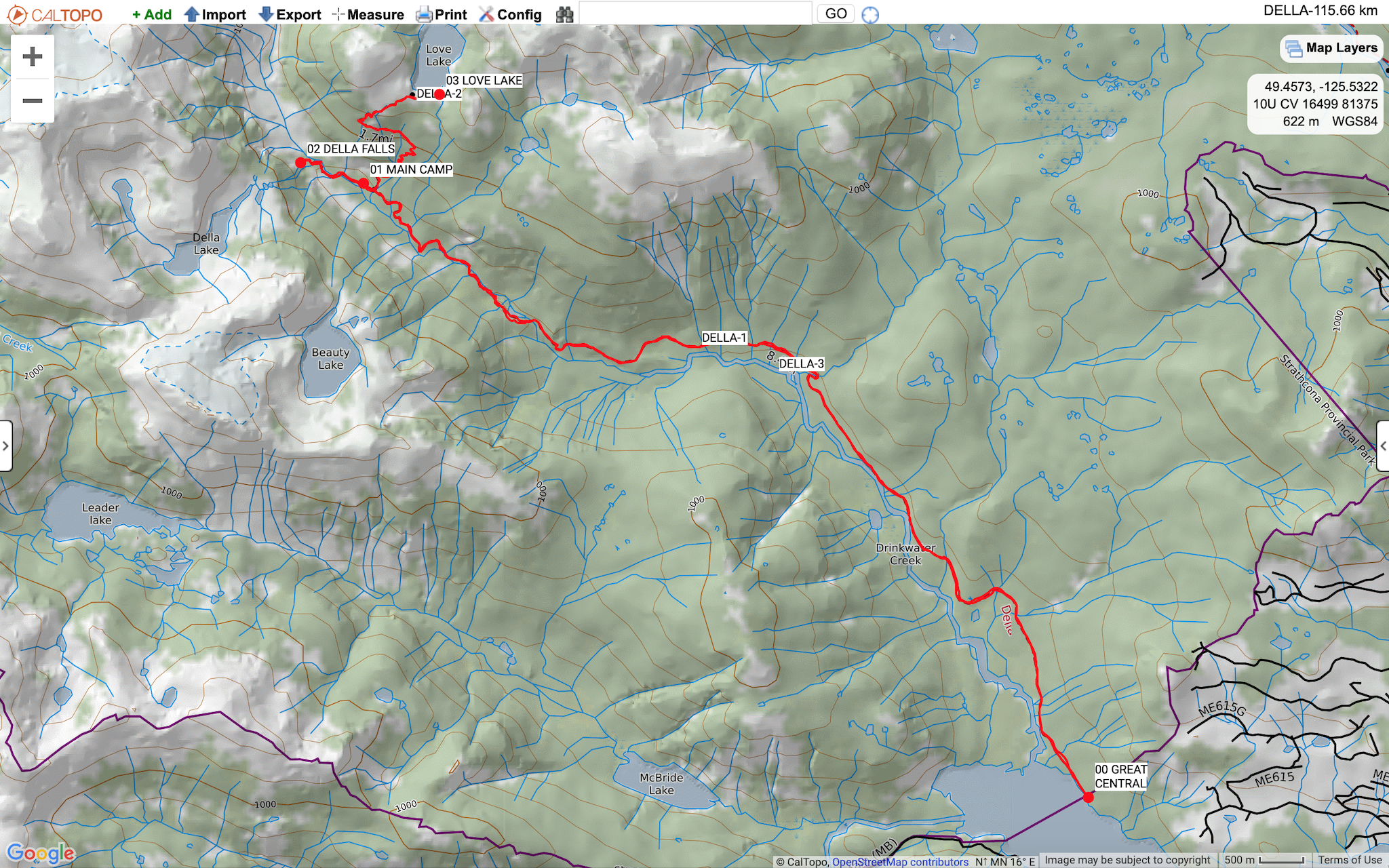 - Day 1, Della Falls Trailhead (94 m, GR 252738) to Della Falls Main Camp (560 m, GR 170811). Distance: 14.85 km, Duration: 4:57'28, Ascent 574 m, Ascent Time: 2:29’34, Descent: 115 m, Descent Time: 33’48.0.