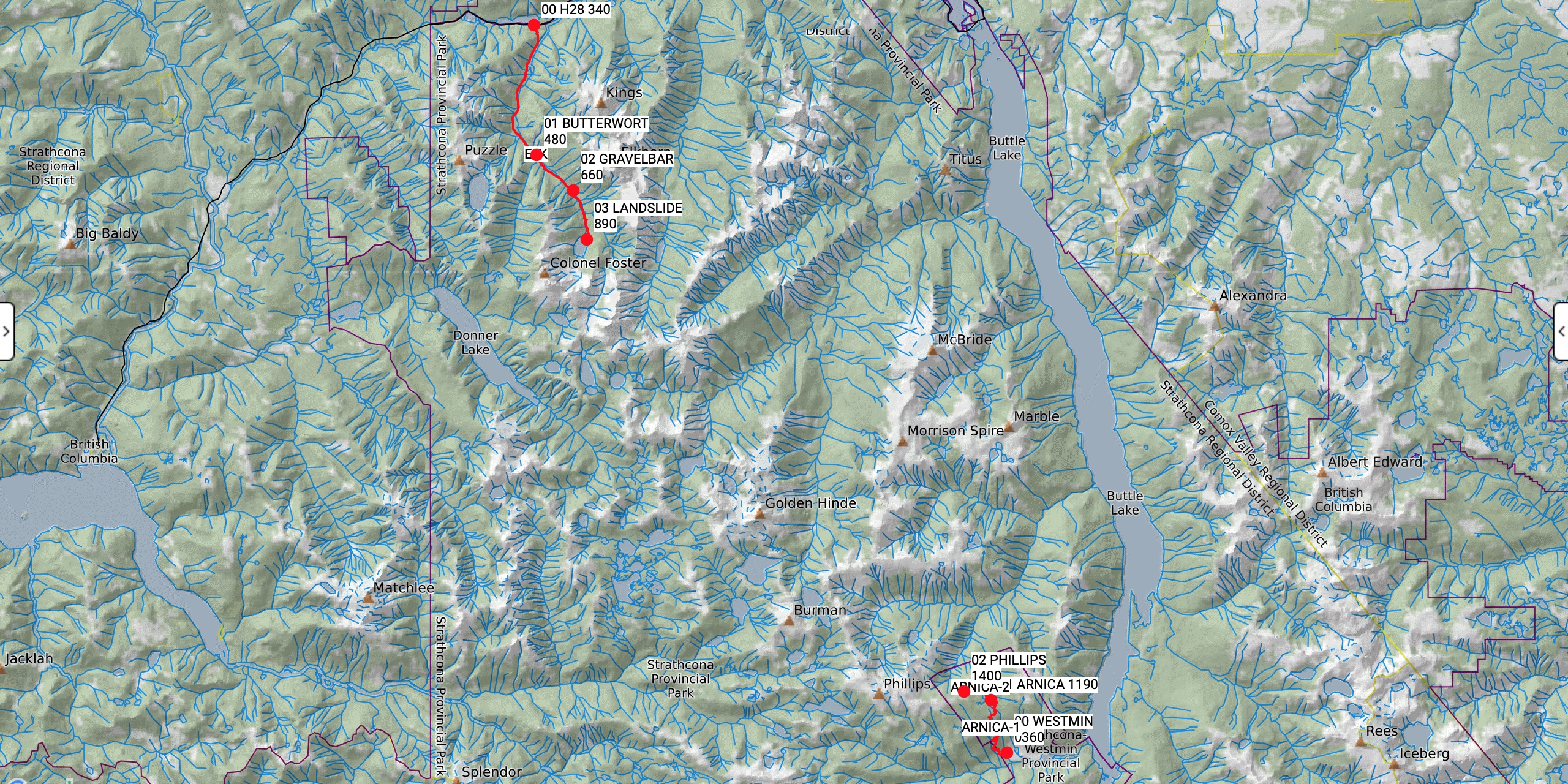I returned from a three-day solo mission into the heart of Strathcona Park. My original objective was to camp two nights at Arnica Lake and survey terrain for future trips on the Golden Hinde Traverse and around the Phillips Ridge Horseshoe. My actual trip expanded into two separate adventures along both ends of the Golden Hinde Traverse. Day one, I hiked up the Phillips Ridge Trail to Arnica Lake for my first night. I explored Phillips Ridge for a couple of kilometres beyond the lake. Day two, I descended back to the mine site and drove up Buttle Lake to the Elk River Trailhead. I backpacked into Butterwort Camp for my second night. Day three, I hiked up to Landslide Lake and back out to the trailhead. Highlights included near perfect weather, surveying new terrain, and an early morning viewing of a mother black bear and her two cubs walking along the shoreline of Arnica Lake.
