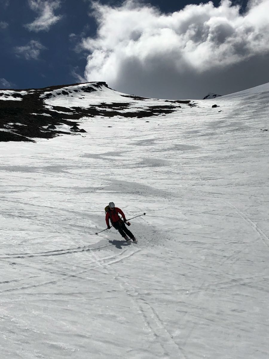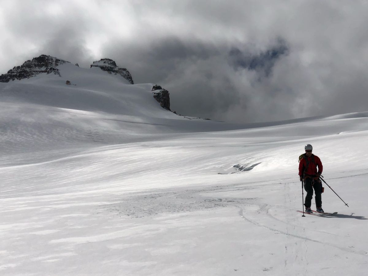 Once into the hanging valley, travel improved substantially with skis-on travel all the way to the summit col. Glacier HS is surprisingly good with 230+ cm probed in most spots. The glacier has better coverage than it did when I was last up there five weeks ago.