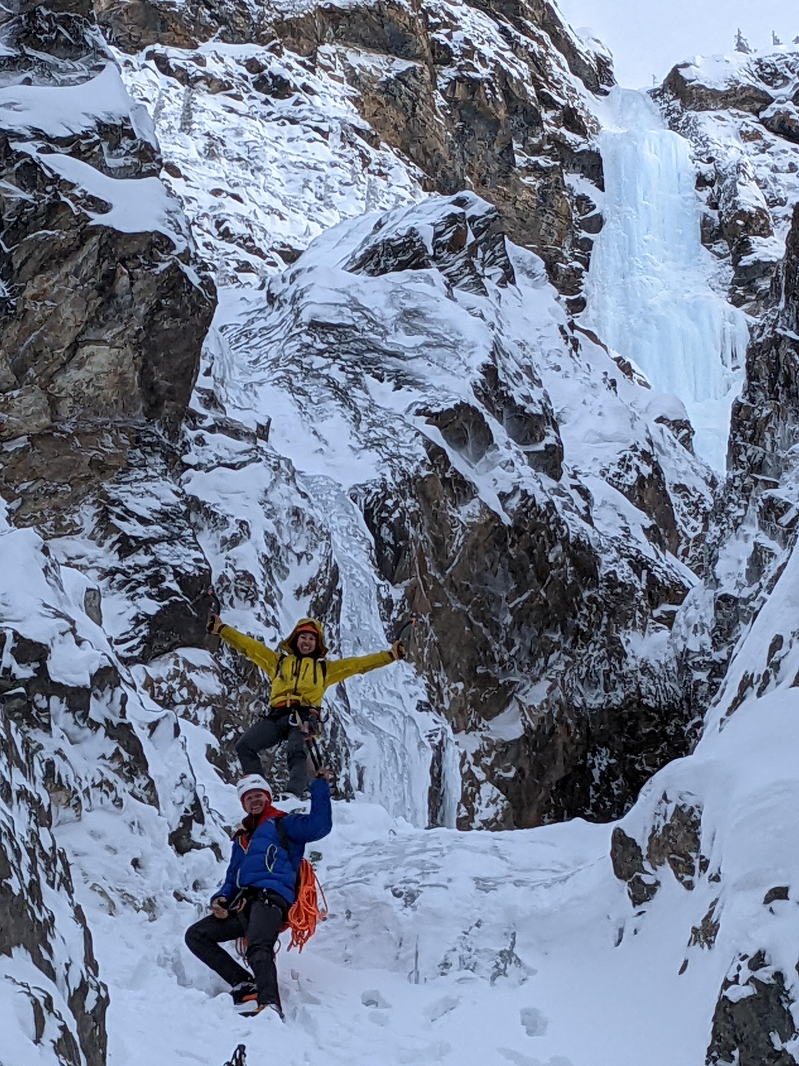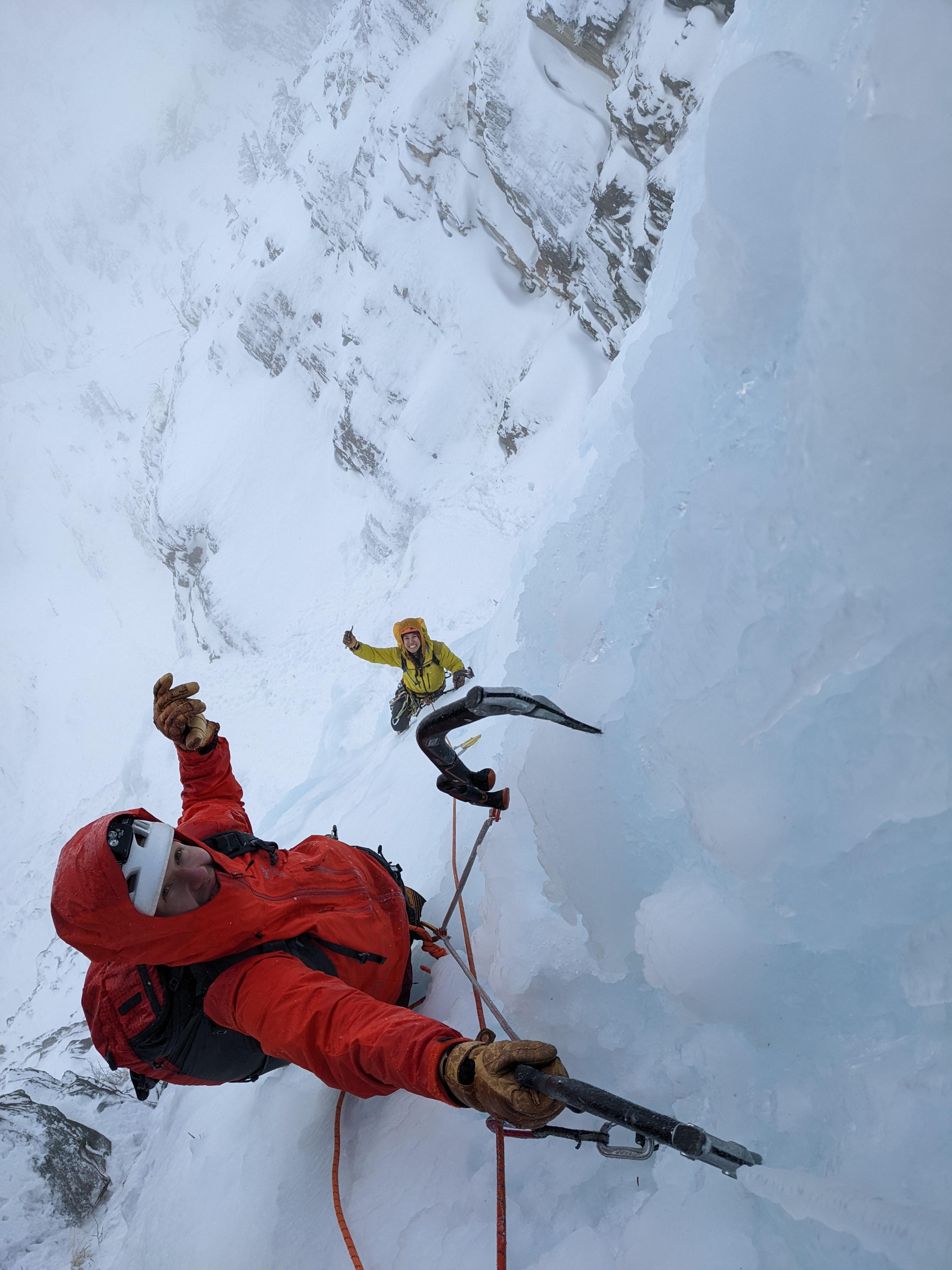 We took advantage of the recent bombing of Superbok and found relatively challenging conditions on the last pitch. Perhaps the snow brought down in the slide adhered to the previously wet ice to form the thick collapsible shell over much of the crux pitch.