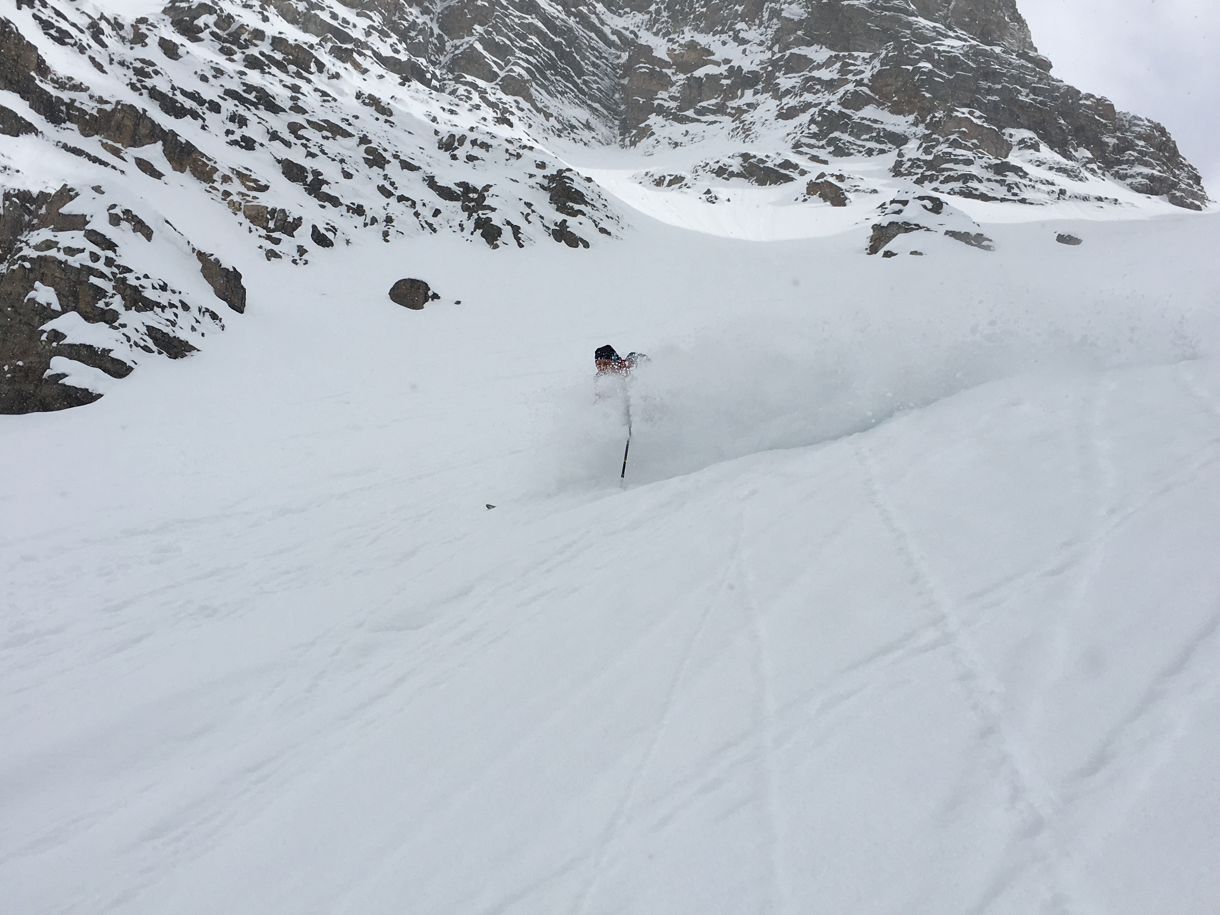 I guided a tour over Surprise Pass yesterday (11 April). The snow was so good on the way over, we couldn't resist a bonus descent off the north side of Saddle Pass. Overcast skies and cooler temperatures kept the snow dry and light without slab properties. Very good skiing for any season on plenty of new snow which overlay a supportive temperature crust at treeline and below.