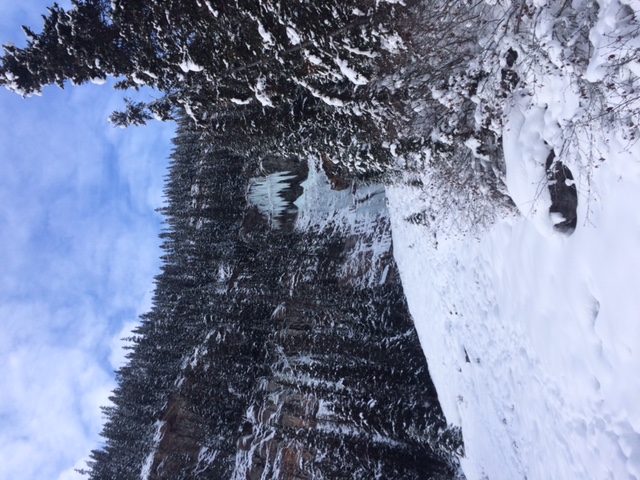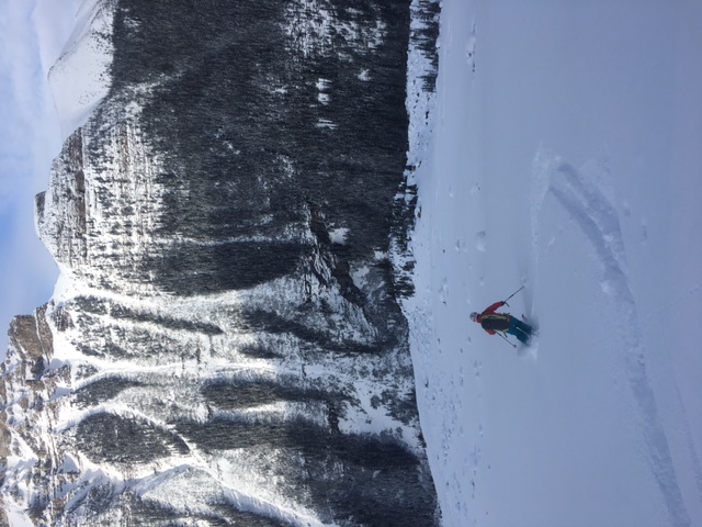 Had a beautiful day at Surprise Pass today. There was no wind and the sky was mostly clear. A few cm's of new snow fell overnight but nothing significant enough to change the ski quality or fill in the many tracks. There was one section mid way down the run where some fresh snow was still available, but especially in the entrance and the bottom the old tracks are industrial. The wind hasn't created any slab in the area we traveled today and untracked snow quality is still good. Overall the coverage is good and the solid base from earlier in the November is still supportive and making travel possible. The lake is not quite frozen over and for those interested in ice climbing, Louise Falls needs some more time. (see photo)