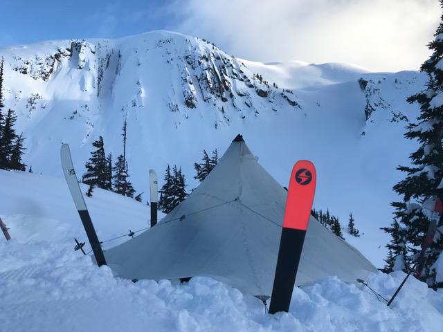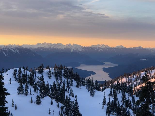 On March 13th, spring arrived! We skied from a treeline camp South of Breakenridge out to a logging road high above Harrison lake. It was warm, clear and calm. The snow turned wet and we reached snowline on this south aspect at around 700m
