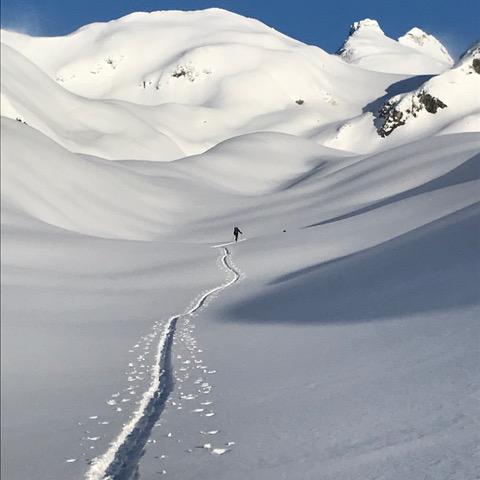 There was surprisingly little evidence of avalanche activity. The glaciers have 3-4m? of coverage. The recent storm snow hadn't settled but appeared to be bonding well. On March 13th there was plenty of pin-wheeling, and snow bombs off the trees were a concern!