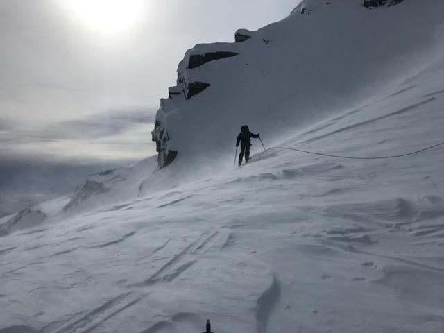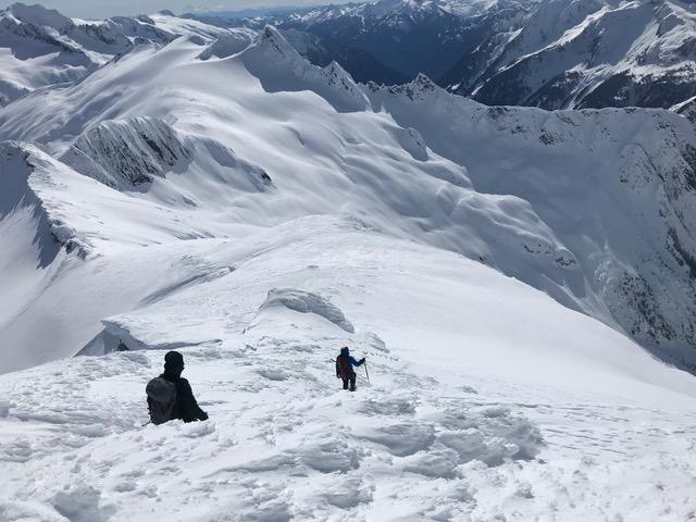 We were heli-dropped at Treeline under Vista Pk in bad visibility. On March 11th it was clear and cold,( -12°) We skied onto Vista Glacier and ascended Surprise Pk. and a sub-peak to the south. On March 12th, we skied southwards along the divide ascending over Traverse Pk and Mt Breakenridge . The winds were very strong from the NW and it was wintery and cold.