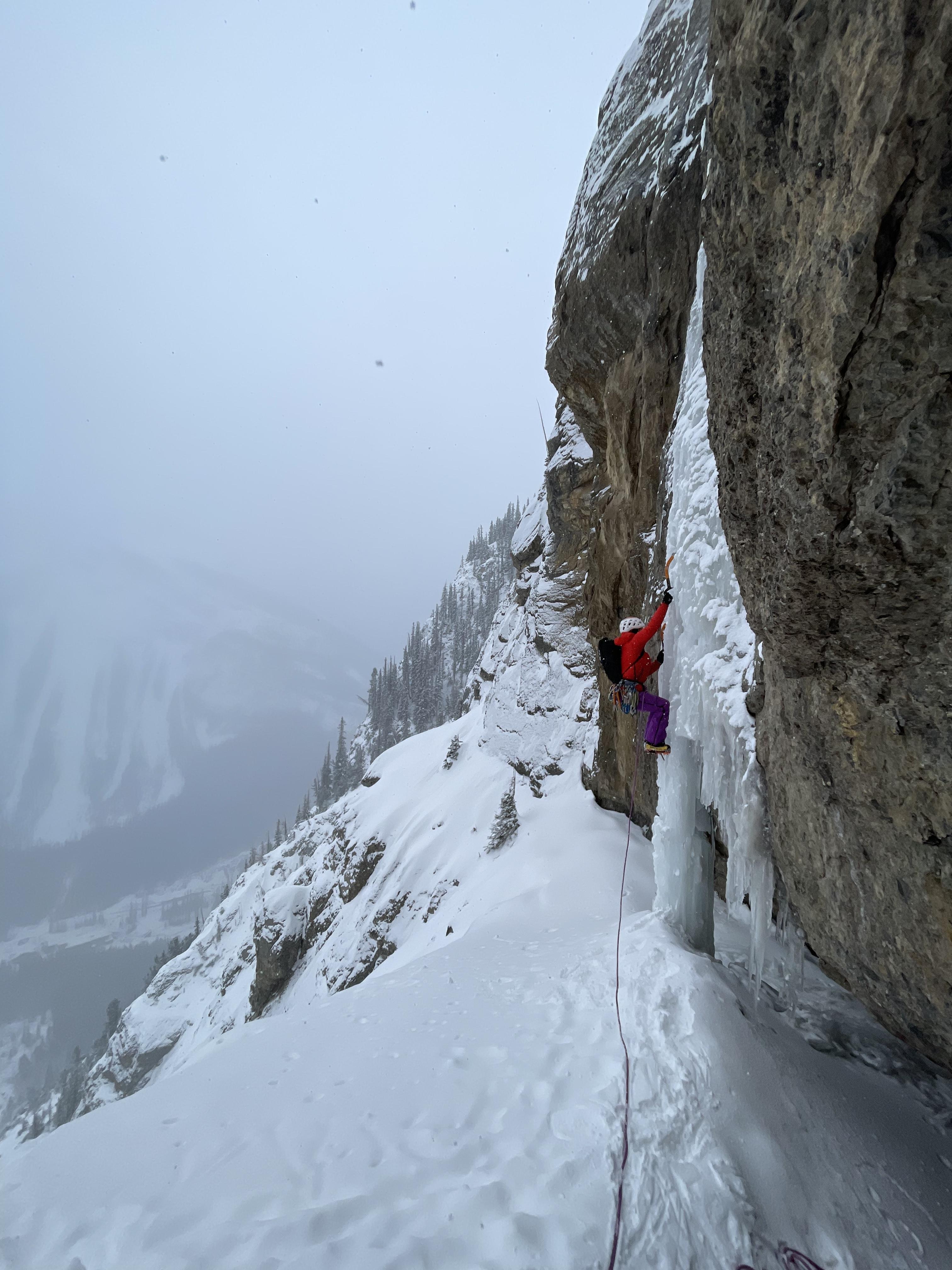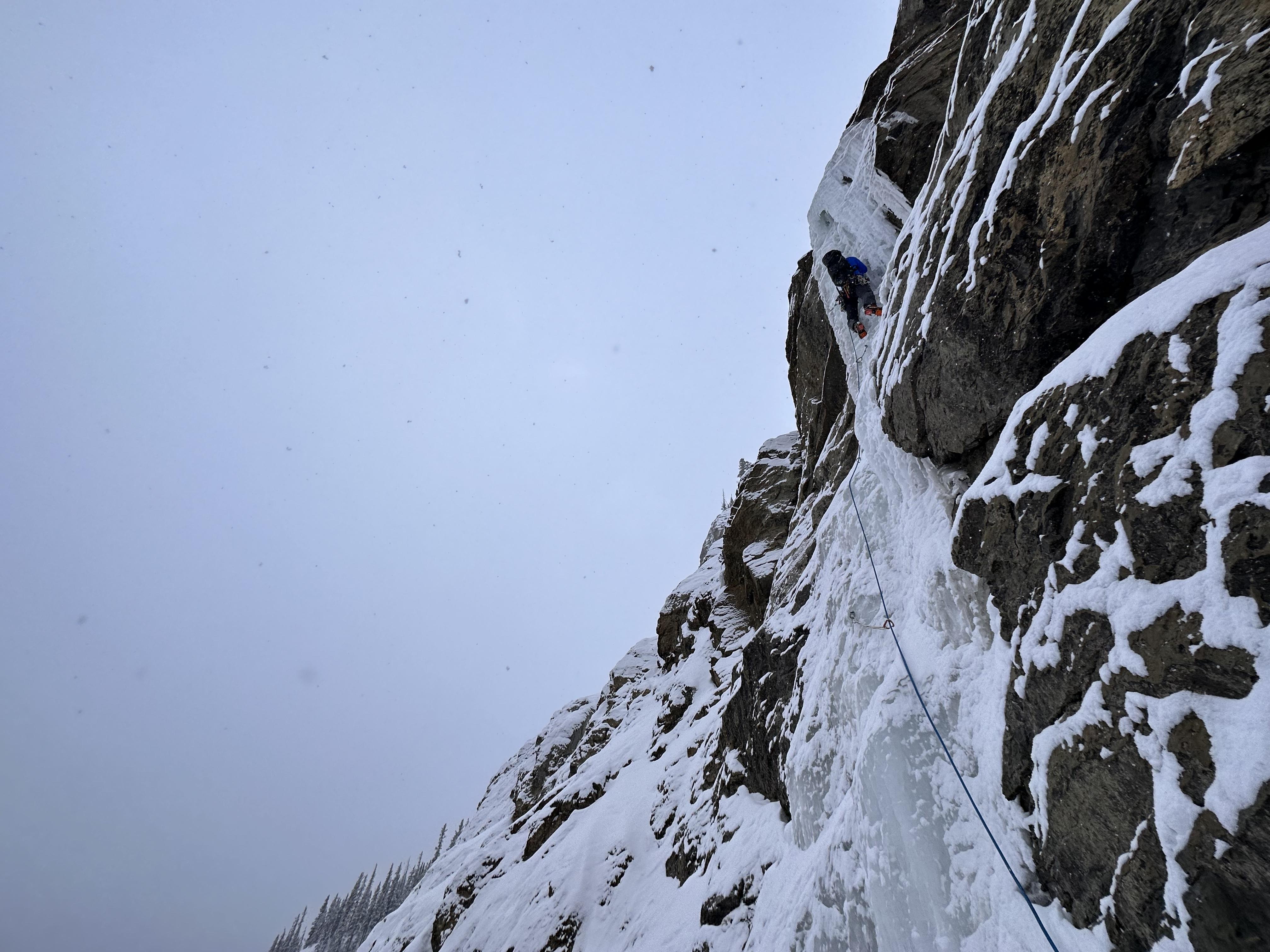 We climbed all but the last pitch of Bourgeau Right Hand today. Temps warmed to a balmy -18 and though we saw the sun a few times, most of the day was overcast and snowing very lightly (about 3cm total accumulation), very light wind. The pillar on the crux pitch has broken but is still in place to provide good foot placements. Overall the route is thin and a few stubbies can be useful. With the recent new snow it’s often easy to swing into rock in places you would be expecting ice. All anchors are visible. There is a well packed trail on the approach and up to 20cm of recent storm snow. For the most part the new snow is still low density and we only observed a few pockets of soft slab on the ledges between pitches, but no cracking or reactivity. Two good sized spin drift sluffs came off the steep rock walls towards the end of the day.