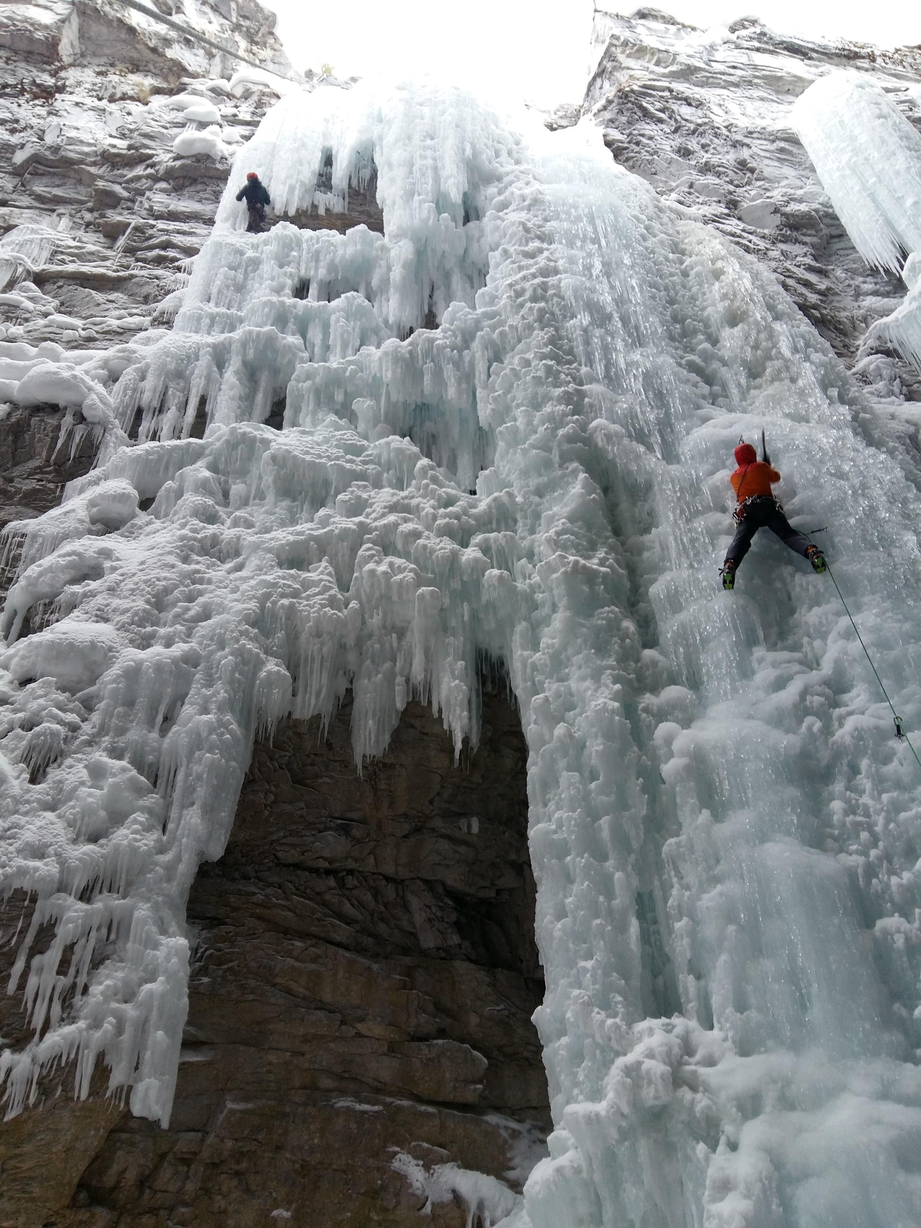 A couple of tourists with no climbing gear somehow downclimbed the WI 2 exit at the end of the canyon and then got stuck trying to climb back out. This is not recommended!