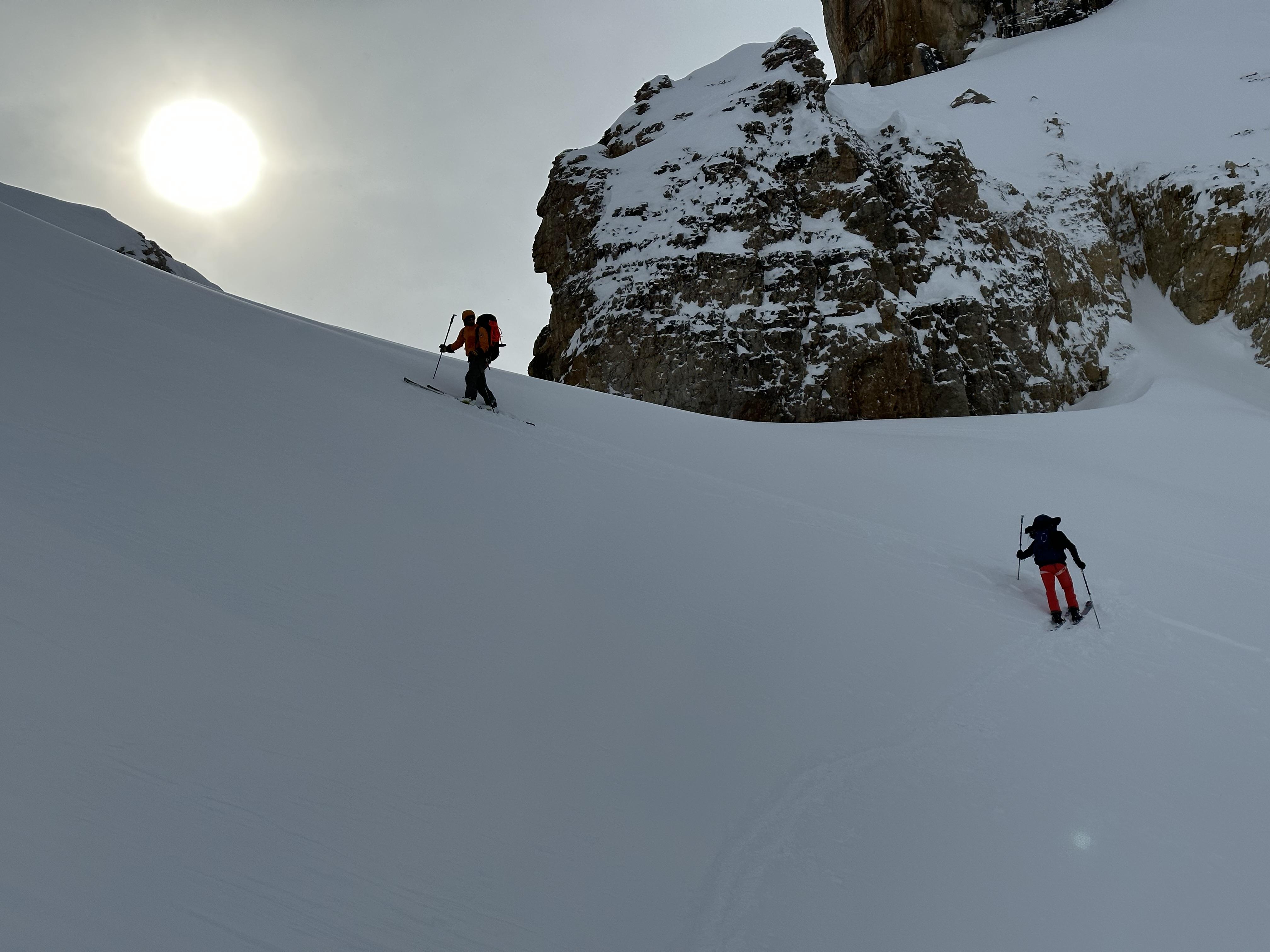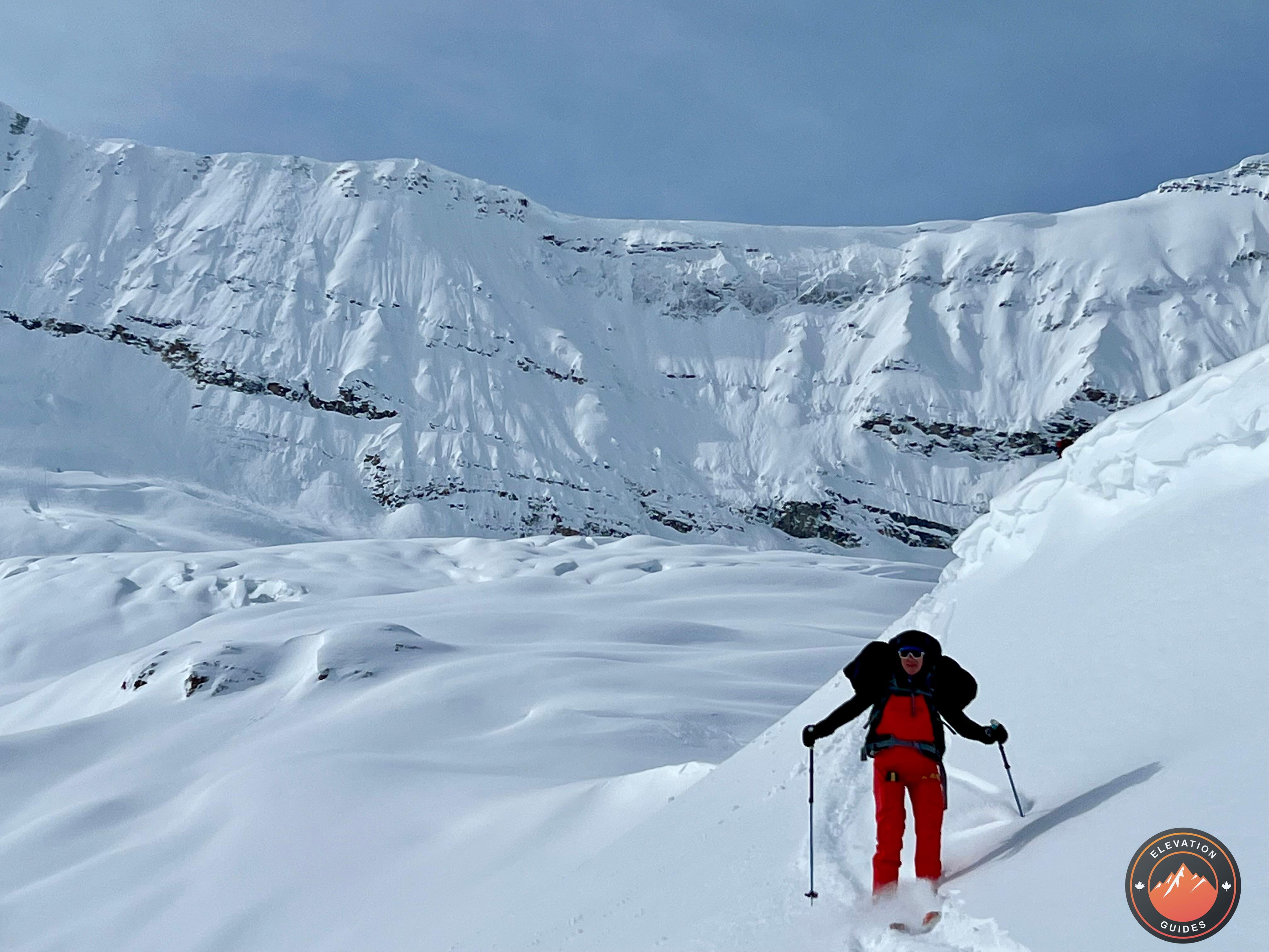We were heli-dropped just north of the park boundary. We climbed up to the des Poilus-Collie col and then had a challenging descent in full whiteout with a cornice hazard and reactive wind slabs.