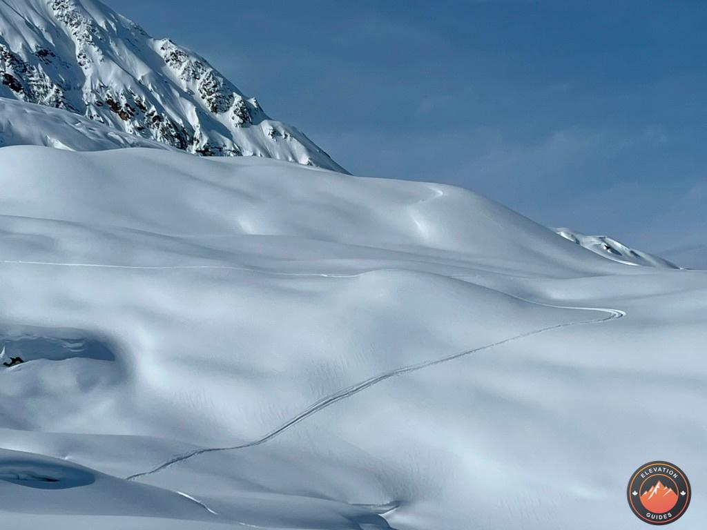 We did a bonus run in a Mt. McArthur SE facing slide path. Most of these paths slid previously on the deep PWL which eased our overhead hazard concerns. Skiing was very good with up to 30 cm of low density powder.