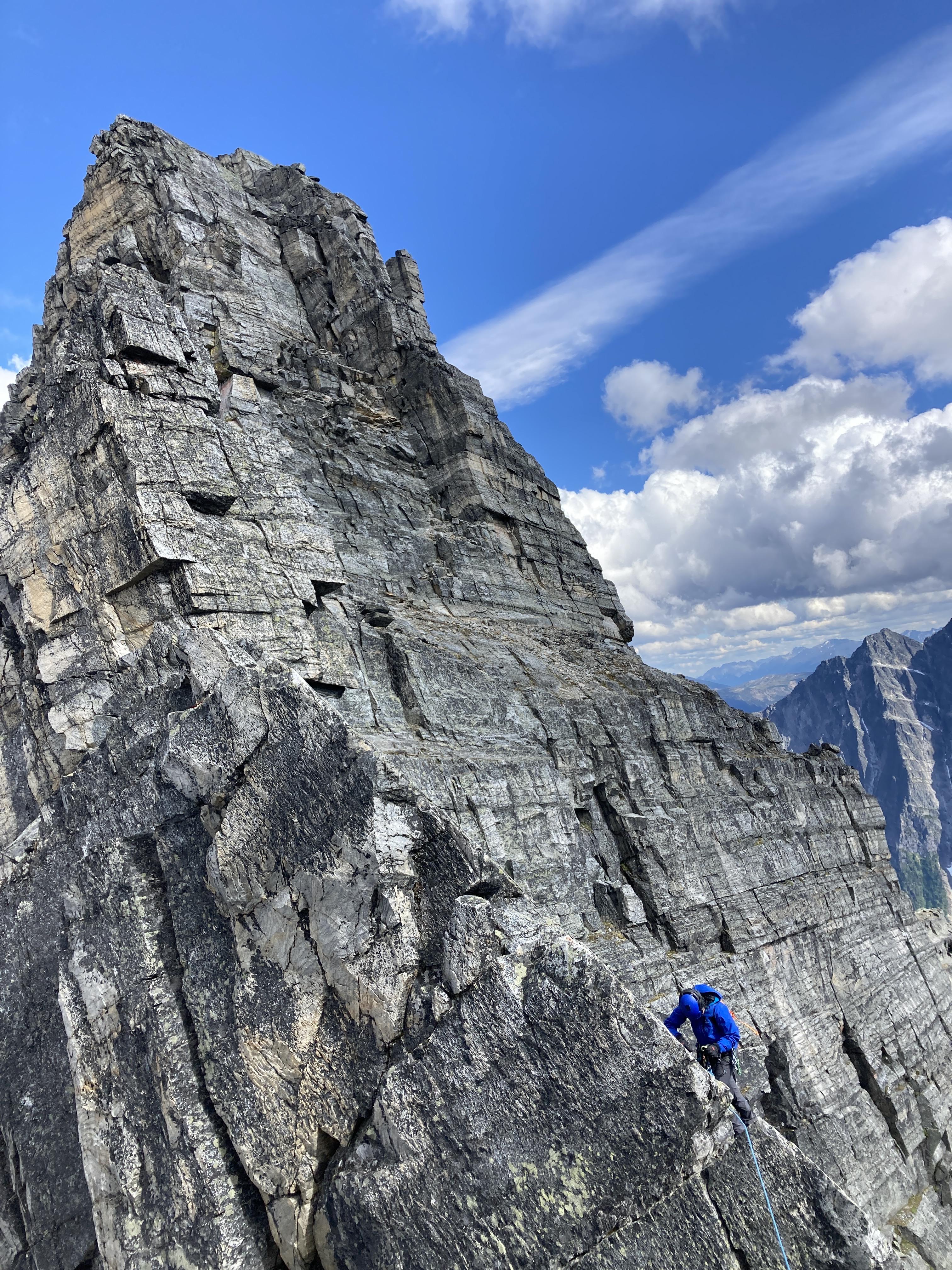 We climbed the West Ridge of Tupper and the NW ridge of Sir Donald this week. Conditions changed dramatically over a few days. We backed off plans to climb Sir Donald due to new snow and verglas on Aug 9/10, but summited a few days later after rain and sun melted much of it back.