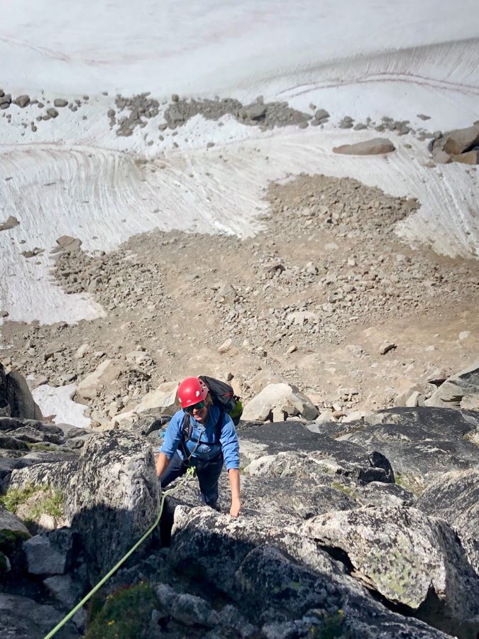 As best we could, we minimized our time under boulders on ice and approached and descended laterally, traversing in from the side, not stacked on top of each other and in the line of fire.