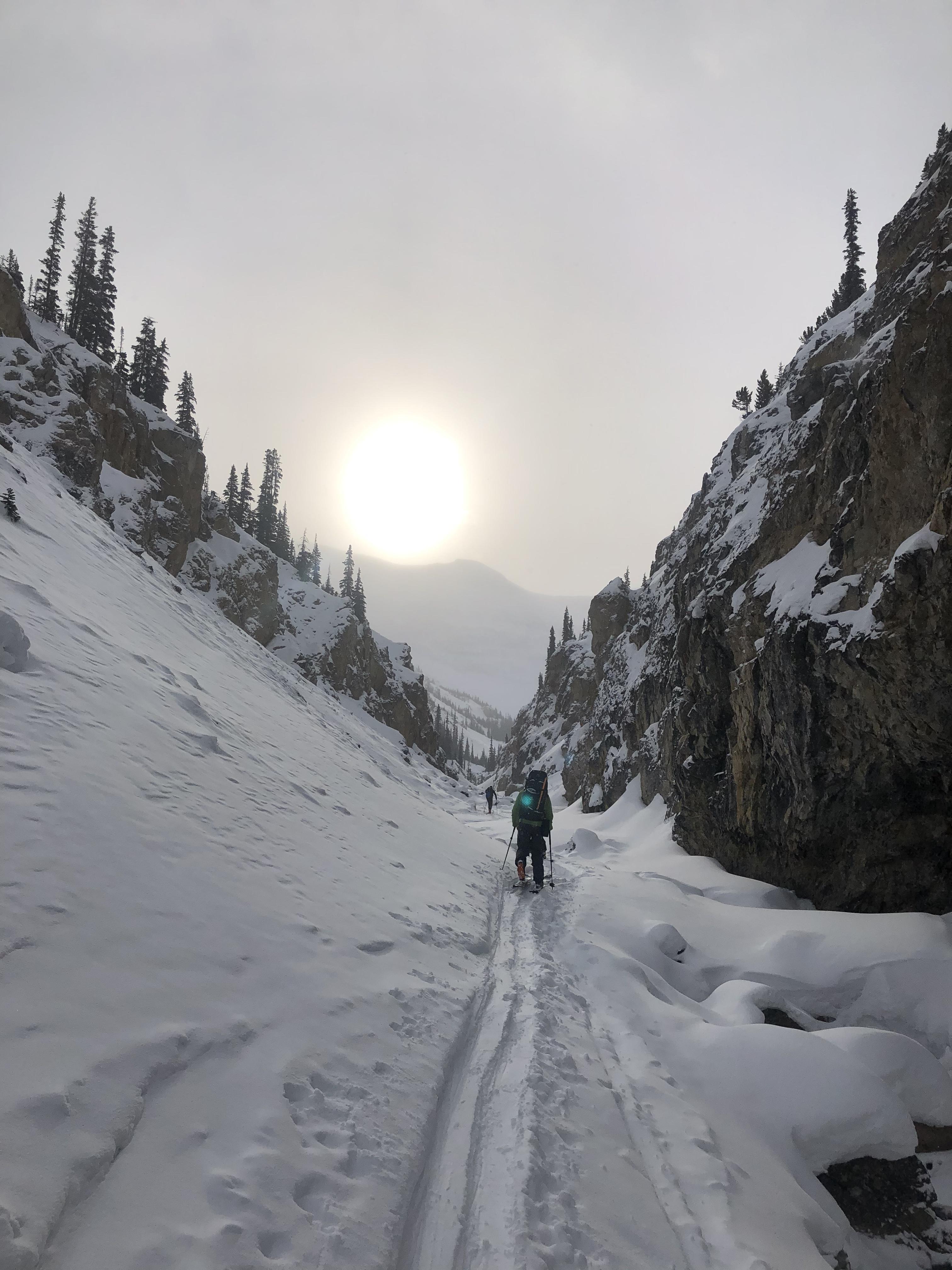 Still early season with about 20cm on the valley bottom approach with lots of rocks and other hazards.