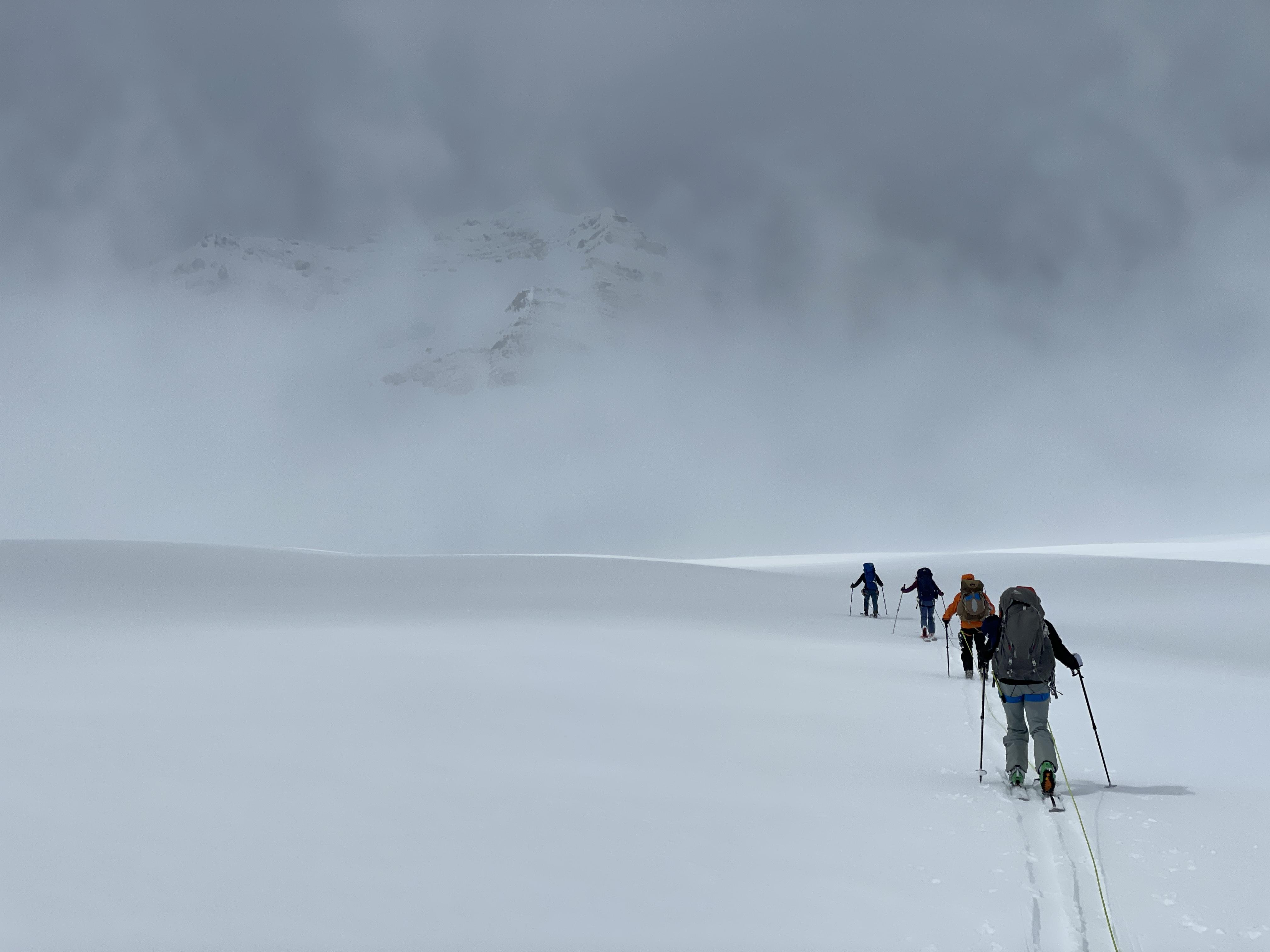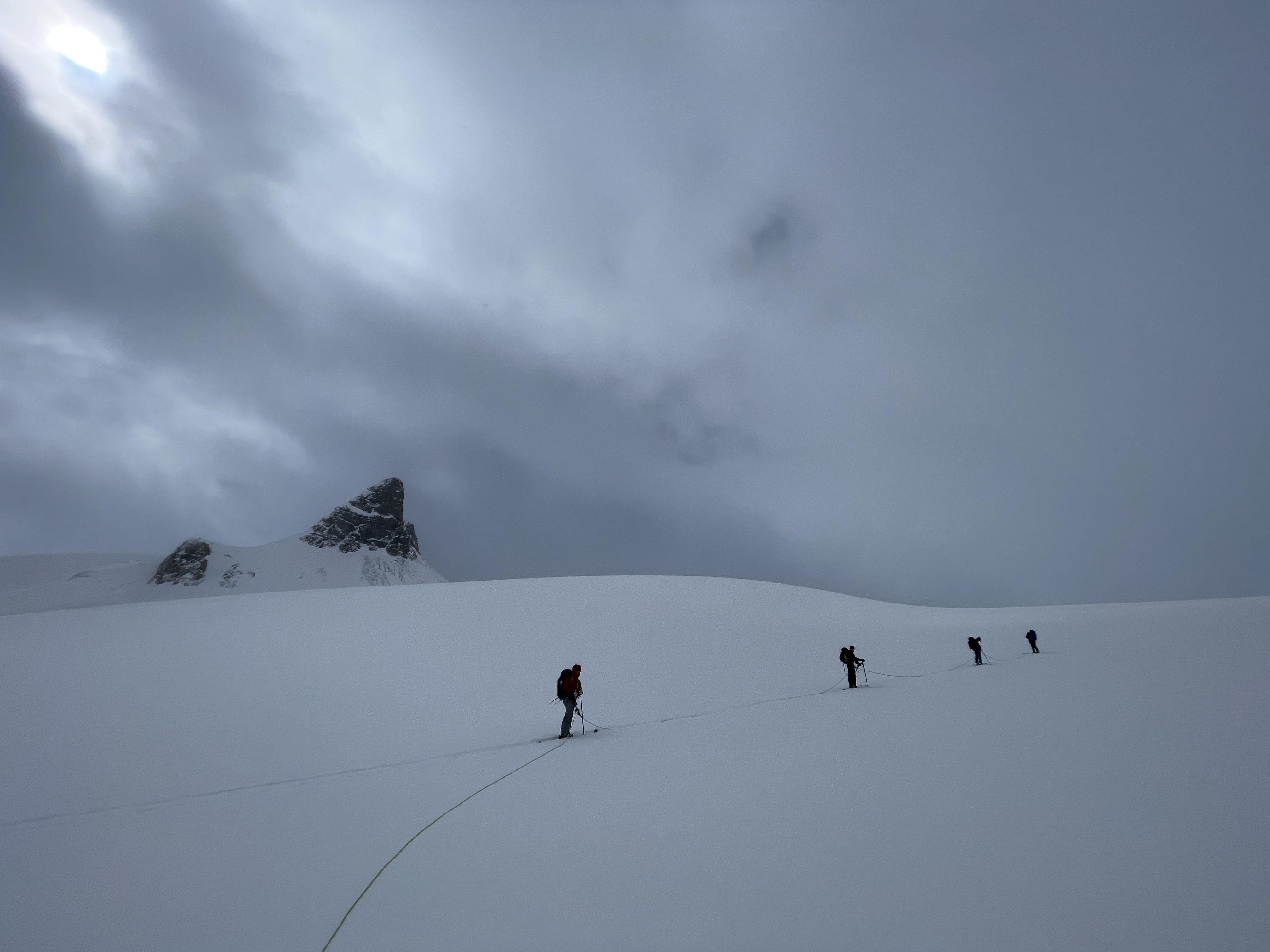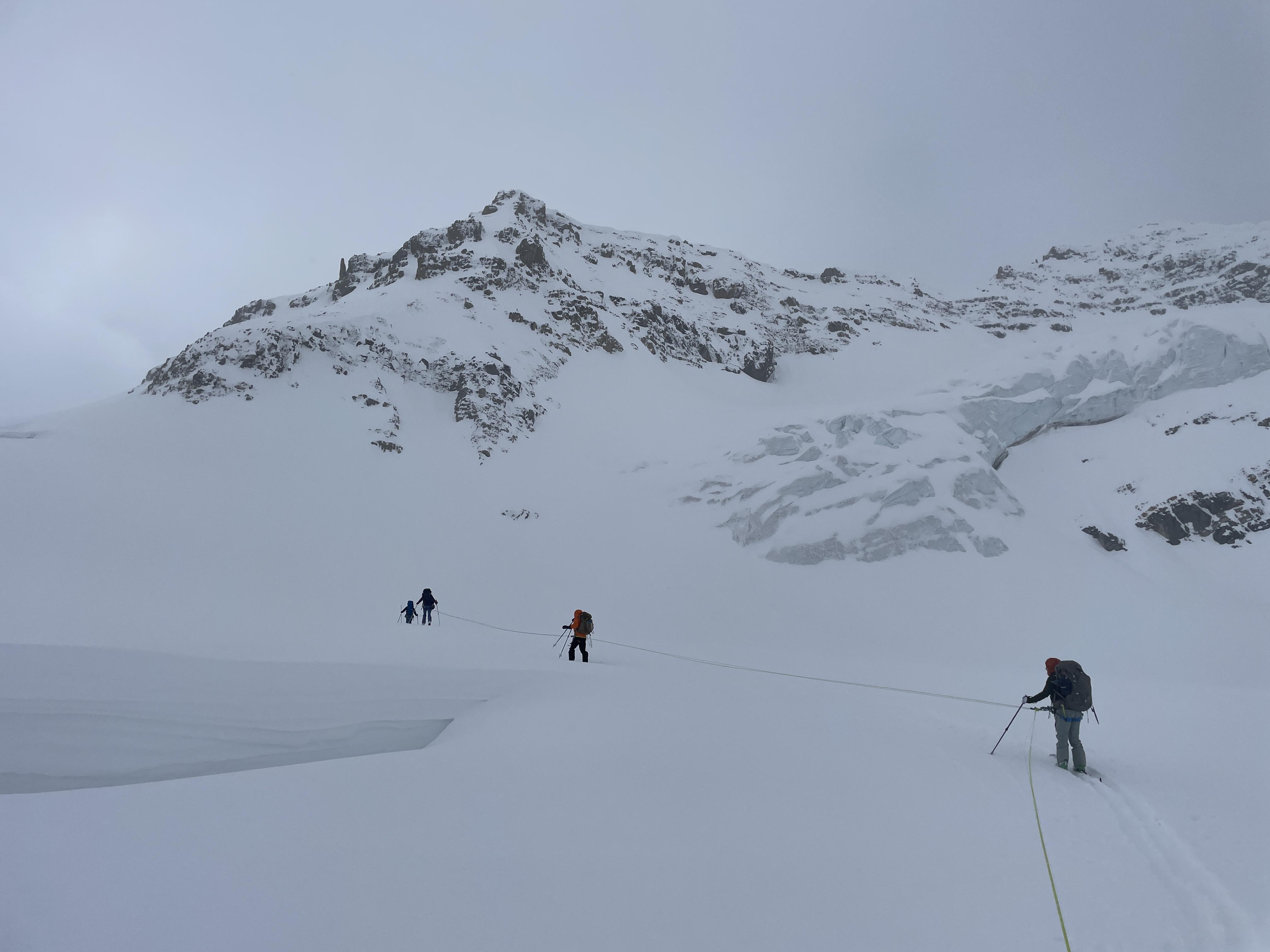 We used ski crampons across the narrow ridge to the Guy Hut in reduced visibility and also kept the rope on for the narrowest section. We also wore ski crampons while ascending the final couple hundred vertical metres to Isolated Col due to low density snow on a crust. This allowed for easy and secure skinning to the col.