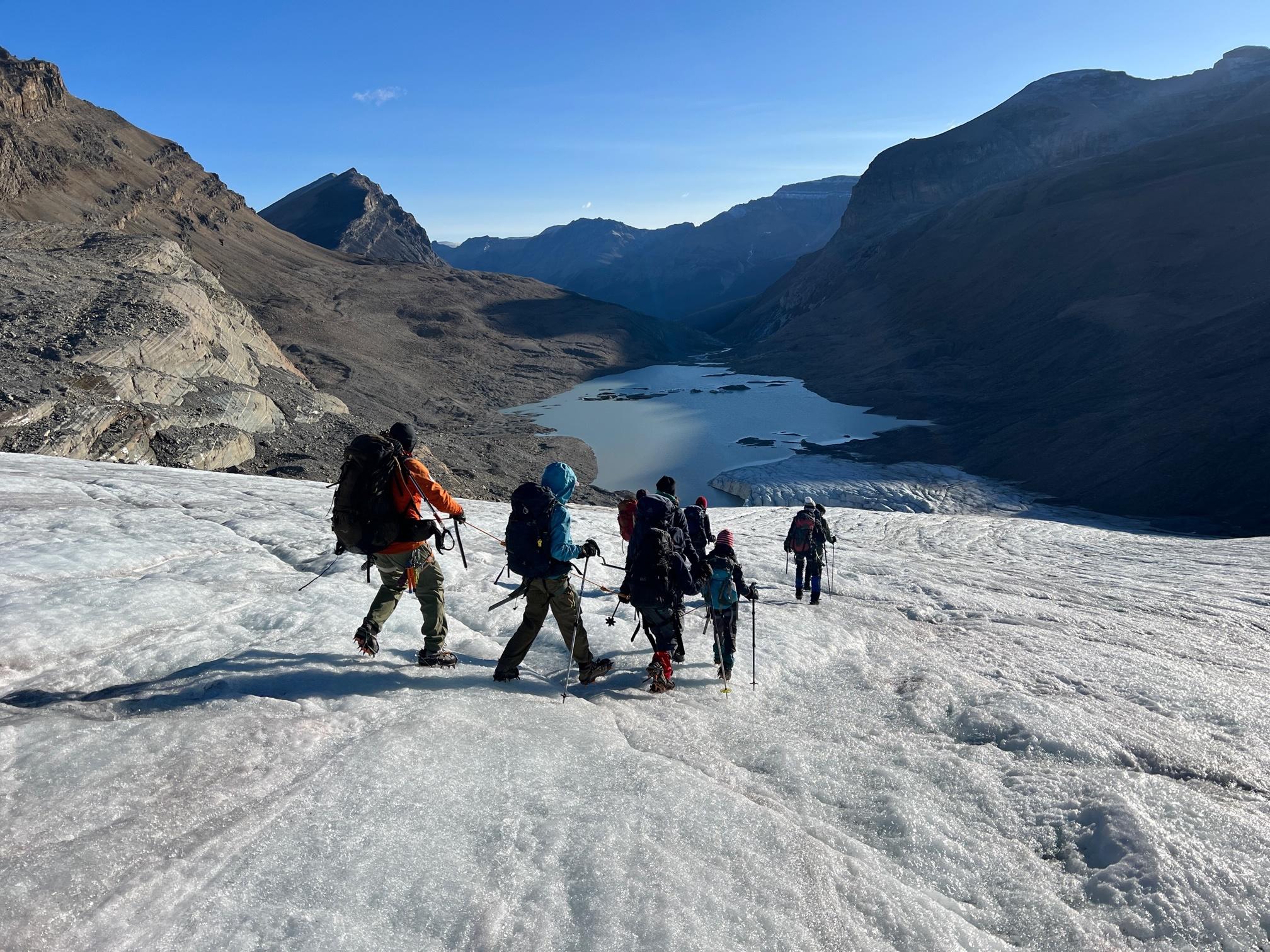 2) Since the end of June 2022 (and as previously reported) it is no longer possible to exit from the Peyto Glacier tongue as it ends in a large glacier lake now. Rather one has to depart the glacier higher up and traverse descender's left above a rock cliff (see image taken from close to Peyto Hut). Sometimes the descent from there requires 50-60m of downclimbing in snow. Alternatively, a friendly colleague has established a rap station with two bolts. Currently, however the descent is easily negotiated in a water-carrying gully between the melting snow field and the rock buttress (see image).