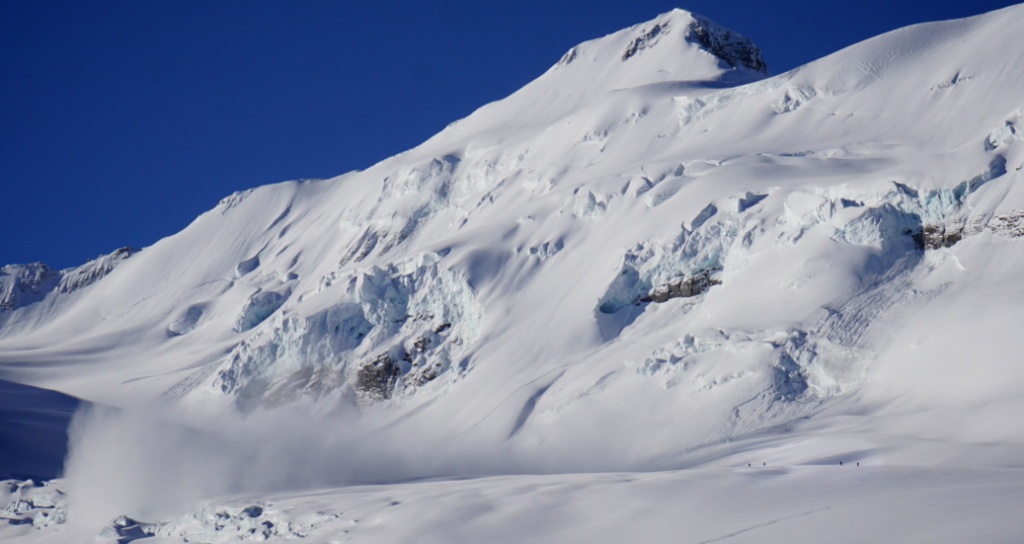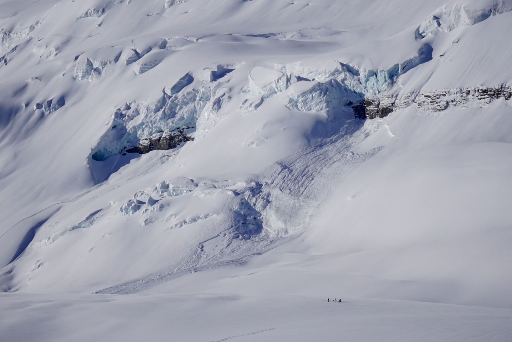 On Mar 18th we witnessed another party using the upper bench on the Balfour hicol route & they ended up being very close to an icefall event around 9:00 AM. The day started clear with very little wind, and there were already two fresh icefall slides on the East face. While we watched the party approach the upper bench, we noticed another icefall triggering a slab avalanche and the powder component was very close to the folks from what we could see. We had a brief exchange with them around 9:30 as we approached the hicol route via the lower bench. They had elected to head to other areas and were retreating from that route. We continued along the lower bench, finding a route well away from the run out potential of any further icefall, and were also happy to find a nice, solid bridge over the big crevasse under the main icefall. No more activity was noted by the time we exited the area at 11:00 AM, and by then a cooling breeze was keeping temperatures at bay. The observed icefall had pulled out a slab avalanche with a fracture of up to 1 meter deep in spots, and had run a fair ways across the flat ground, no doubt due to the ice component. Photo credit: Calen Sacevich.