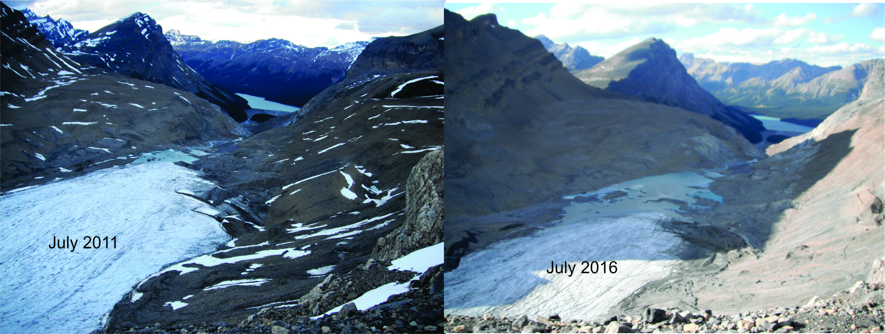 Some interesting new small islands of rock have melted out near the base of the ridge of Mt Thompson over the last few years. As well the toe of the Peyto glacier continues to lose volume and the lake near the toe has grown significantly since the last picture taken In 2011.