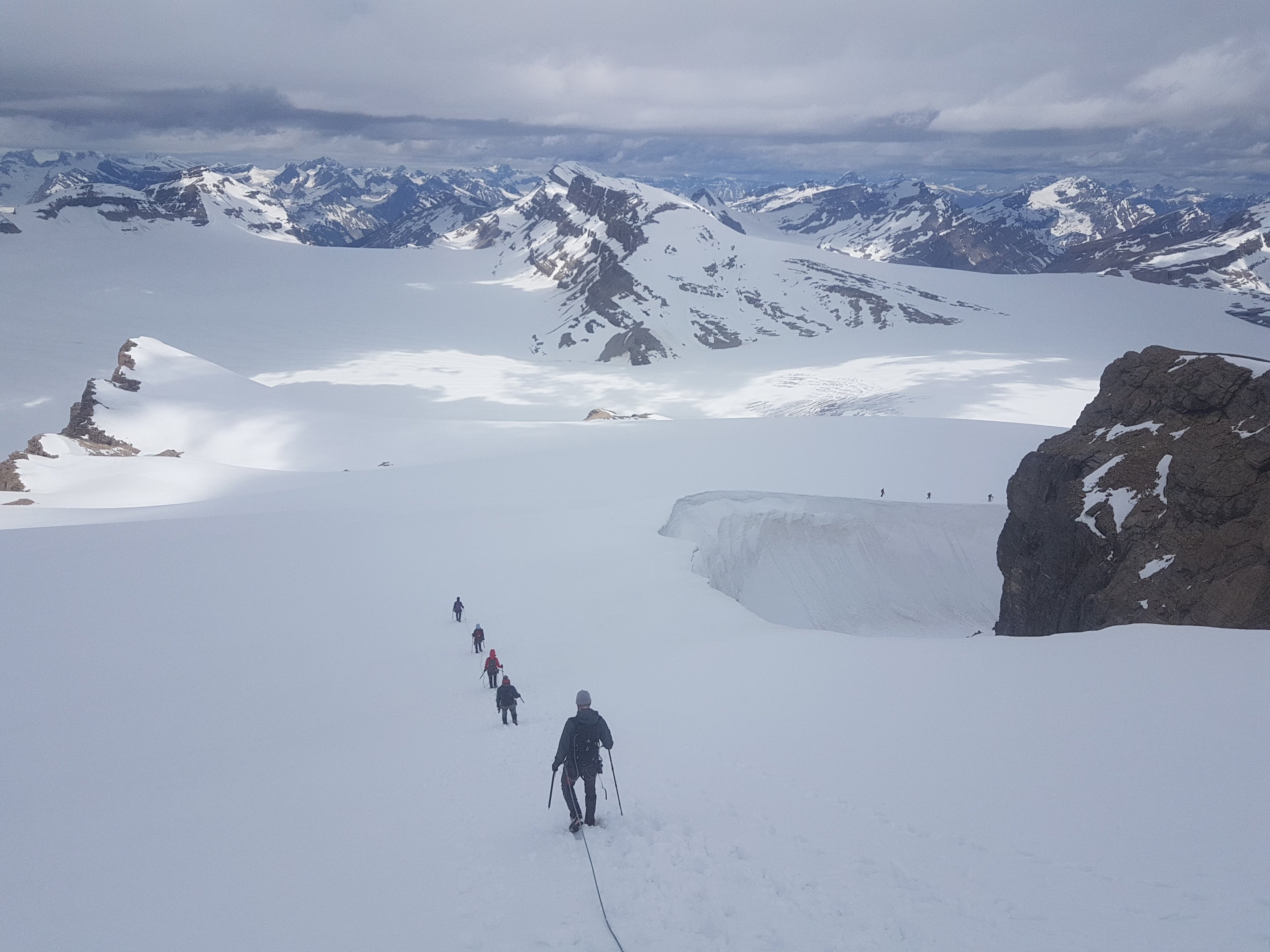 I just returned from a 6 day trip to the Wapta ice field based out of Bow Hut from June 9-14 with Yamnuska Mountain Adventures. During our trip we made ascents of Mt. Olive, Mt. Gordon and Mt. Habel via the regular routes. The approach trail to Bow Hut is now snow free below tree line on the normal summer approach. Above tree line there are still some lingering snow patches to cross. The Glaciers on the Wapta Icefield are still quite snow covered with an average snow depth of 220cm. We experienced quite unsettled weather throughout our trip with a mixture of sun, cloud and a few warm rain events that sprinkled rain all the way to the mountain tops. We experienced good travel conditions on the glacier in the early mornings and boot top foot steps in the afternoon that made wearing waterproof gaiters a necessity to keep the wet snow out of our boots.