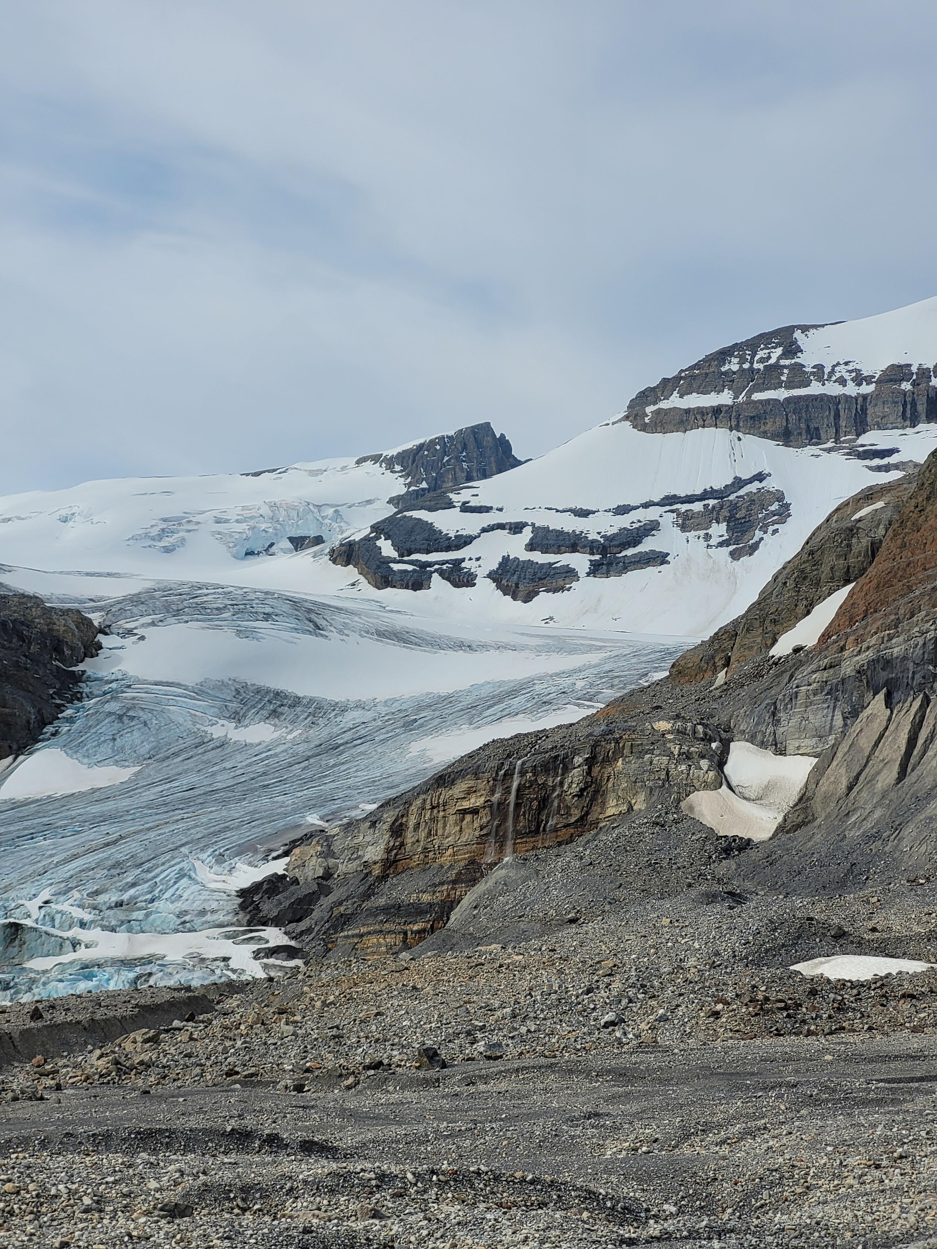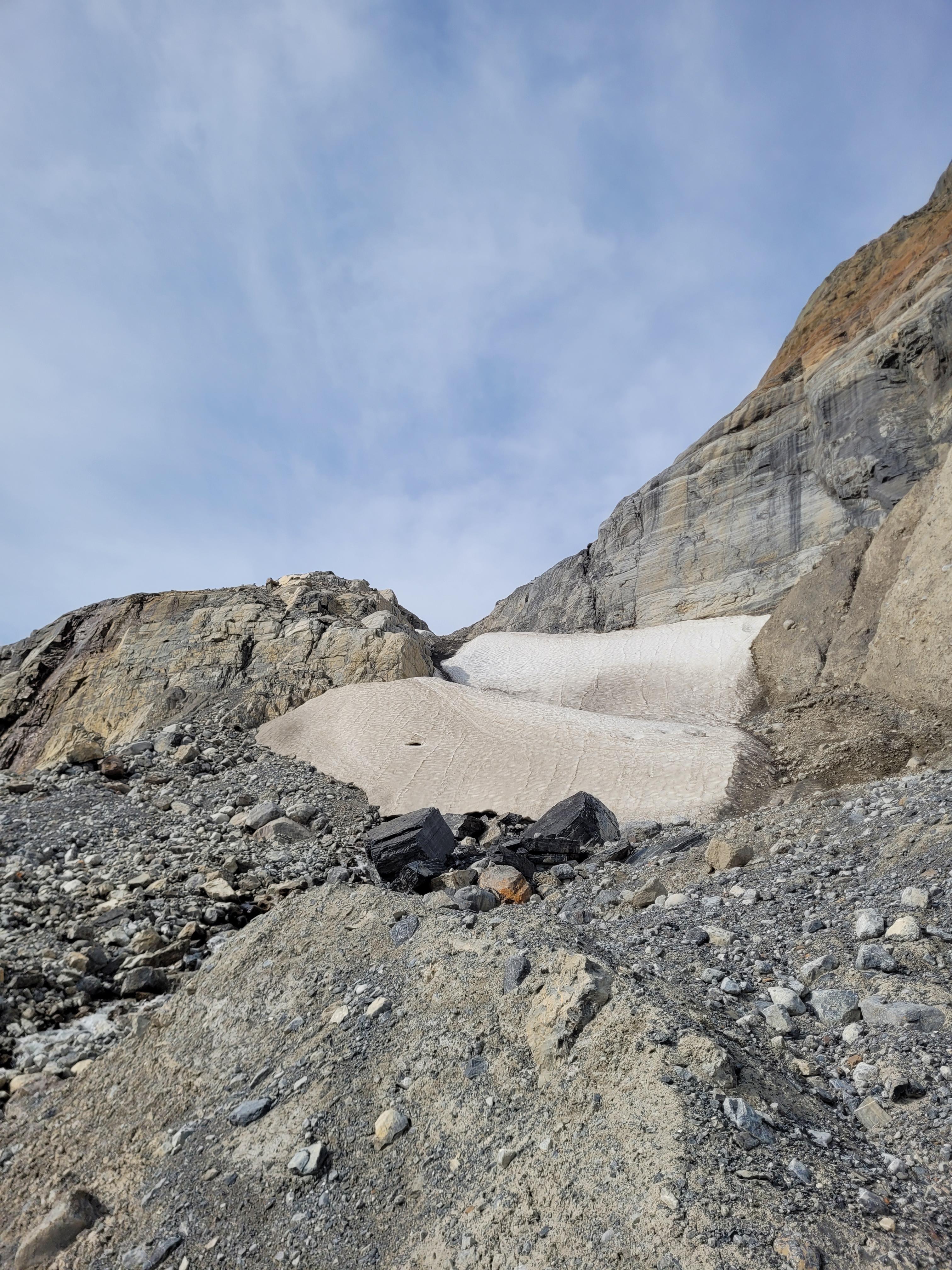 There is plenty of snow at Peyto hut to make water, ACC staff flew new shit barrels and checked propane. From the hut and out, travel is easy on dry glacier. We exited the glacier high, skiers left, at the one obvious ramp bellow headwall. Cairns are in place and lead left to a snowy gully that breaches the lower rock band, see 2nd picture. There is a bolted rap station there now, left corner of snowpatch, l used it to lower guests 25m then walked off the snow skiers left. If the gully is snow free, it's a simple walk down. River crossing was easy, water levels are lower than anticipated.