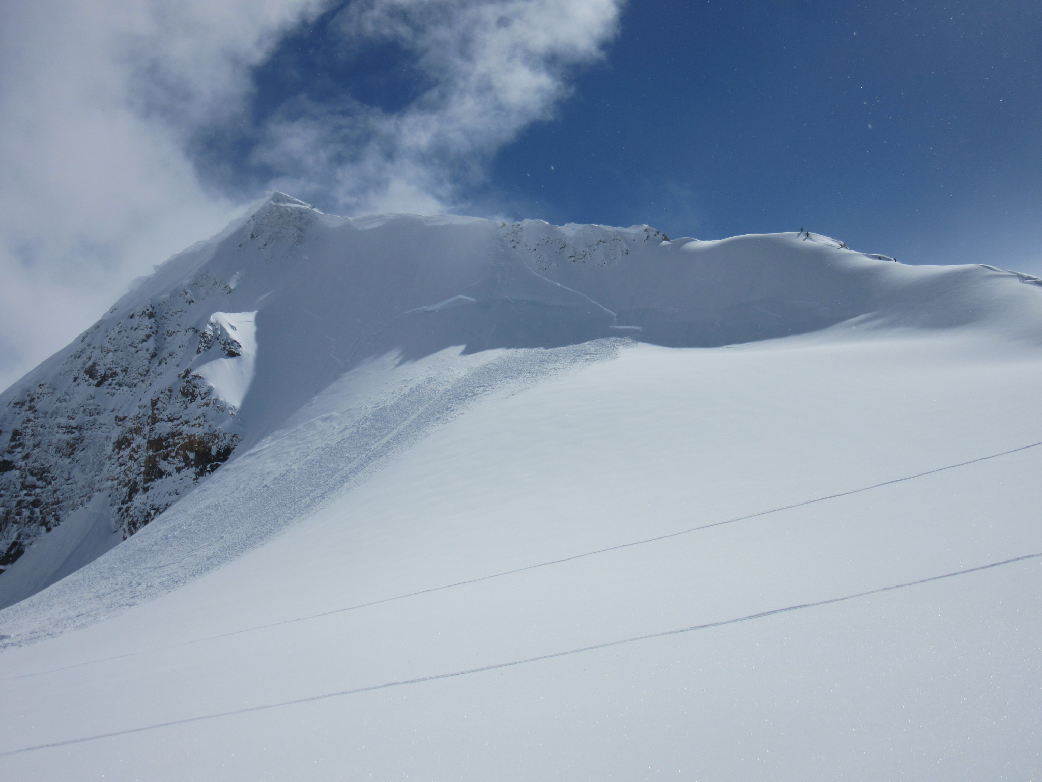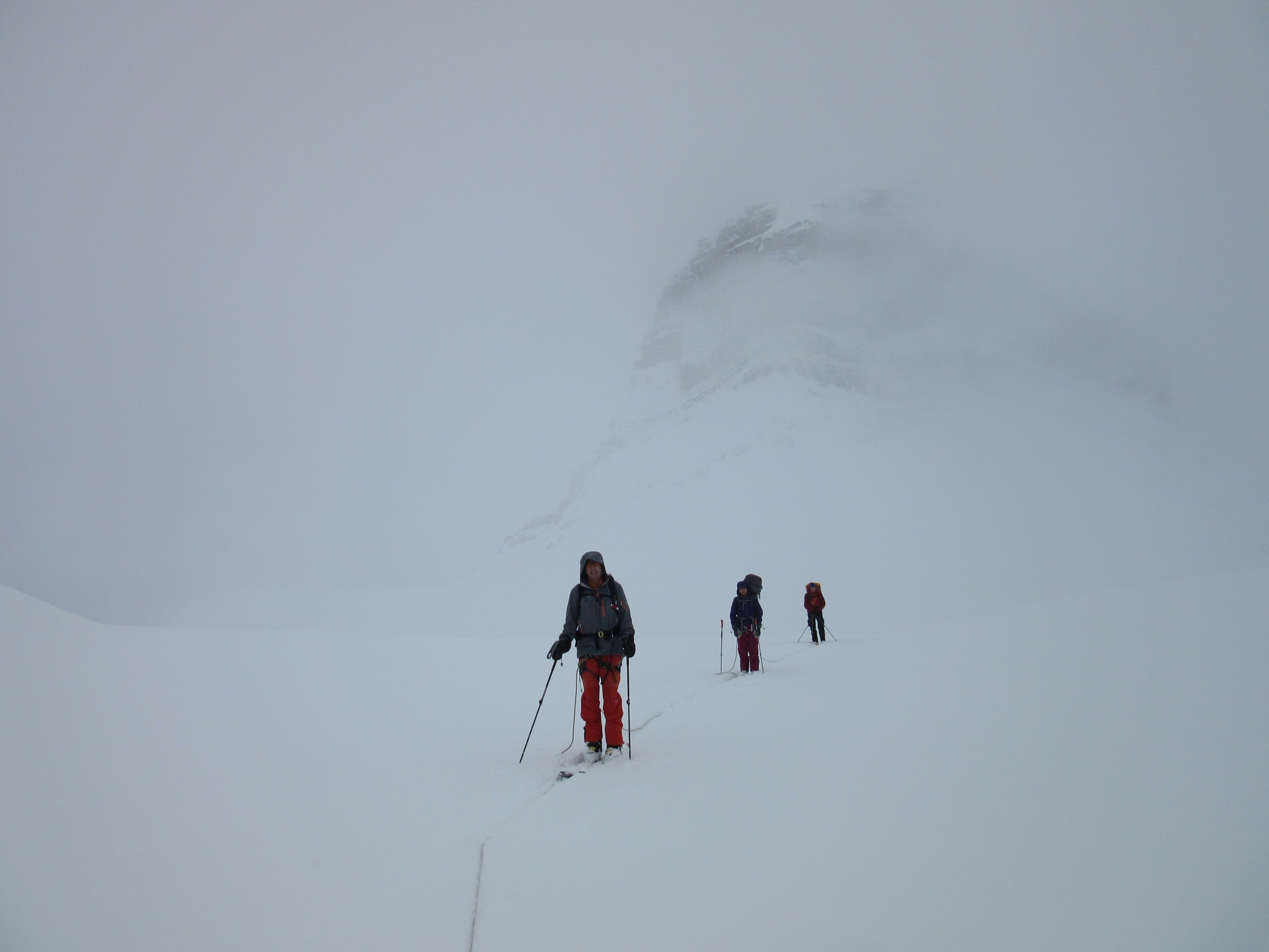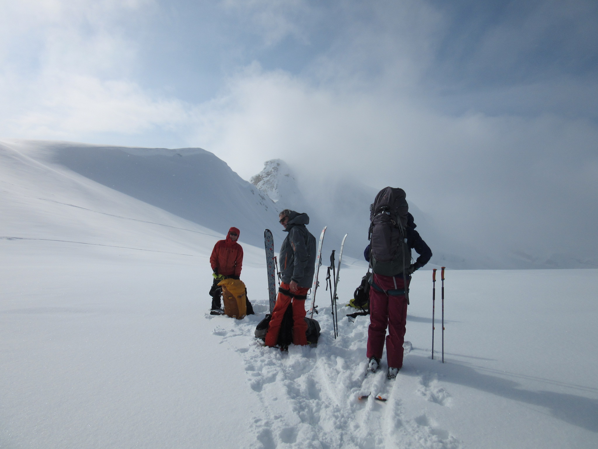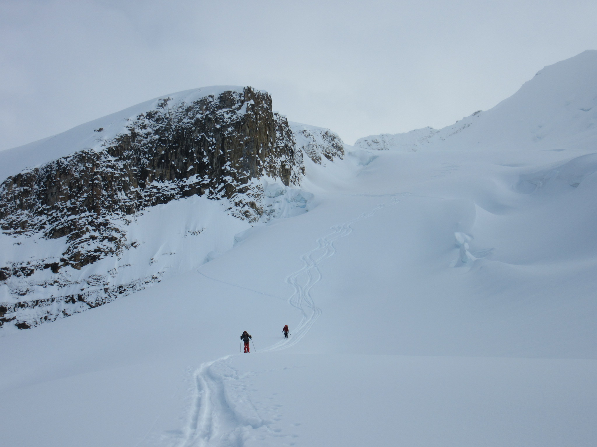 Unsettled spring weather with various amounts of snowfall every day, bad visibility and only short periods of clearing skies Monday and Tuesday afternoon. The new snow accumulated to a max of 40 cm in wind protected locations and seemed to bond well to previous interfaces. Strong south-westerly winds that died down Thursday morning in combination with the low density new snow probably created wind slabs in lee features. The skiing quality was good throughout the entire trip, even skiing down Peyto Glacier yesterday afternoon after the wind event the previous day and night. The snow got moist around 2100 meters yesterday afternoon.