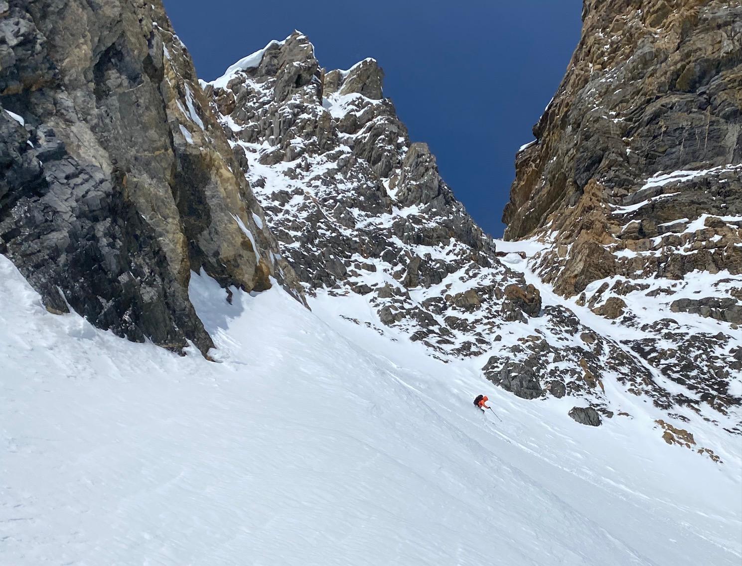In addition to parts of the regular route, we skied the Vulture Col to Balfour hut option and the Diableret Glacier. The coverage overall was very variable ranging from 50cm on glacier ice to 340cm+. The snow quality was good. From a distance, we observed lots of open crevasse and thin coverage on the route to the Mt-Olive St-Nicholas Col.
