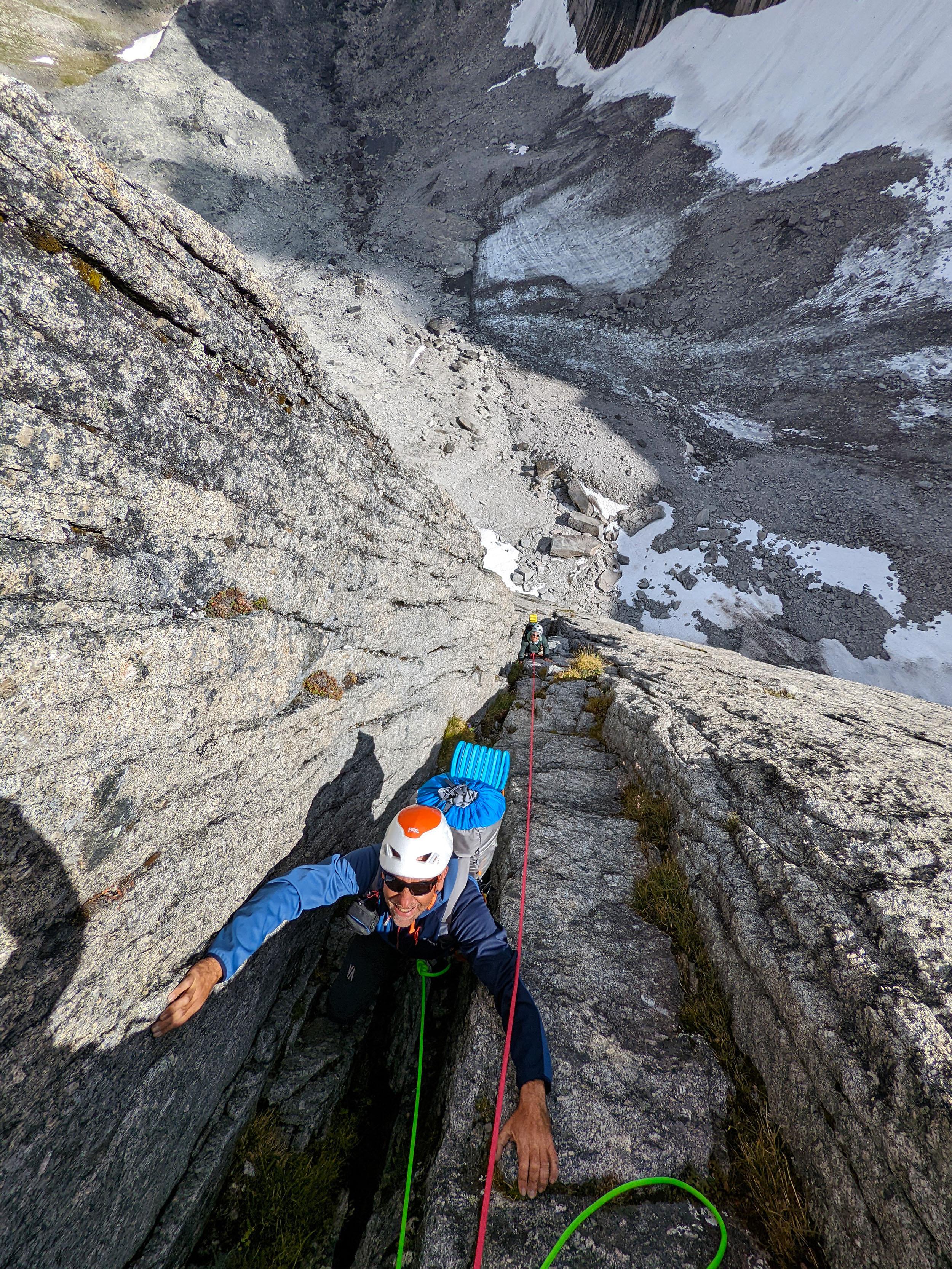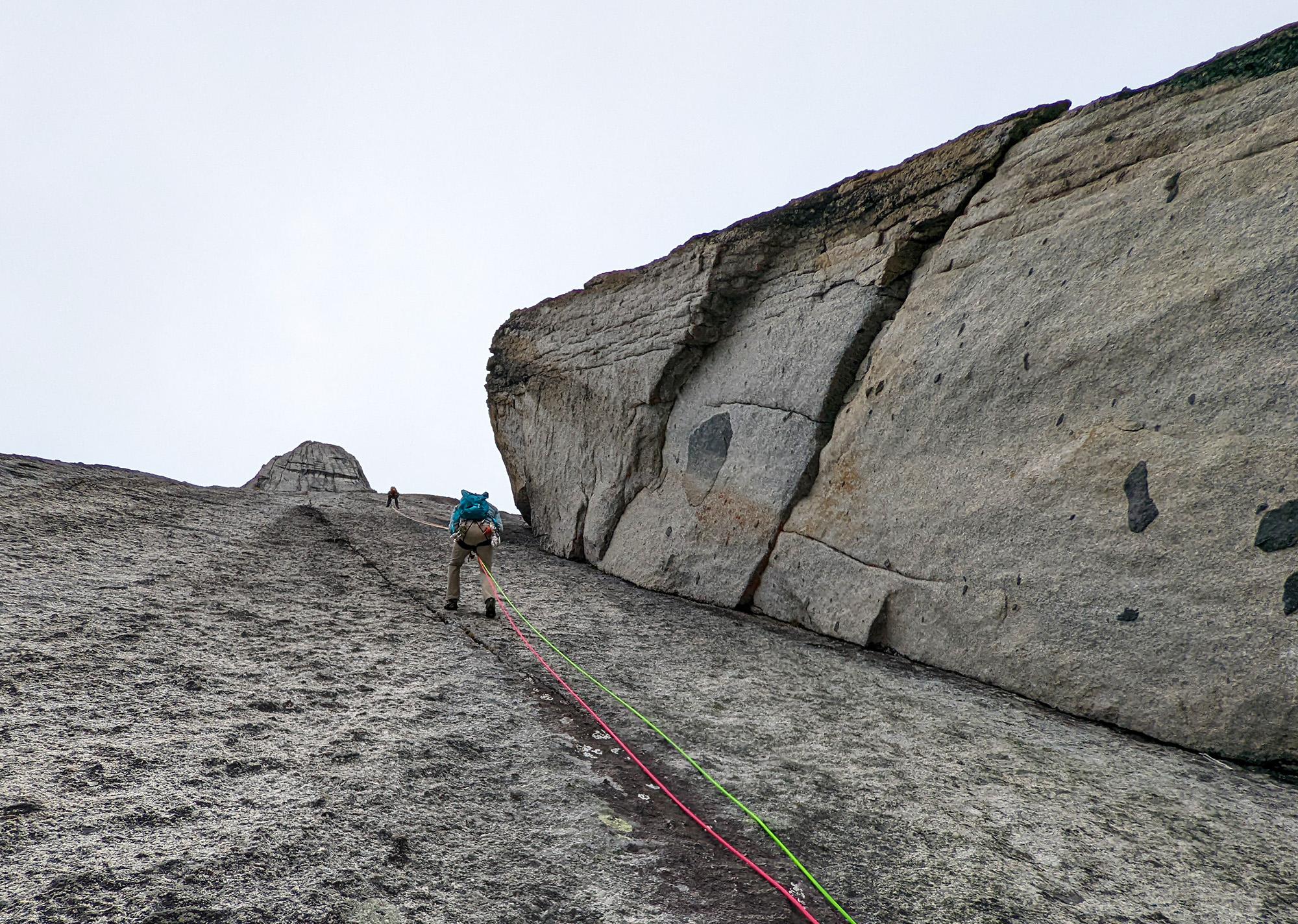 As expected, we encountered wet and slimy cracks on the first 3 pitches. The chimney pitches to the bivouac ledge also sported some wet crack. The pitch 10 bivouac ledge was dry and more than comfortable with a party of 3. Wetness led way to dampness on the headwall above, some of the thinner initial cracks still being a little dirty. On top of pitch 13, it started snowing lightly and cloud cover was dropping. That’s when we decided to retreat and start rappelling. The upper headwall pitches appeared to be drier, but it was time for us to head down. The rappel route from here was straightforward and easy to locate however, some of the aging slings will need upkeep. Some of the rappels had potentially loose flakes and required good rope management.