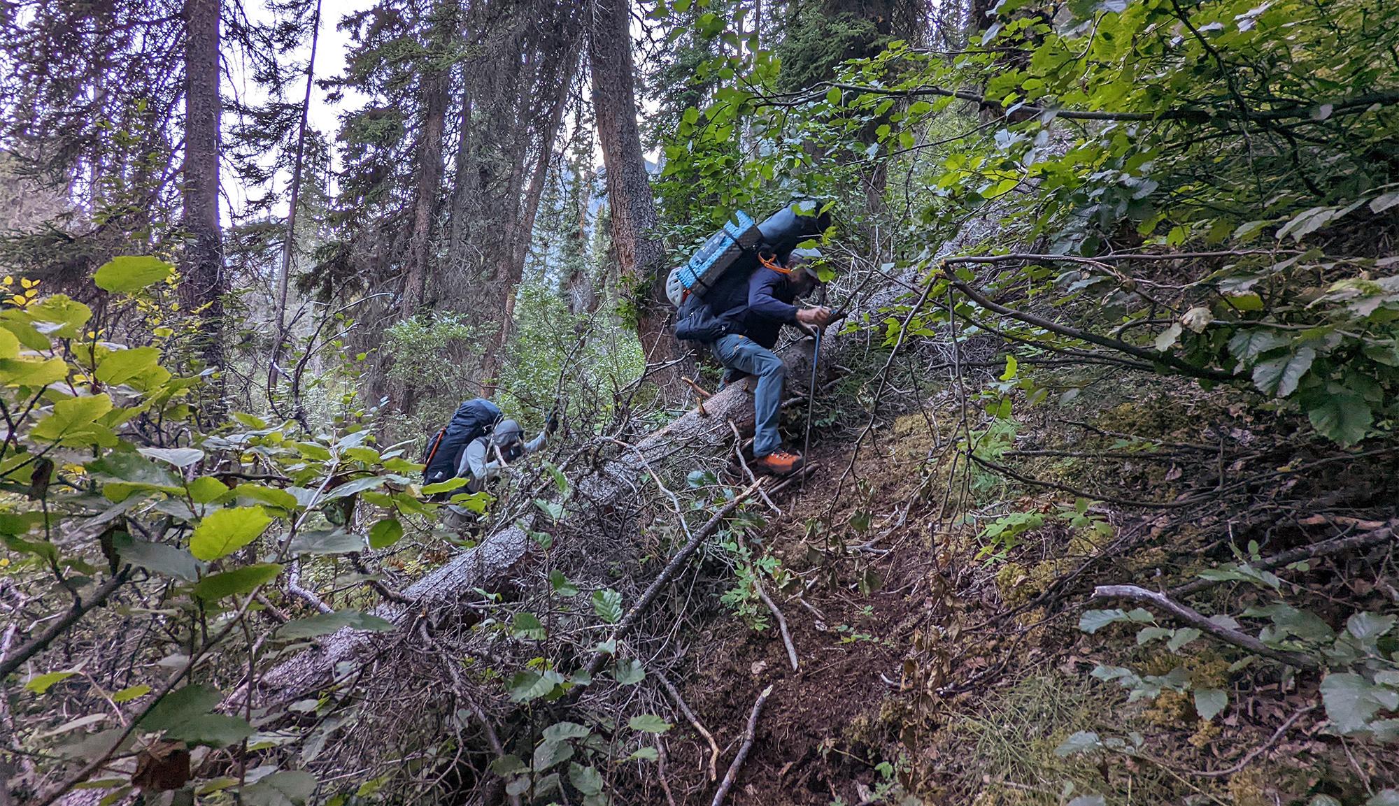 The trail from Glacier Lake to Fairy Meadows was a bit slower compared to 2018. It has regenerated significantly in many areas. The first 2 kms had plenty of recent blowdown forcing regular off trail detours. Tricky with big heavy packs! The Fairy Meadows camp sites, food storage areas, outhouse, as well as the various trails/routes leading to most climbs were mostly snow free and in good shape. Crampons and ice axe were not required for LFT. Mosquitoes were very active during our visit, particularly at lower elevation. Head nets were a blessing. Cooler temps meant less mosquitos at higher elevations.