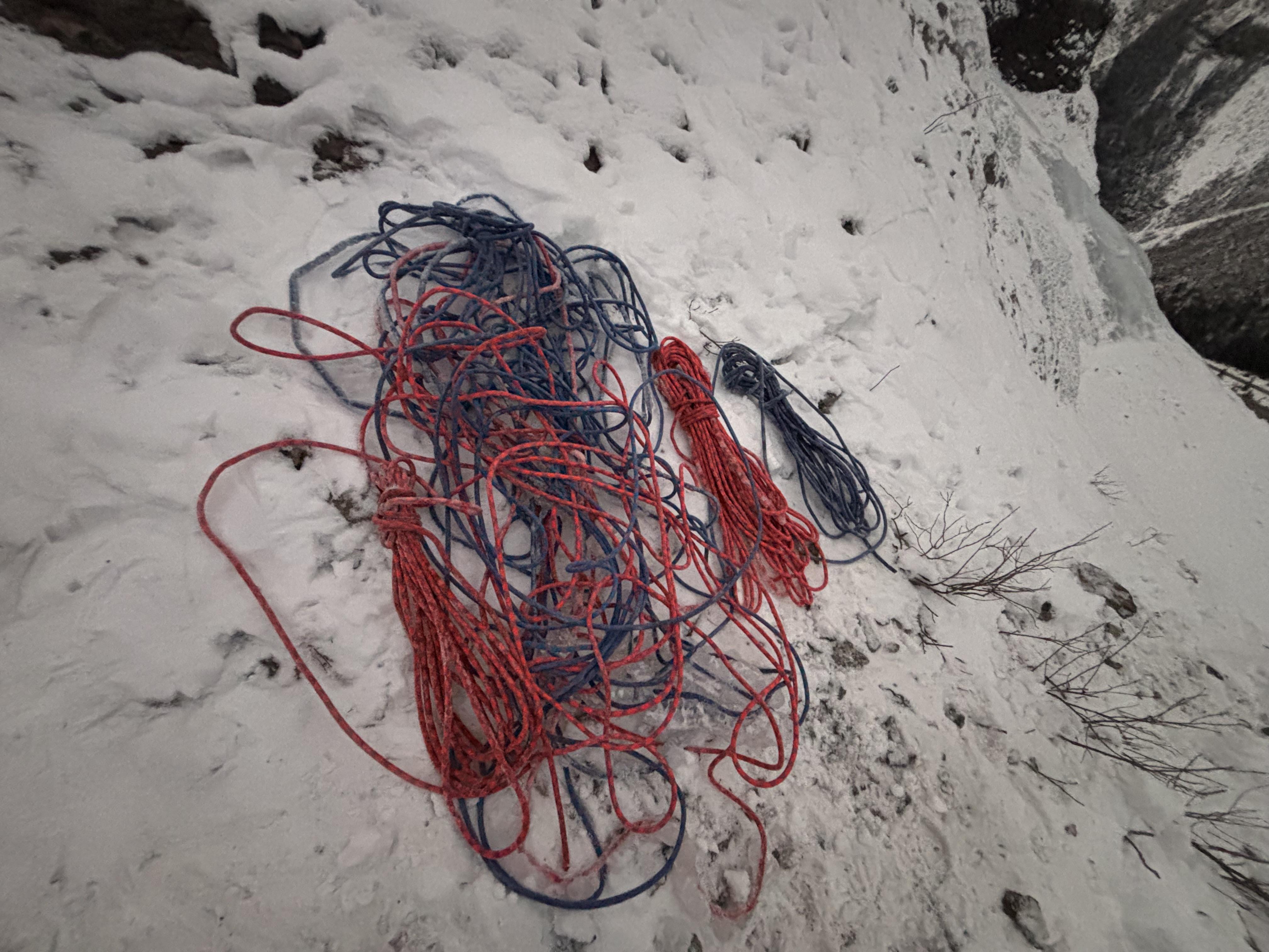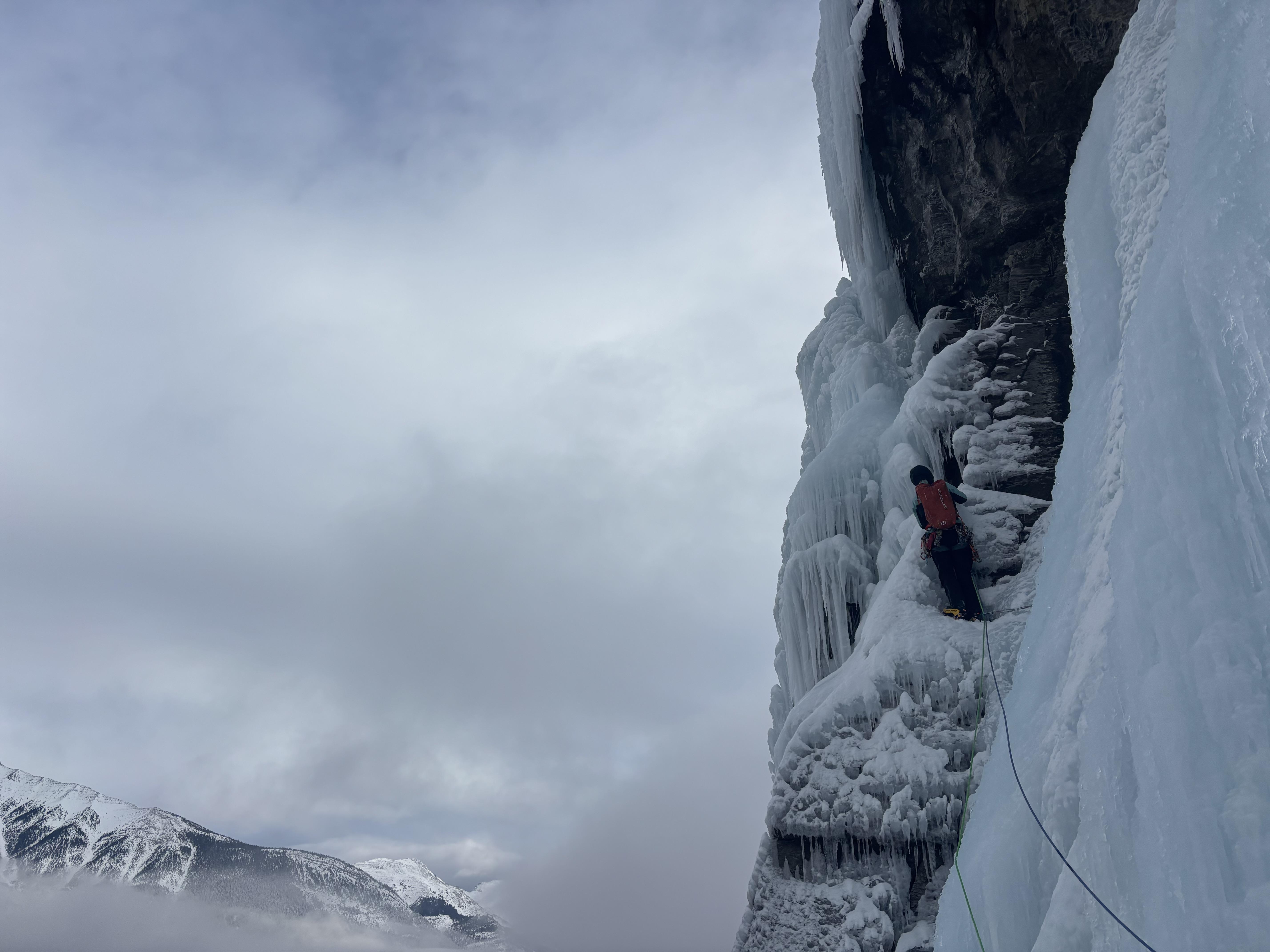 We climbed Twisted today in Field. The route has significantly more ice than in previous years and can be protected entirely with ice screws. The second pitch is ridiculously wet and we would recommend waiting until it cools down before venturing up there. We were on the right side of the climb. The main line looks even more wet. We recovered the two stuck ropes and left them at the base.