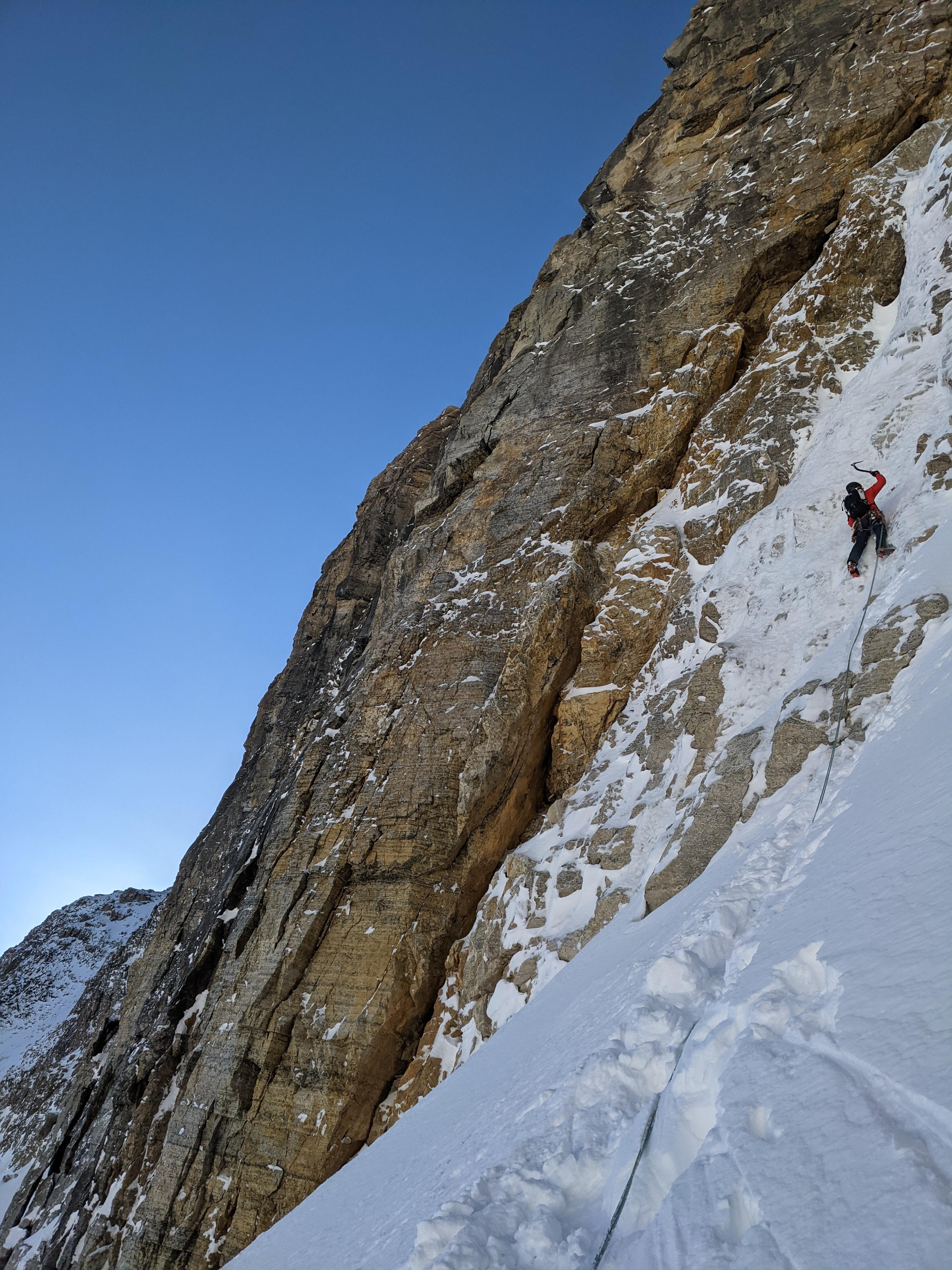 The route itself is likely to become an early season moderate classic, though leaders should be solid at the WI3 M4 grade. After snow reported from a few days ago we found less climbing than reported on the first ascent a week ago. Adequate gear was found on the two crux sections (pitch 1 vertical snice step, pitch 5 leftward trending thin mixed).