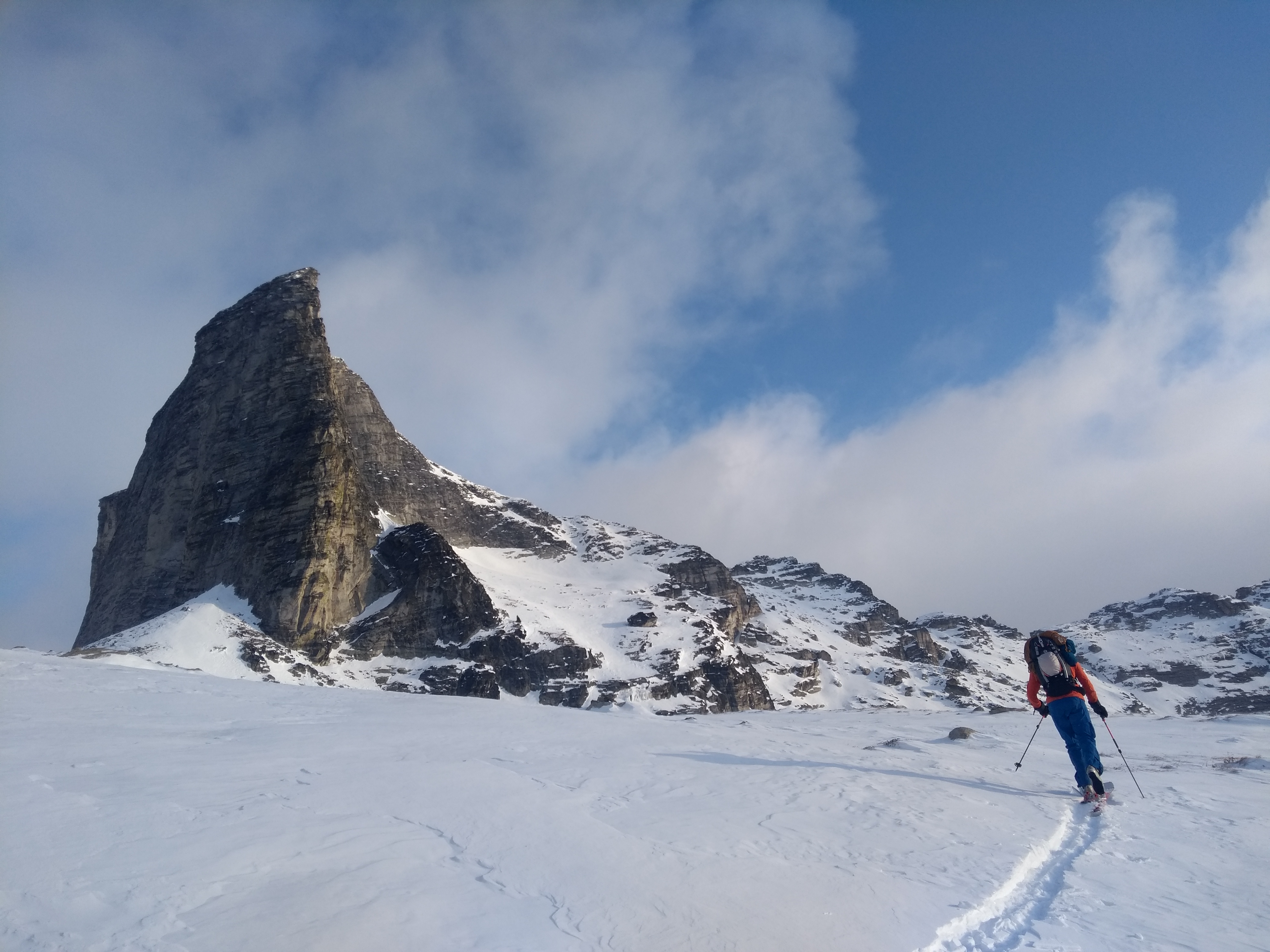 Barely enough snow to ski in the alpine and not enough coverage below that. Walking in uneven snowpack areas of the alpine was tedious with unpredictable post-holing conditions. The mixed line we were interested in prove too thin an unprotectable, hence why we bailed on pitch 2.